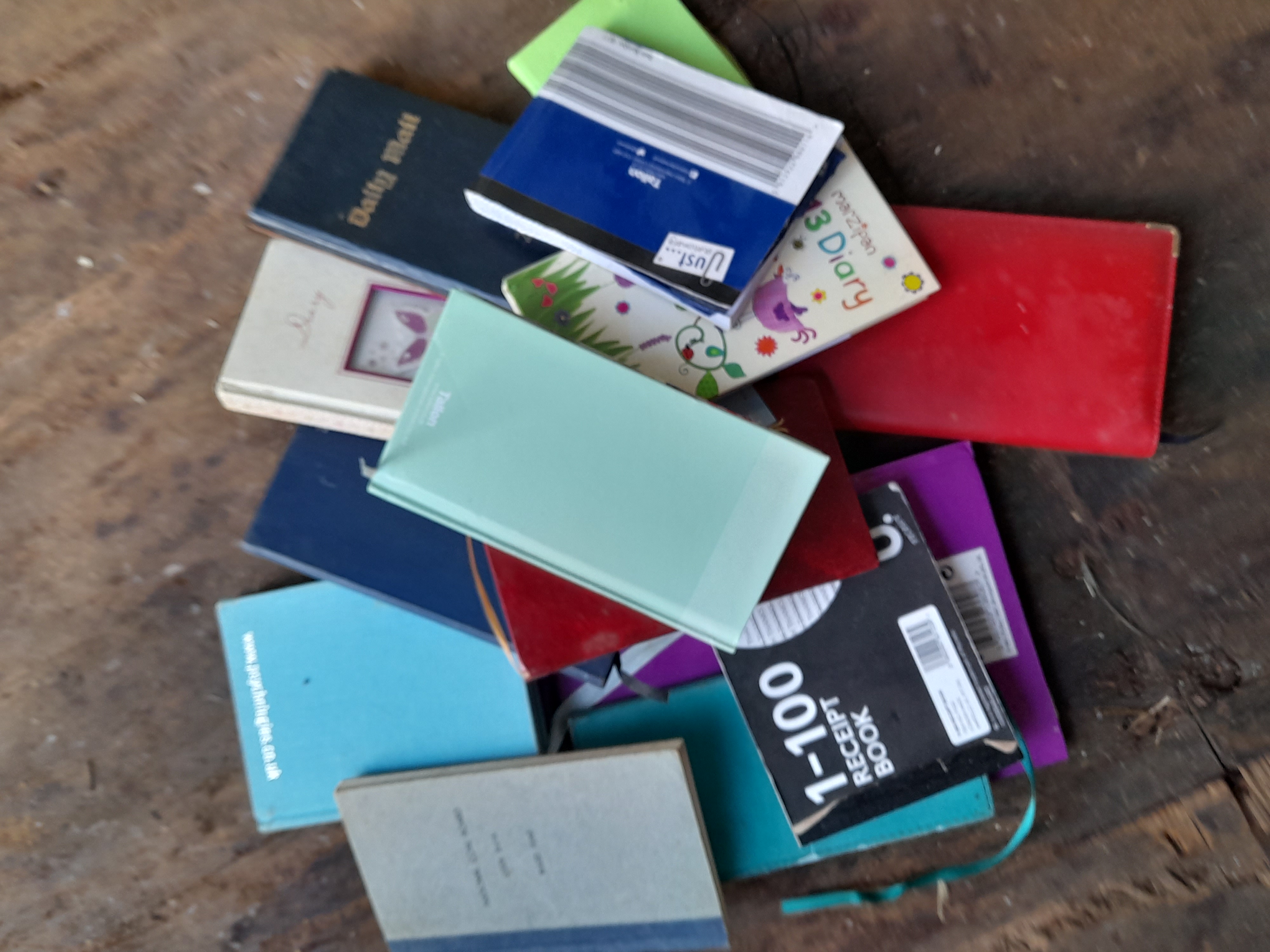 A collection of pocket-sized notebooks and diaries in various colours and styles, including examples from Tallon, Daily Mail, and the National Coal Board.