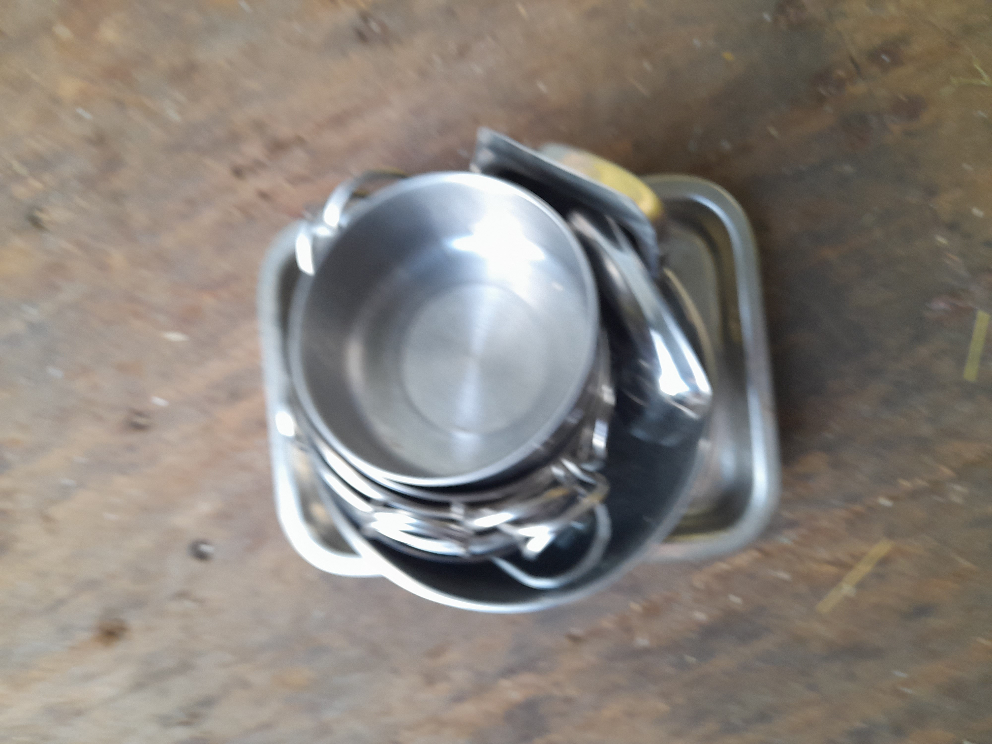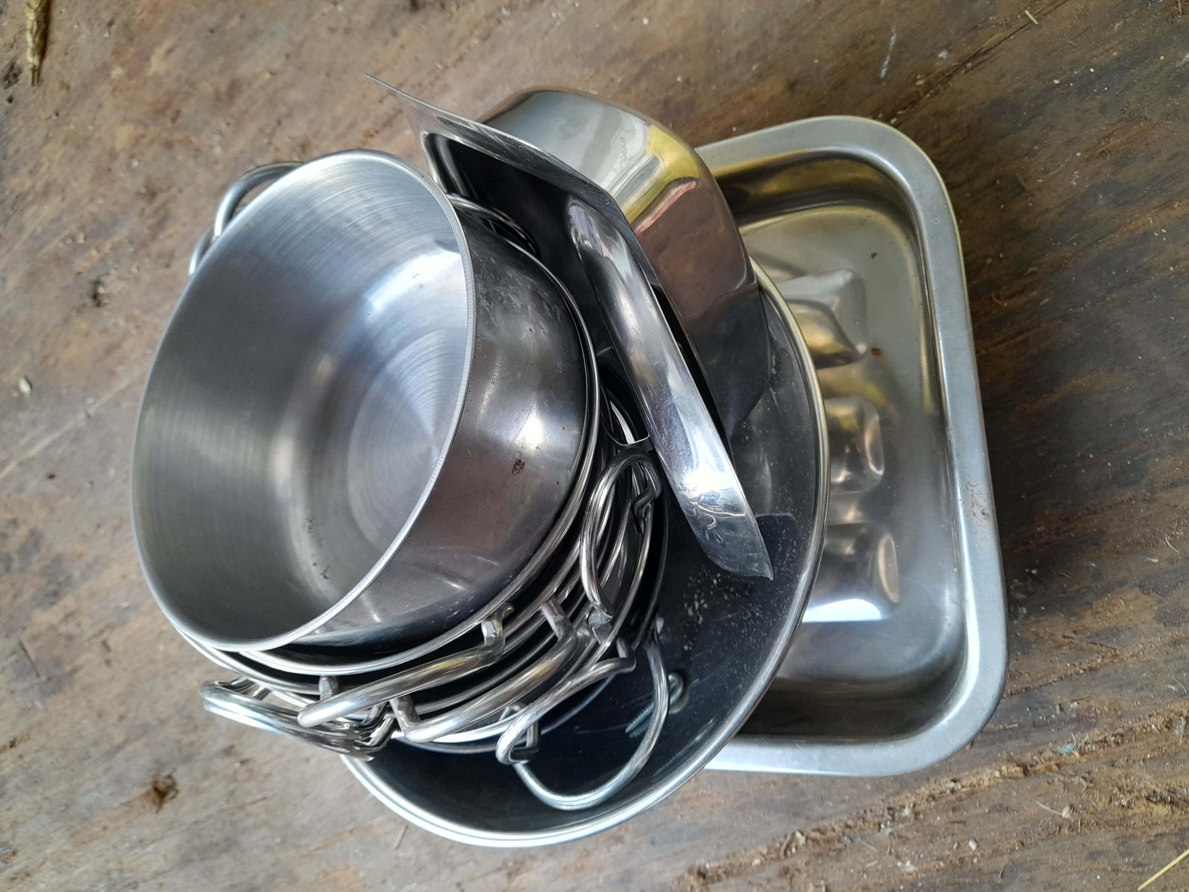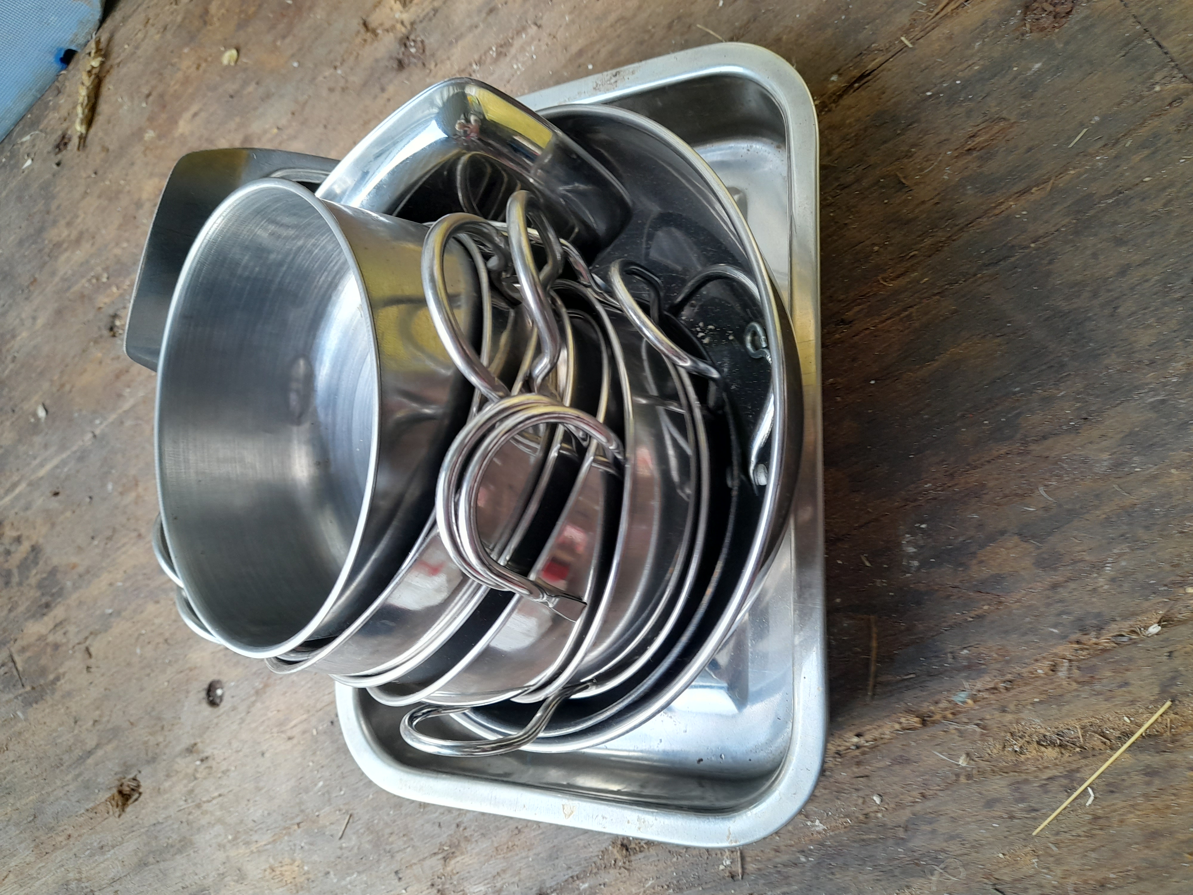 A collection of silver-coloured metal bowls of varying sizes, some featuring twin handles, presented on a rectangular metal tray.