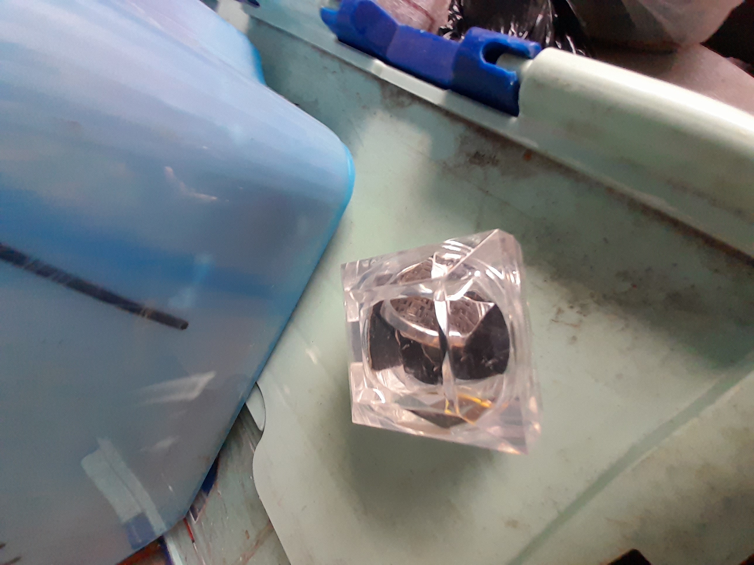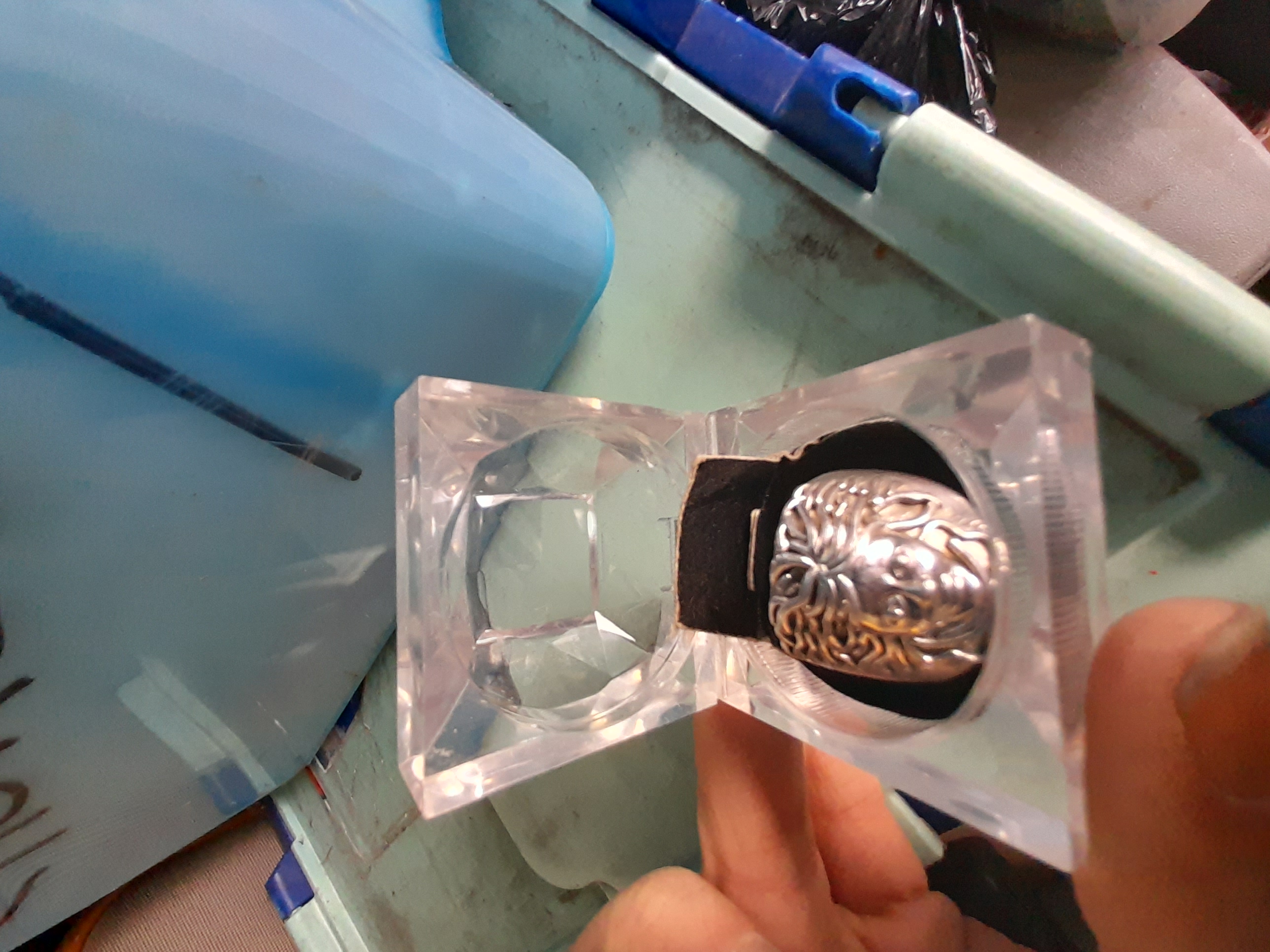 A silver-coloured ornate ring featuring a stylized face design, presented within a clear faceted plastic display case.