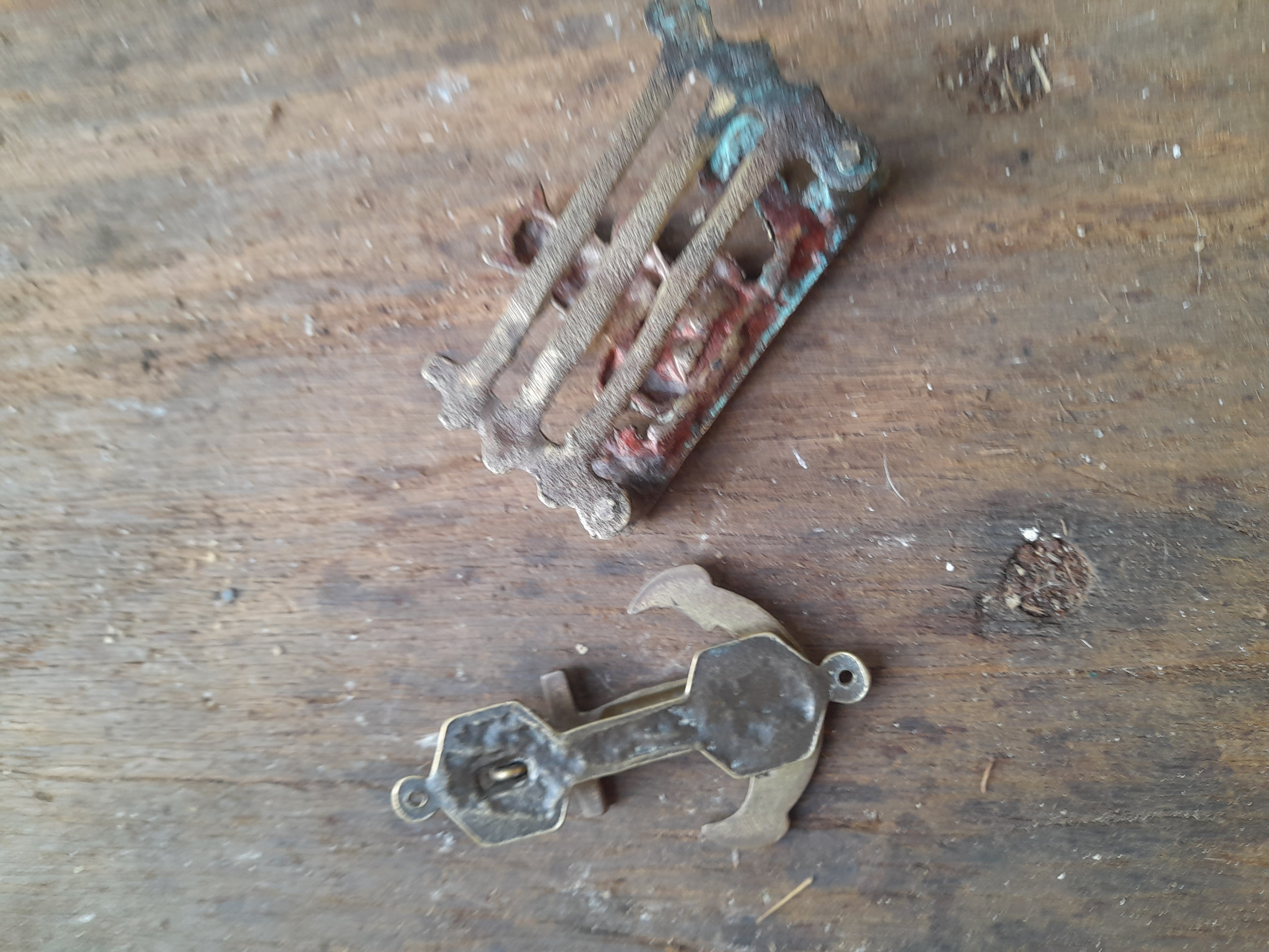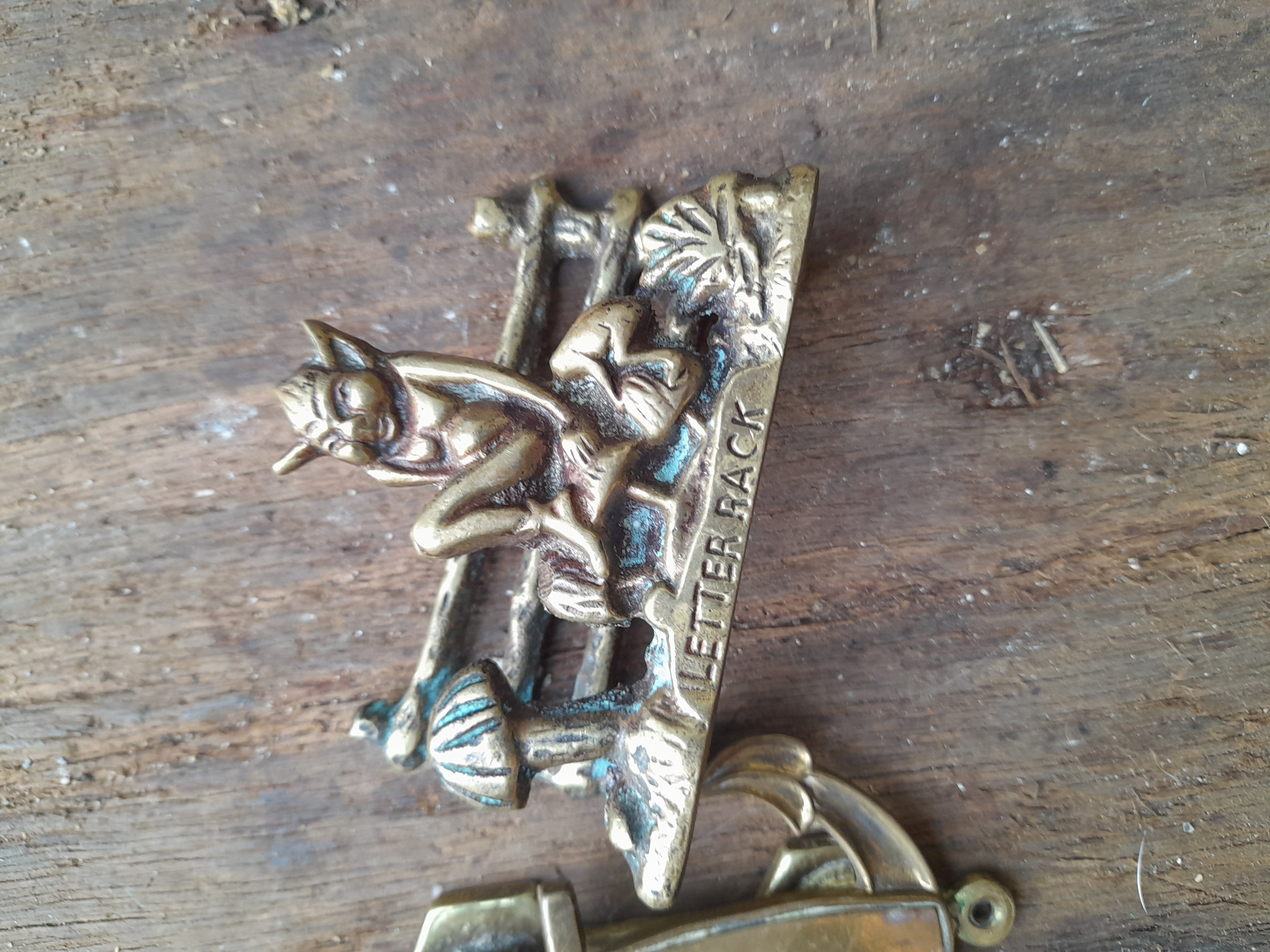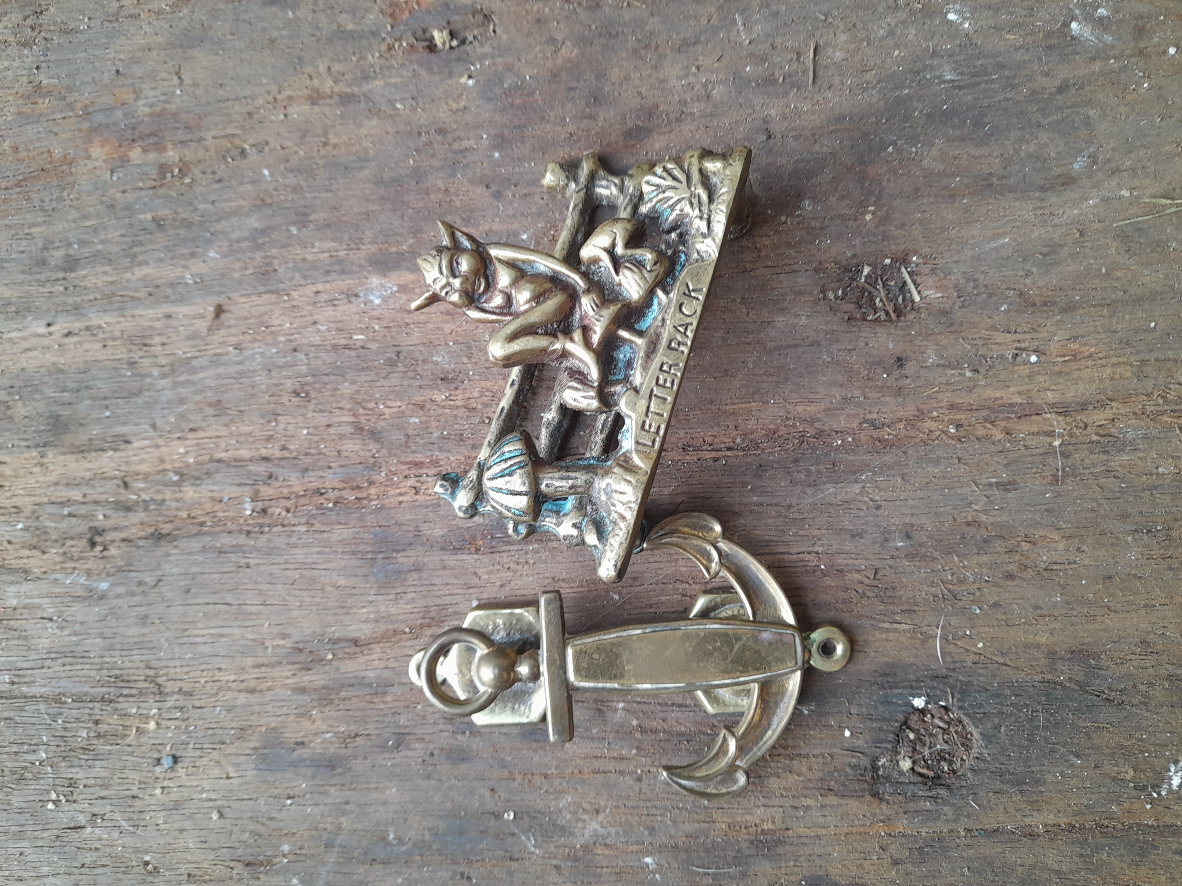 A brass-coloured anchor-shaped door knocker and a brass-coloured figurine depicting a pixie on a fence inscribed with LETTER RACK.