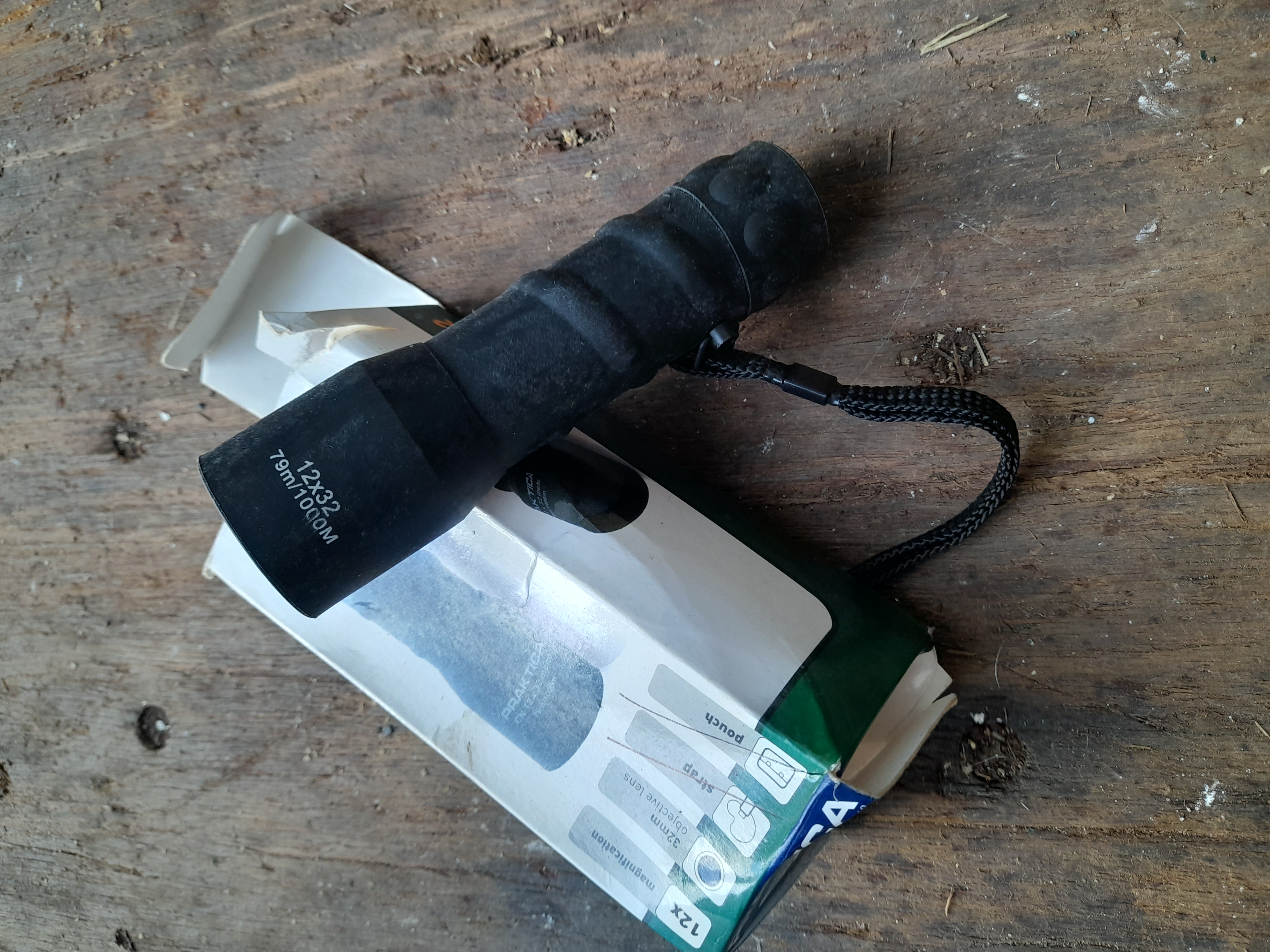 A black Praktica CX 12×32 monocular featuring a wrist strap and markings of 79m/1000M, presented with its original cardboard box.