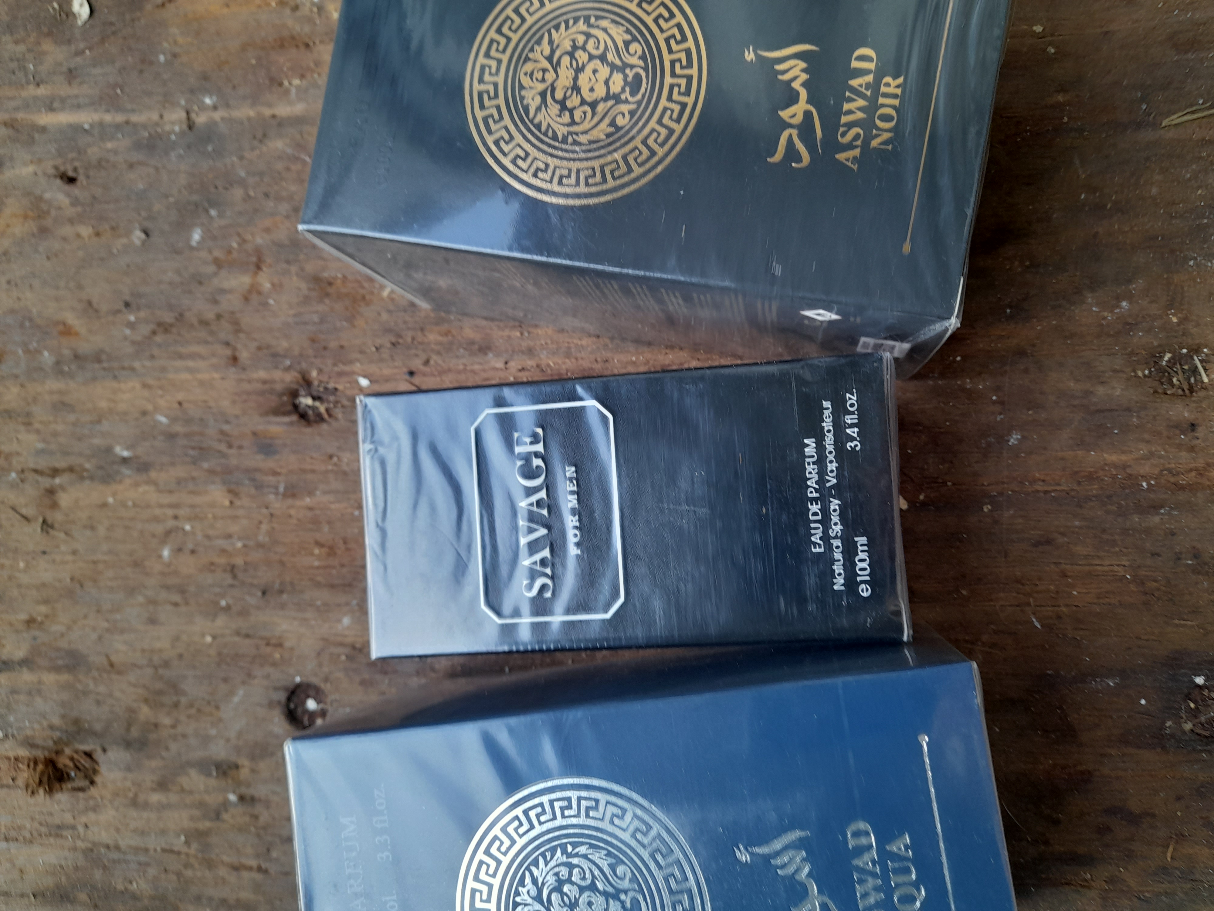 A trio of boxed 100ml eau de parfum fragrances including Aswad Noir, Savage For Men, and Aswad Aqua, all presented in original sealed packaging.