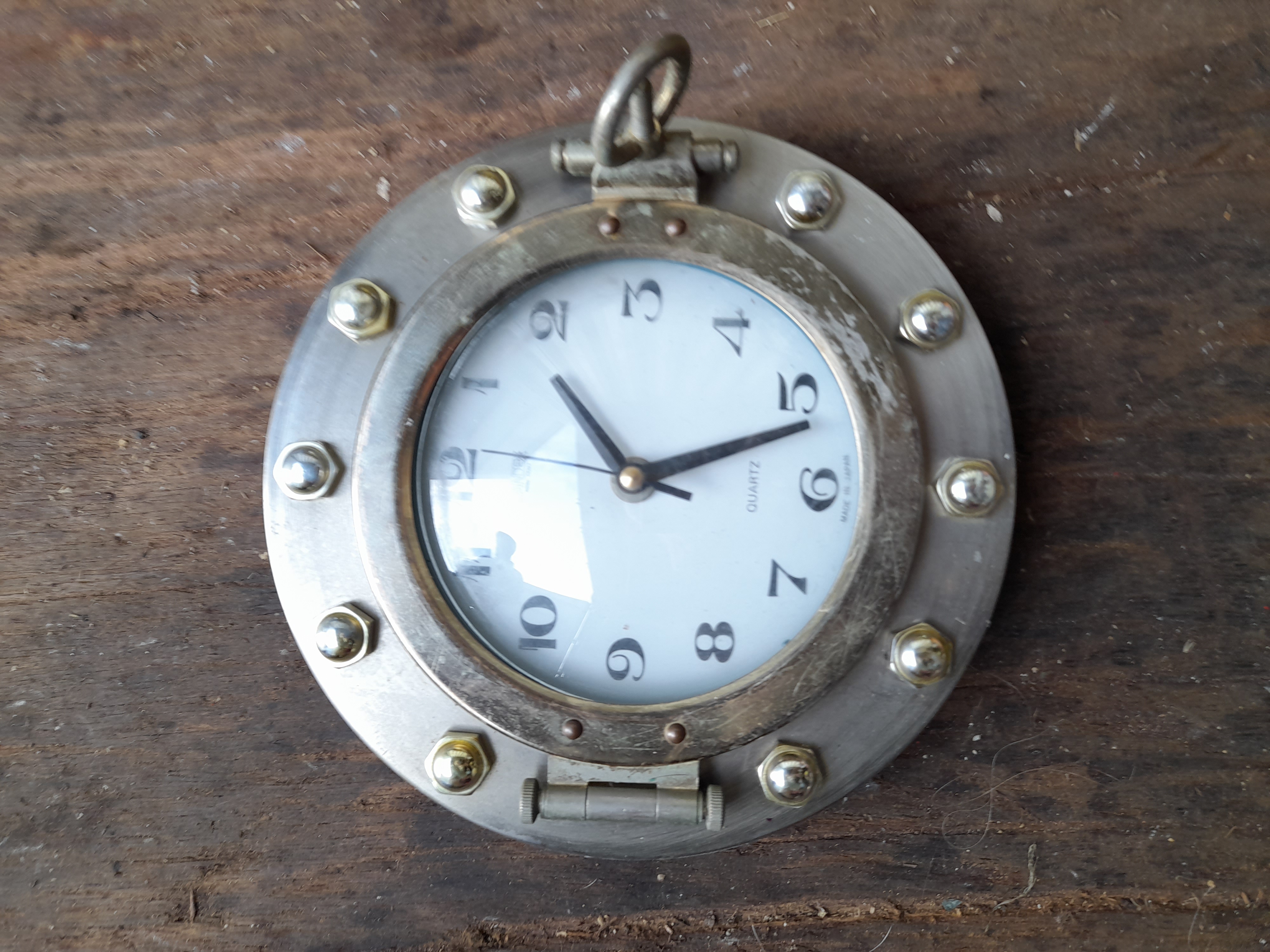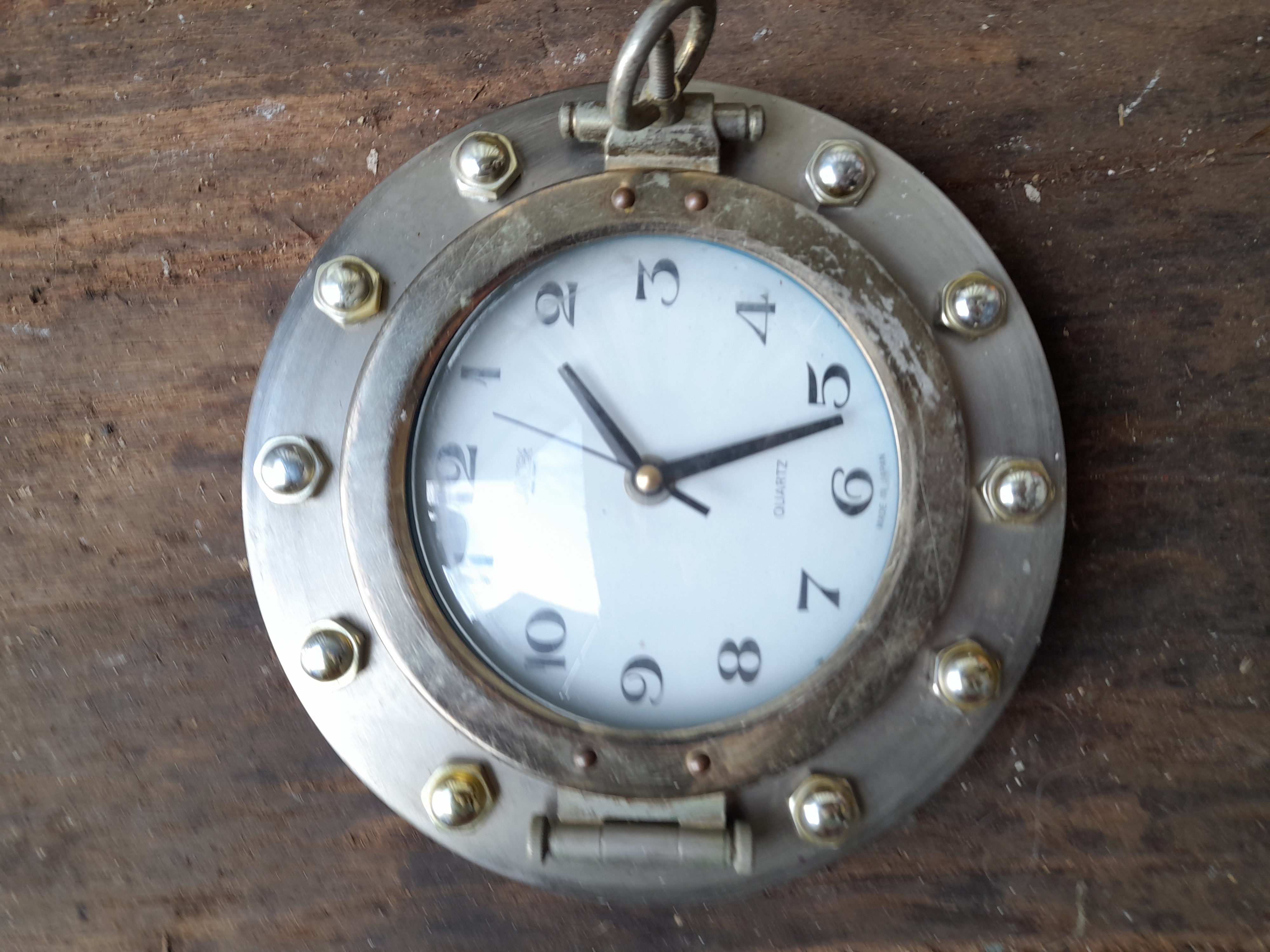 A silver and gold-toned porthole-style wall clock featuring a white face with black Arabic numerals, marked Quartz and Made in Japan.