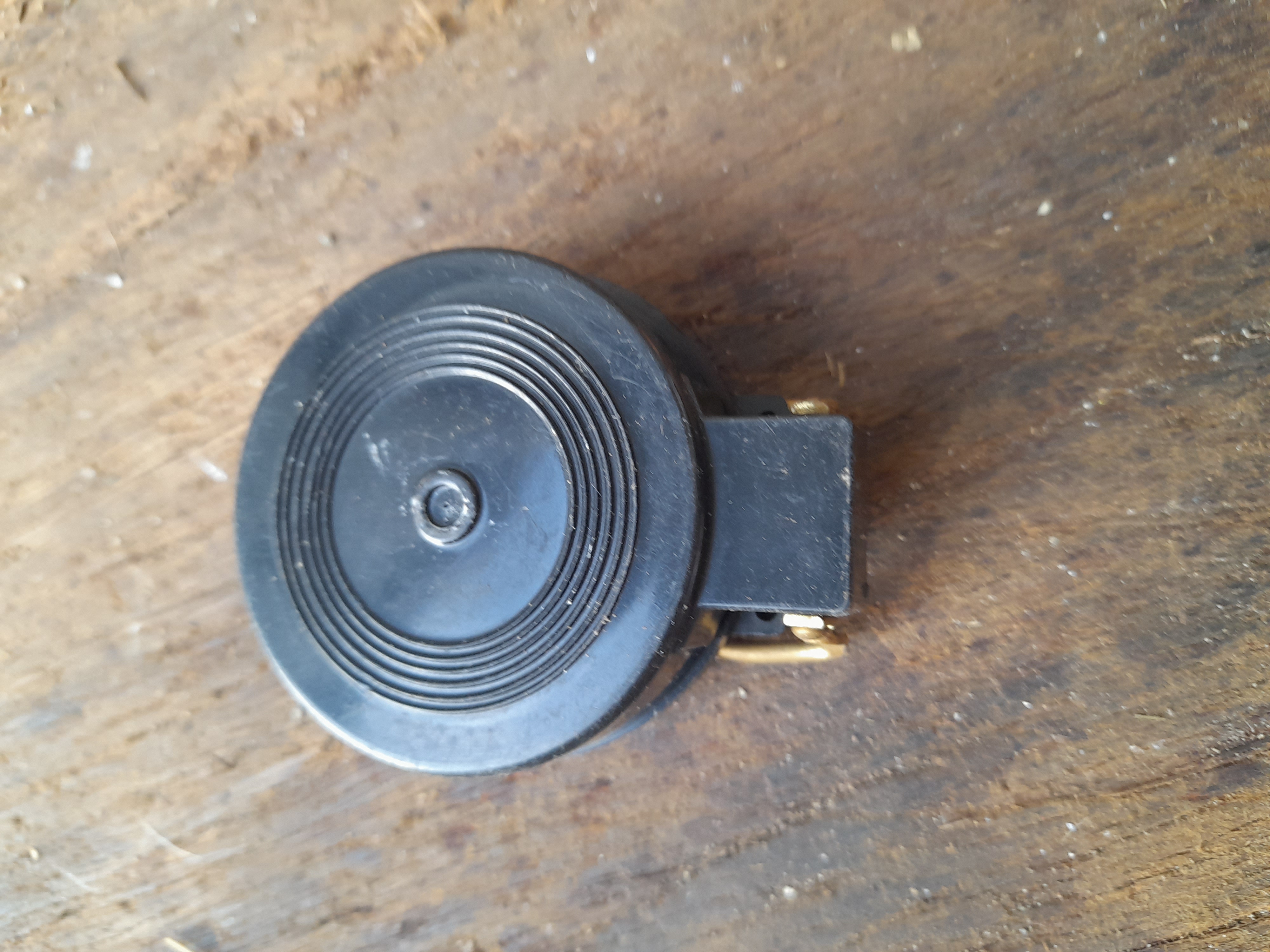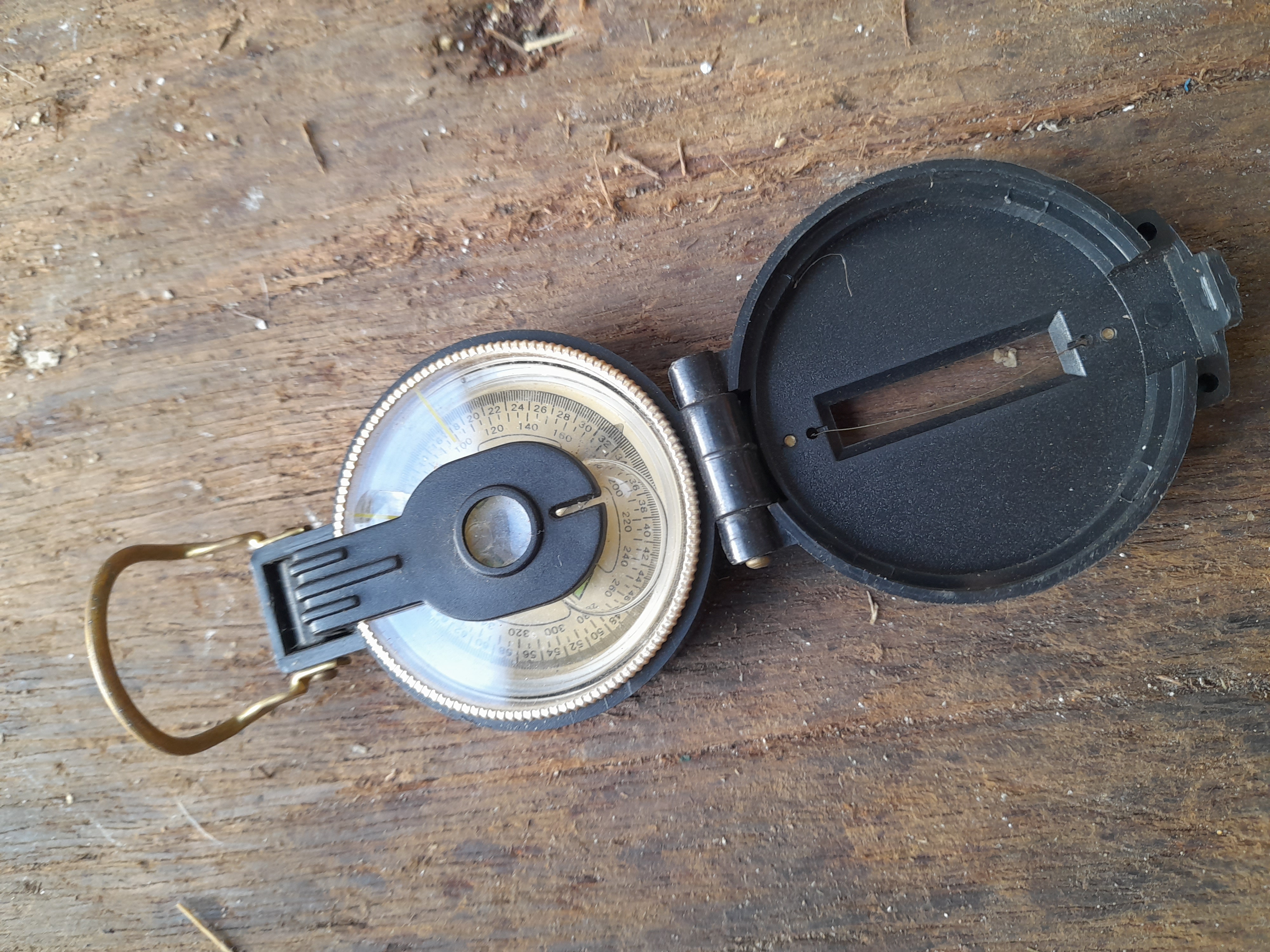 A black lensatic engineer directional compass featuring a brass-coloured metal thumb loop and a white dial with numeric degree and mil markings.