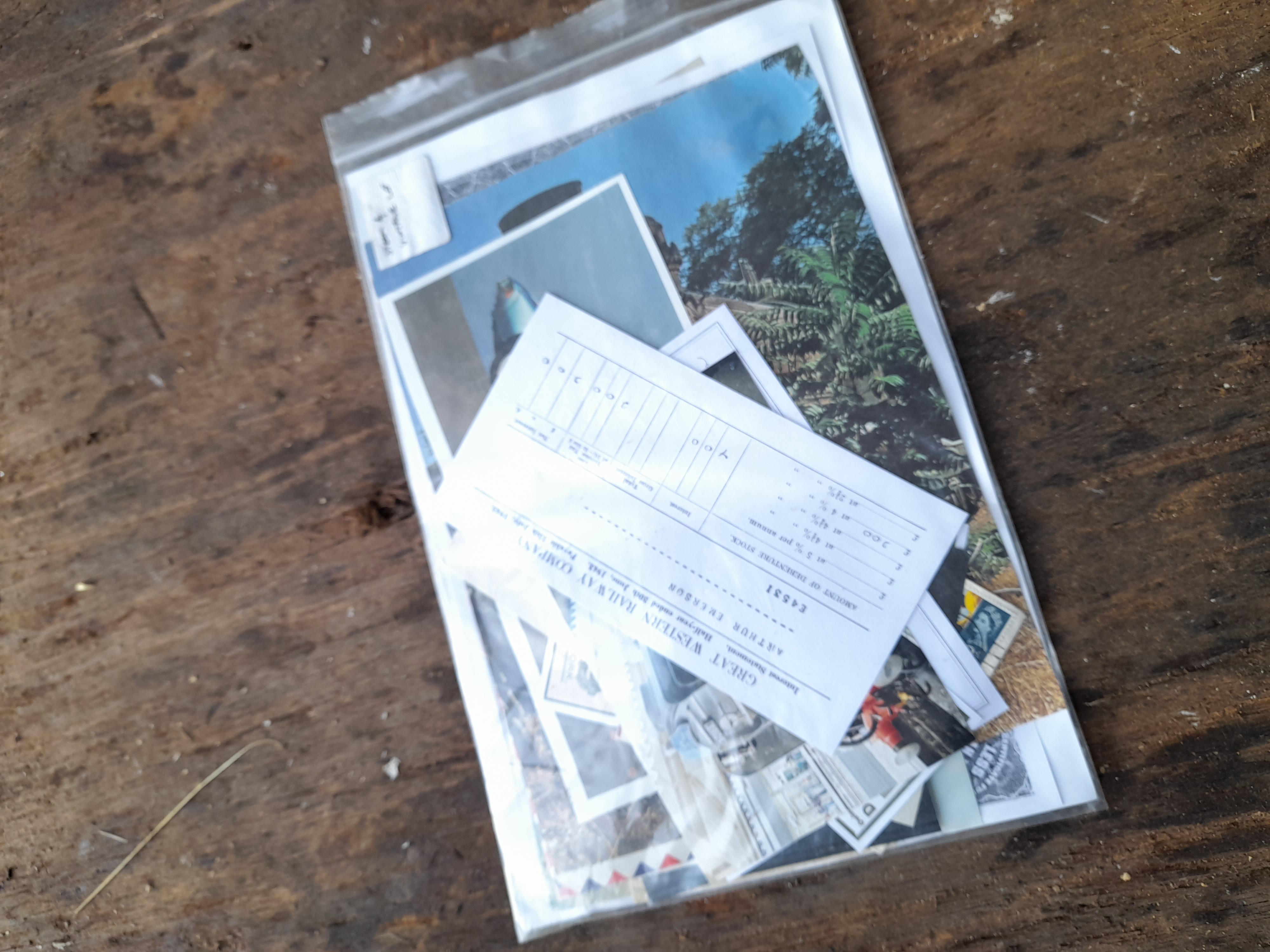 A collection of vintage paper ephemera including a Great Western Railway Company interest statement and various printed materials.
