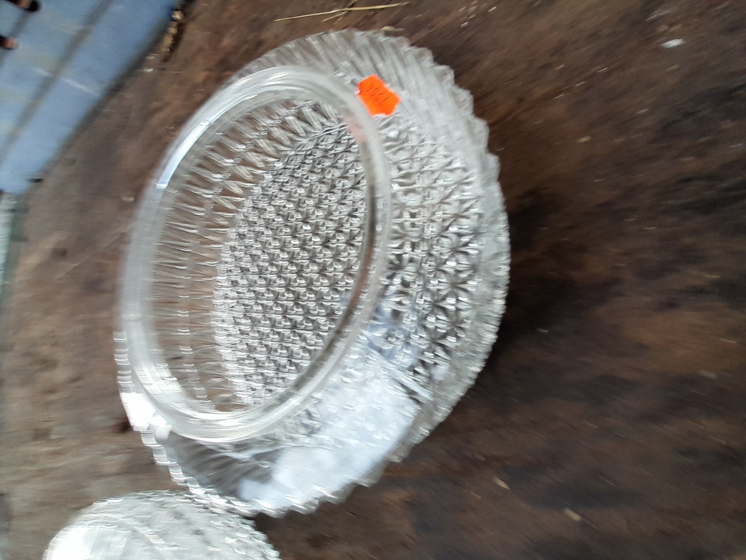 A collection of clear pressed glass dishes featuring intricate geometric and diamond-point textured patterns throughout.