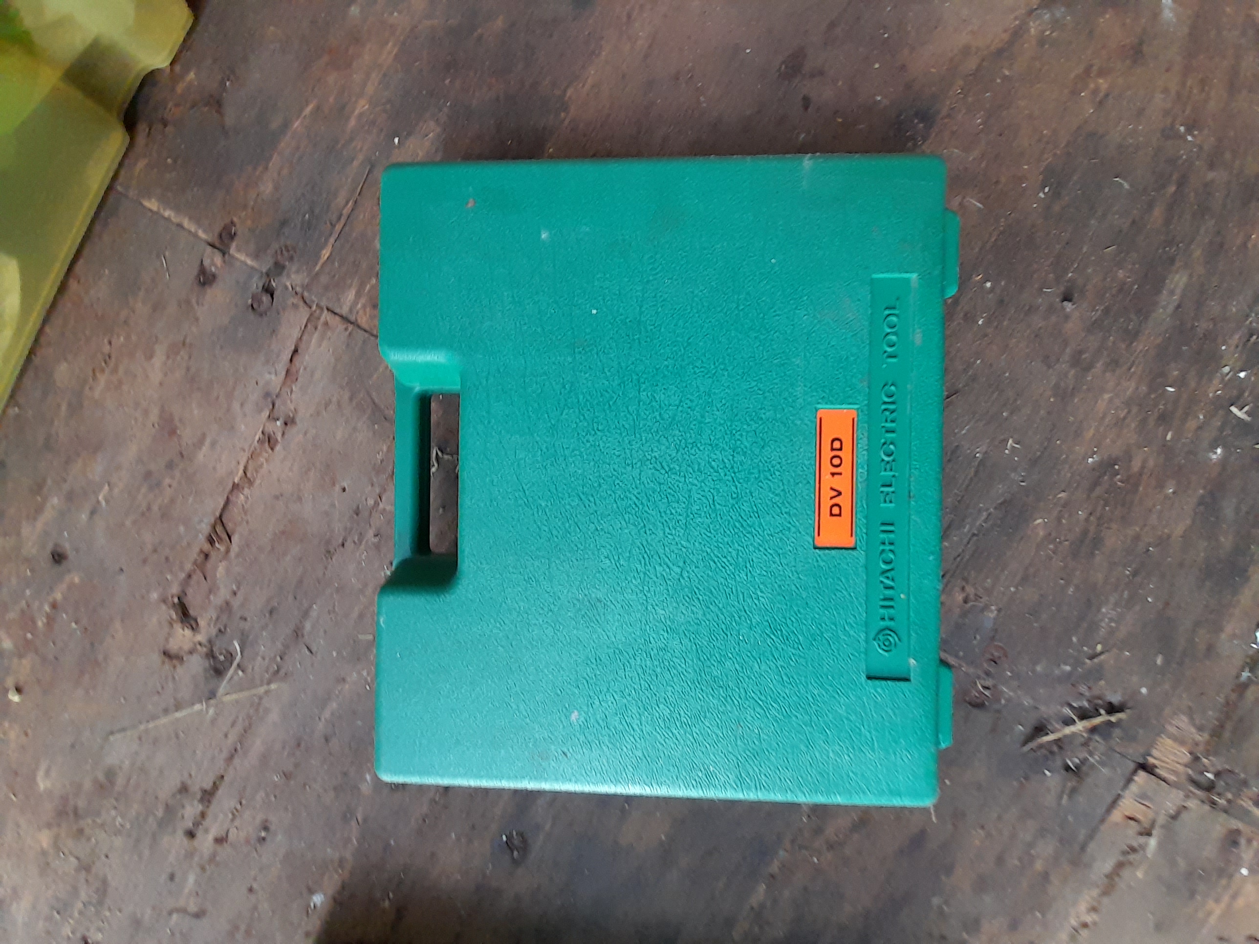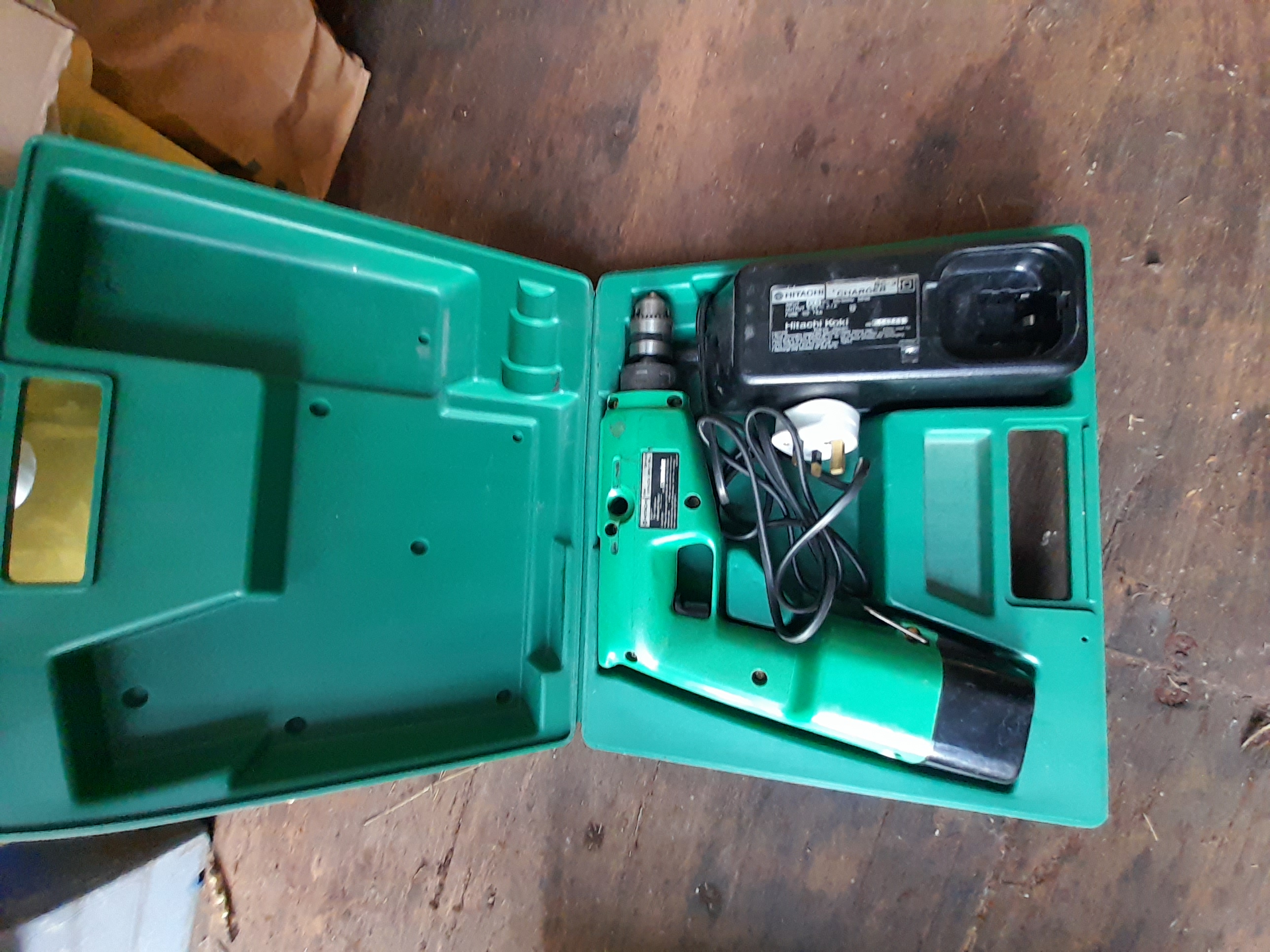 A green Hitachi DV 10D cordless drill set including a black Hitachi Koki charger housed within a green hard plastic carrying case.