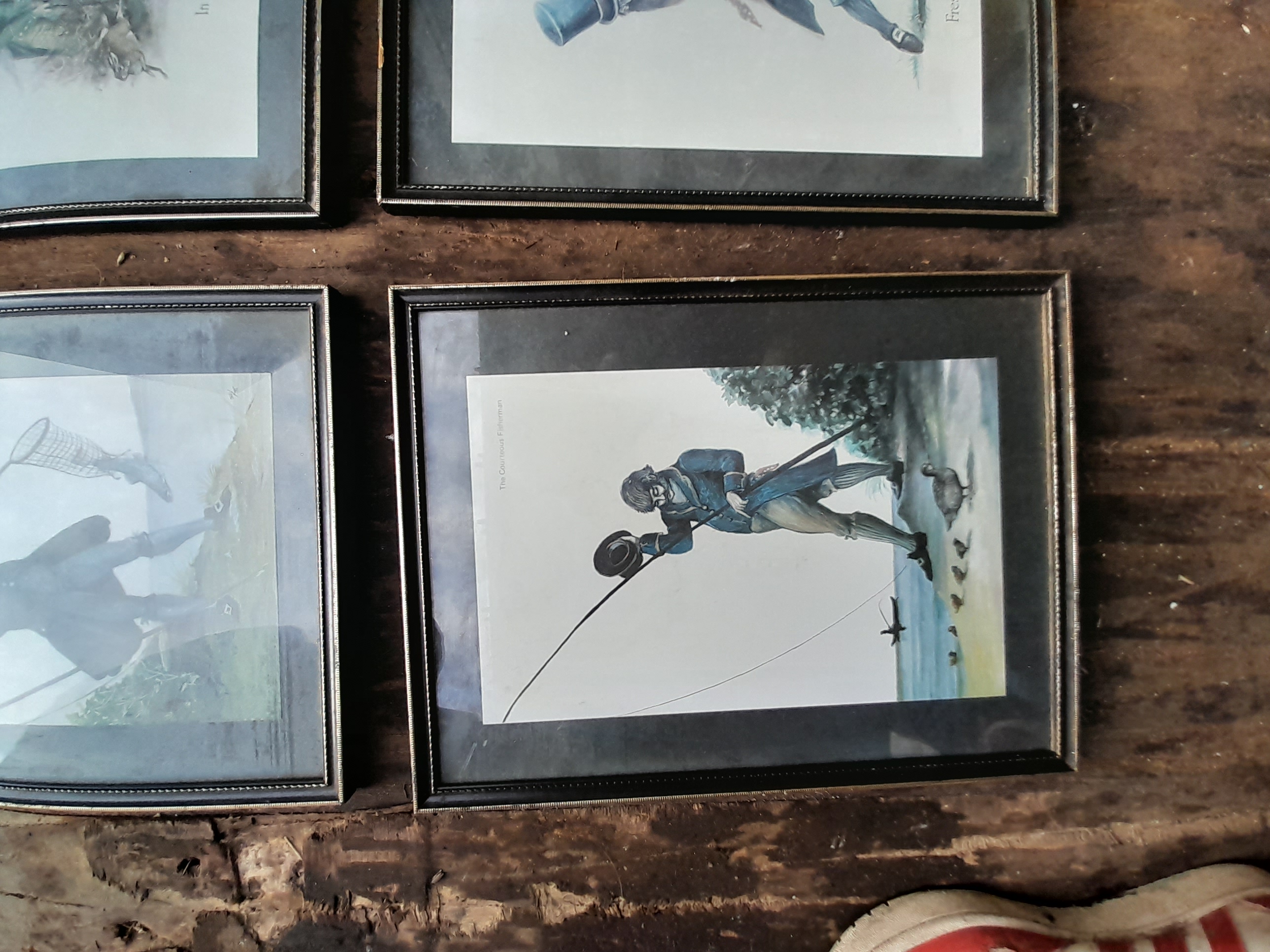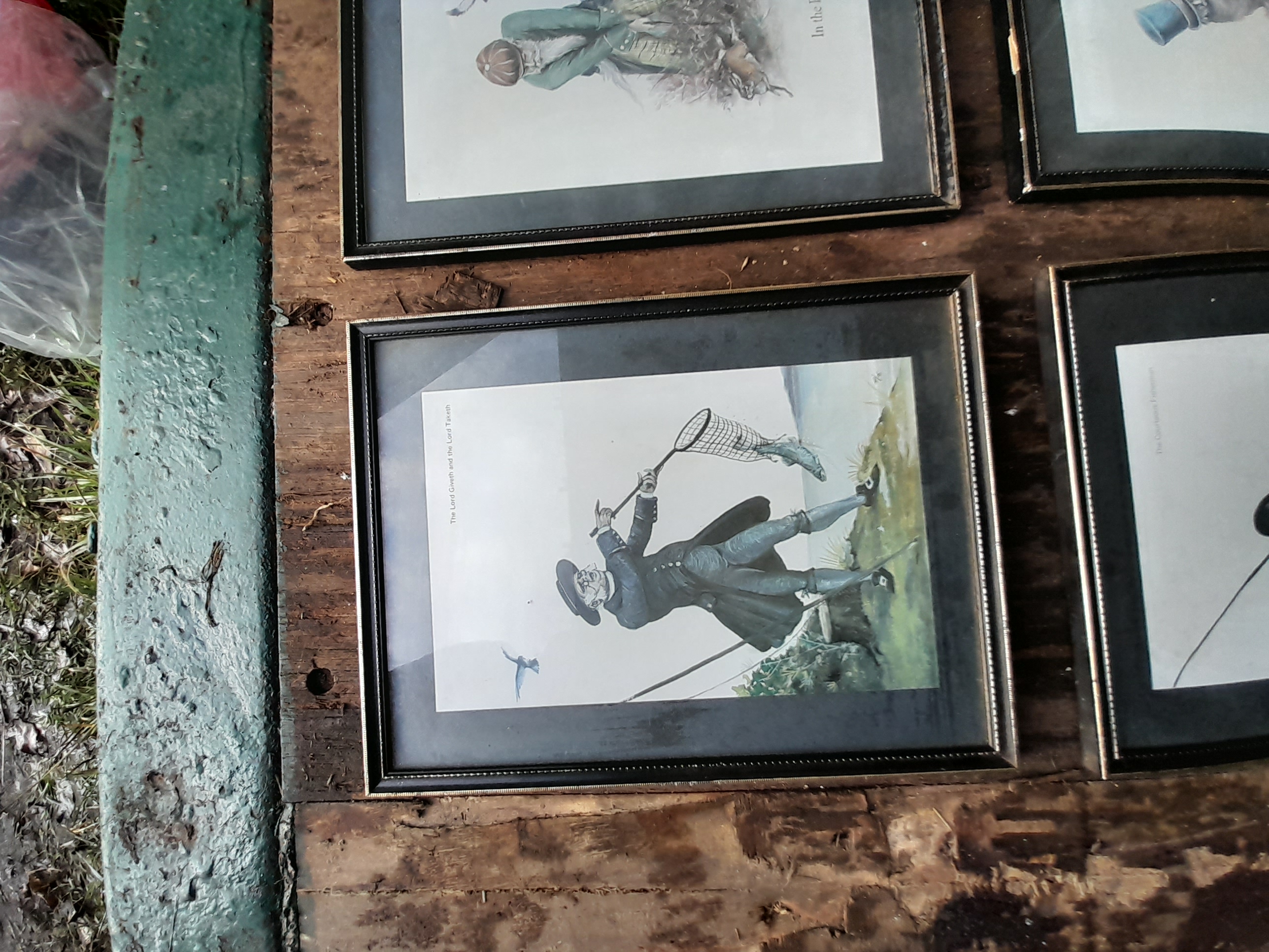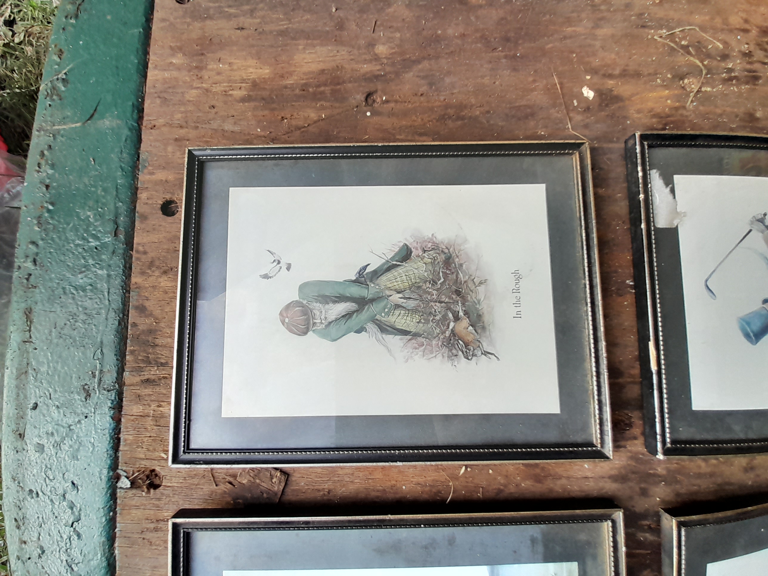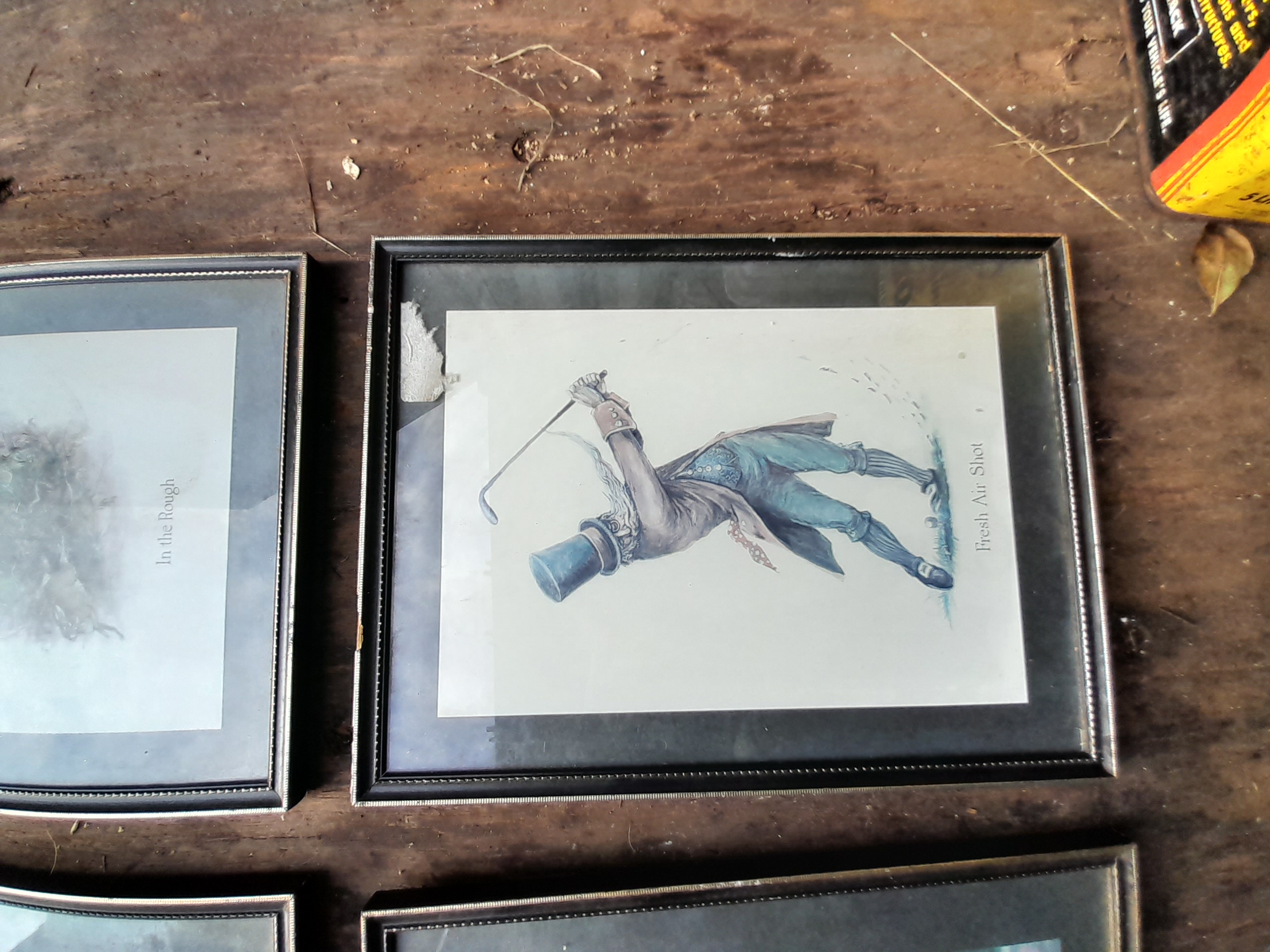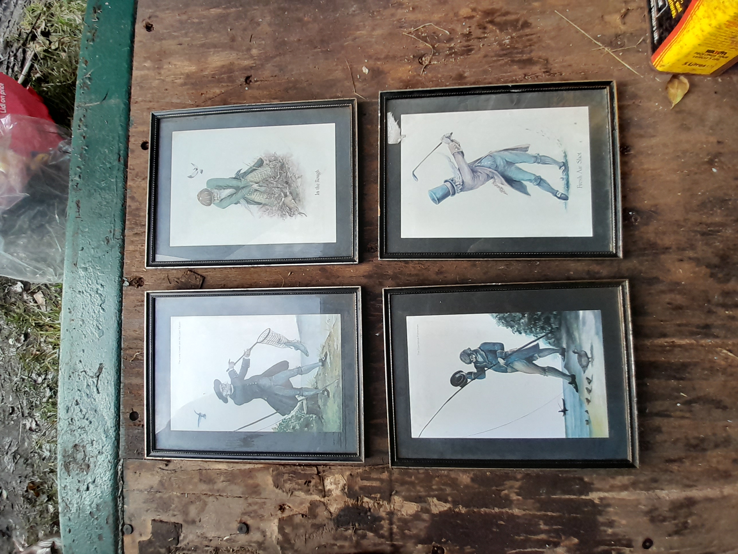 A collection of four framed multi-coloured prints by Norman Orr depicting humorous period-style sporting scenes titled In the Rough, Fresh Air Shot, The Lord Giveth and the Lord Taketh, and The Courteous Fisherman.