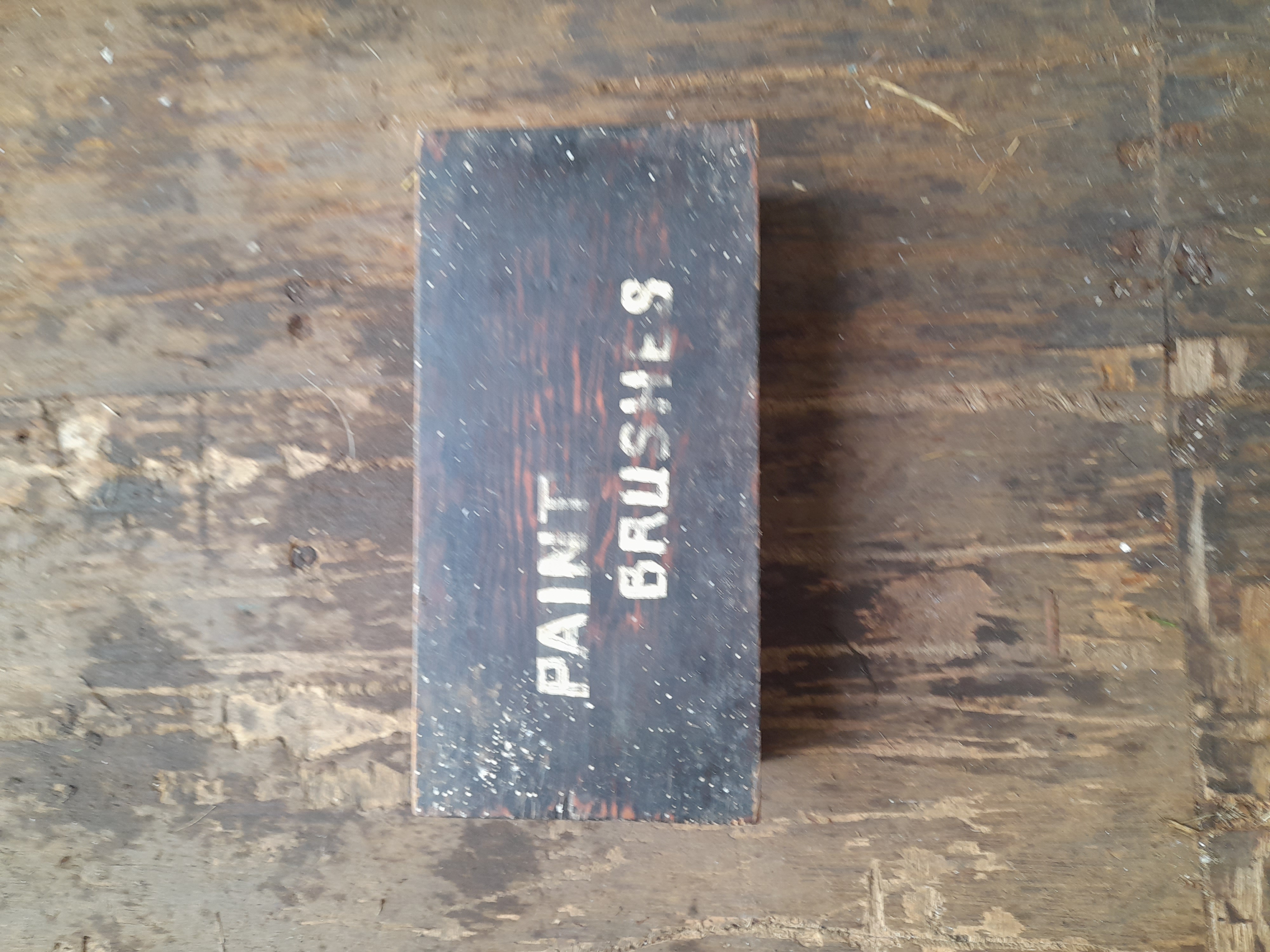 A dark-coloured wooden storage box featuring a stencilled white PAINT BRUSHES label on the lid and a compartmentalised reddish-brown interior.