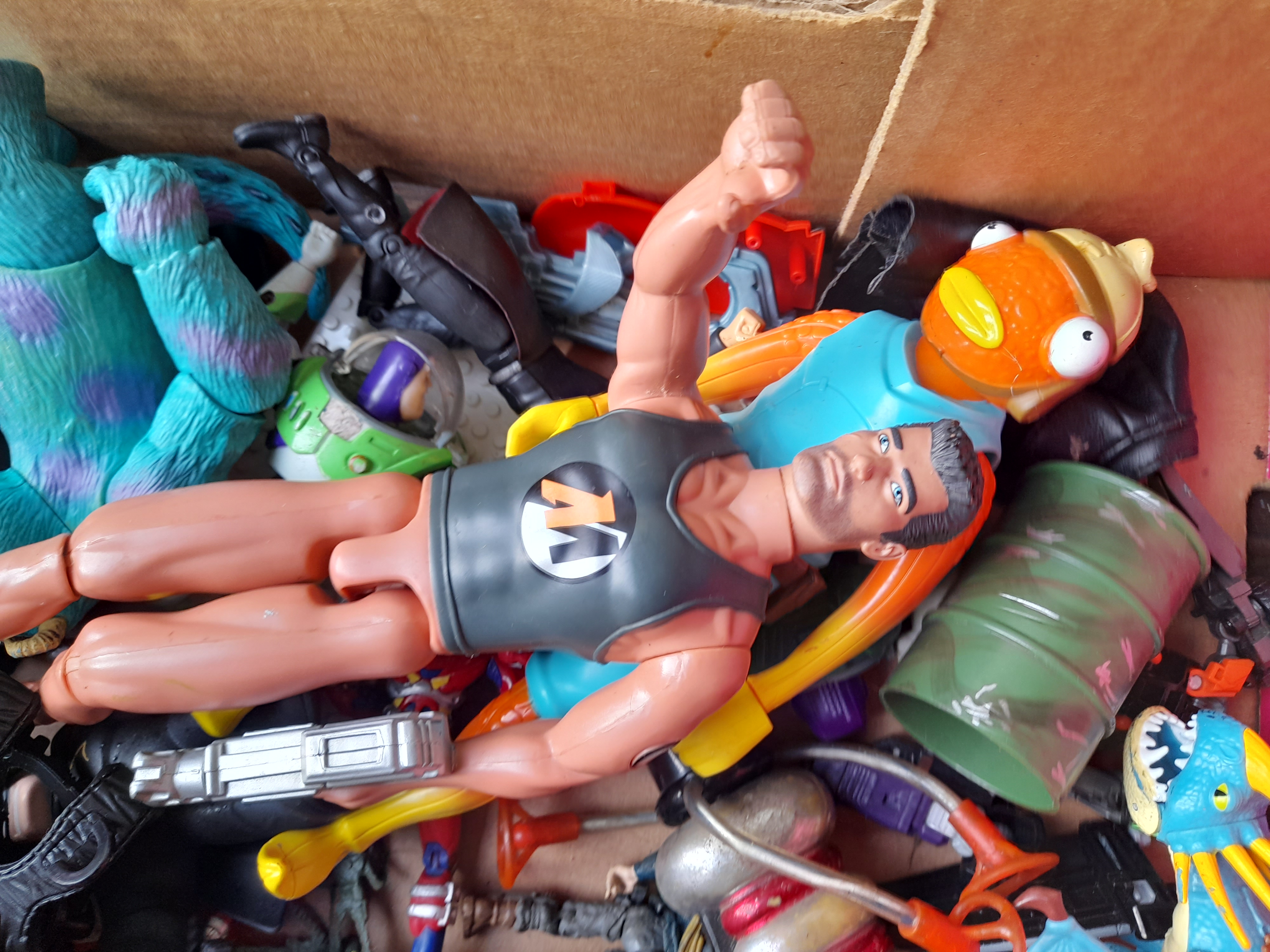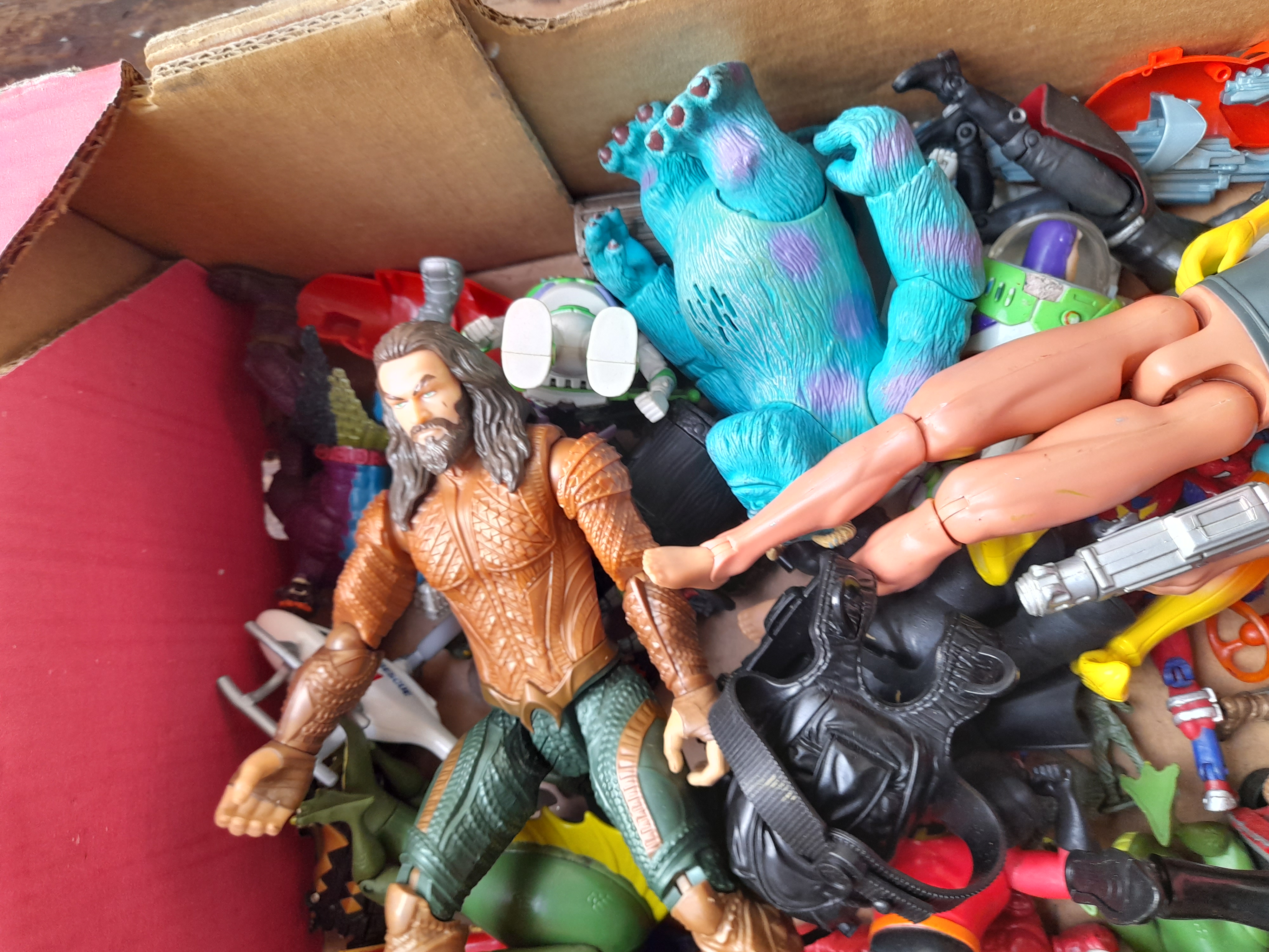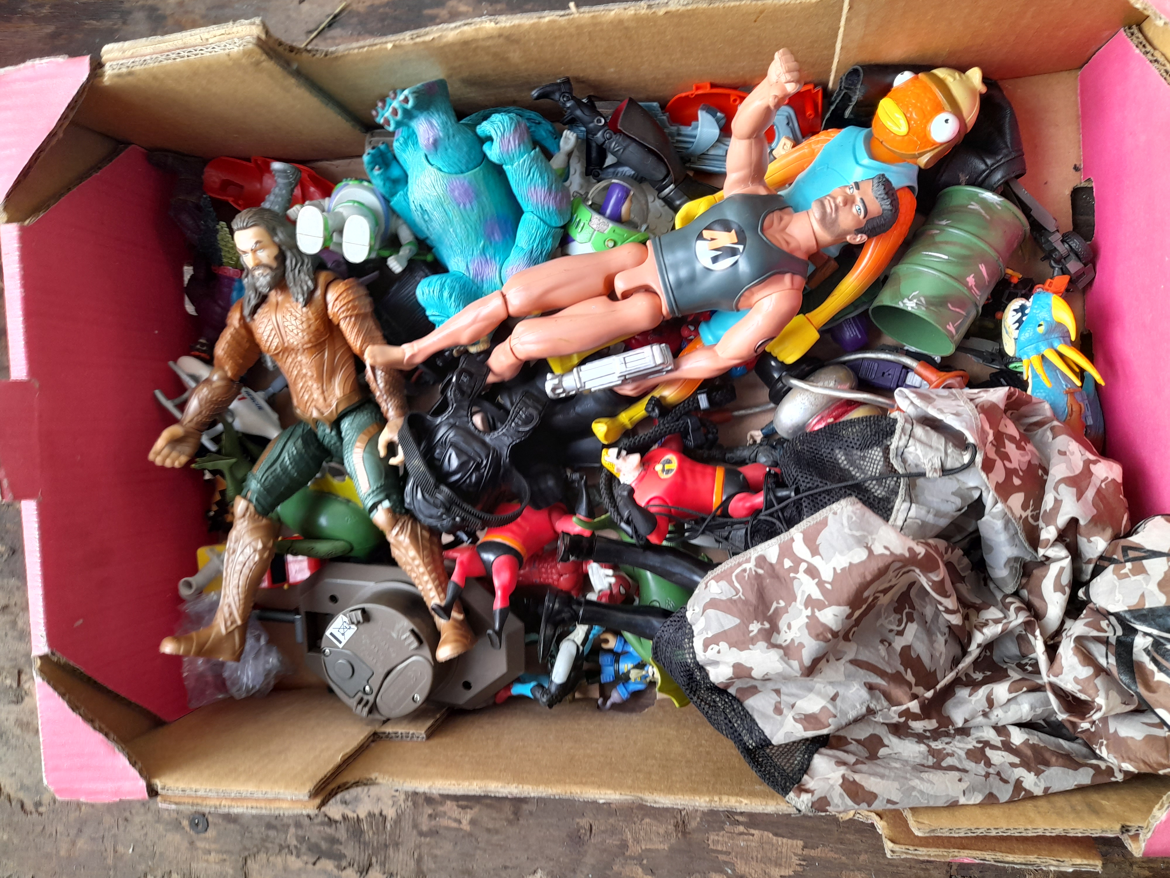 A collection of various plastic action figures including characters such as Aquaman, Sulley, Fishstick, and Max Steel, alongside assorted accessories and play pieces.