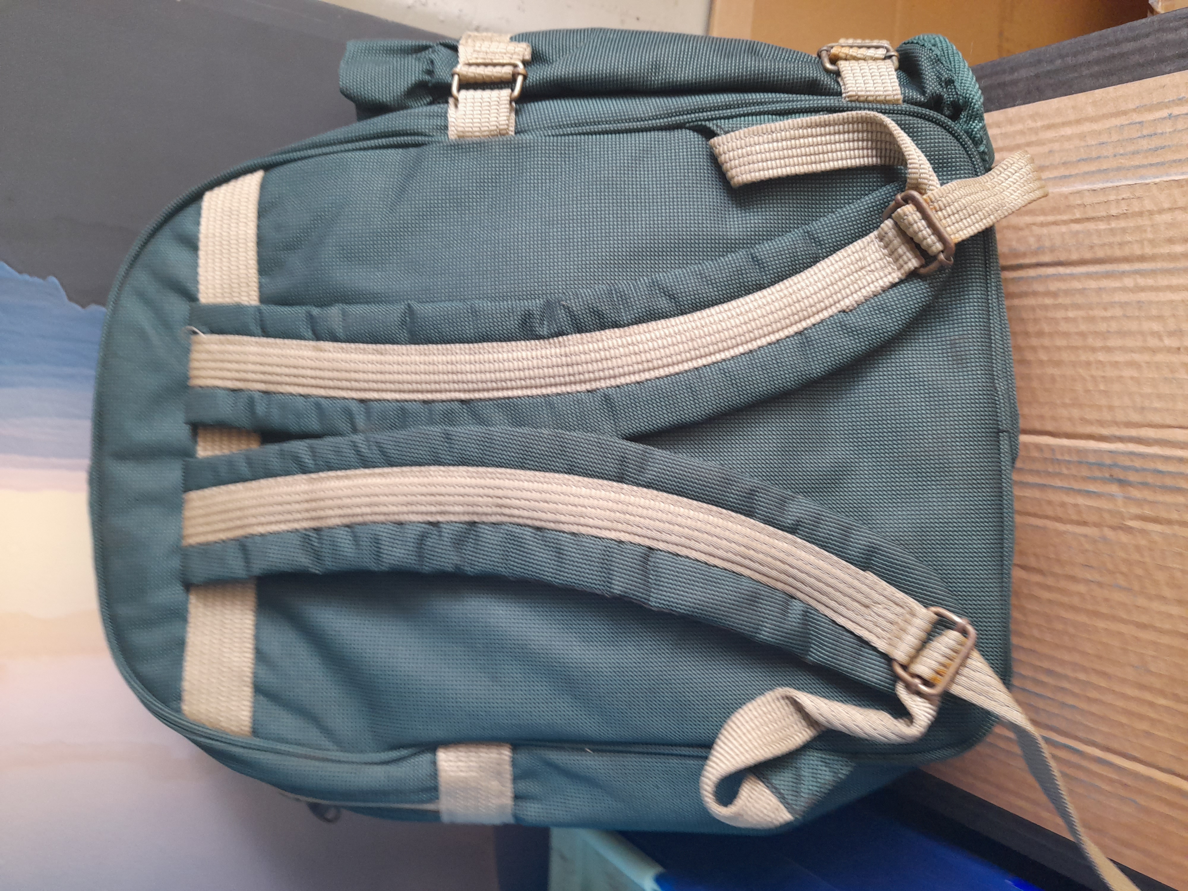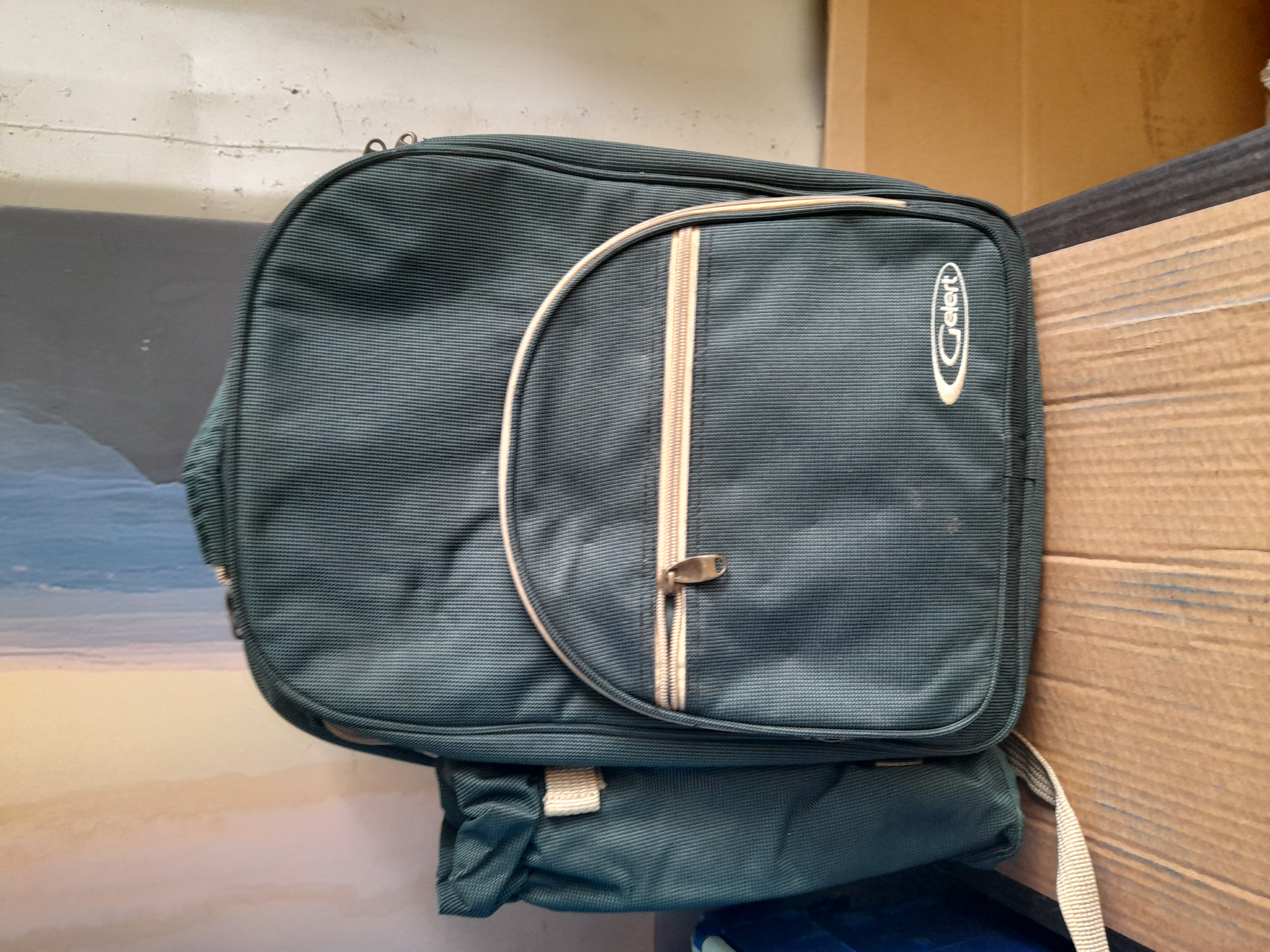 A dark green Gelert brand picnic backpack containing a collection of picnic-ware including several pieces of stainless steel cutlery, plates, and glassware.
