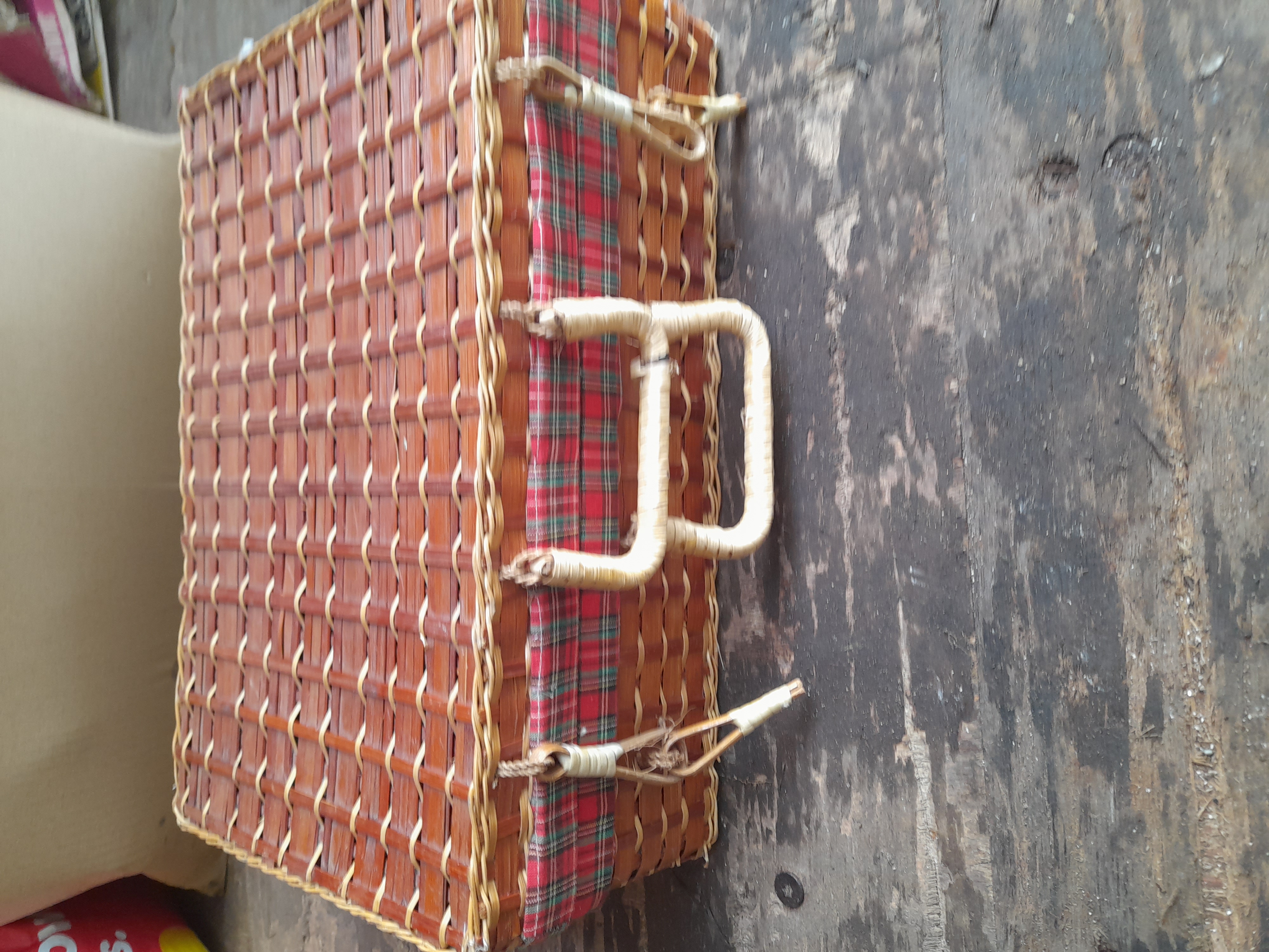 A Woven Suitcase Containing Vintage Awards and Glass Bottles