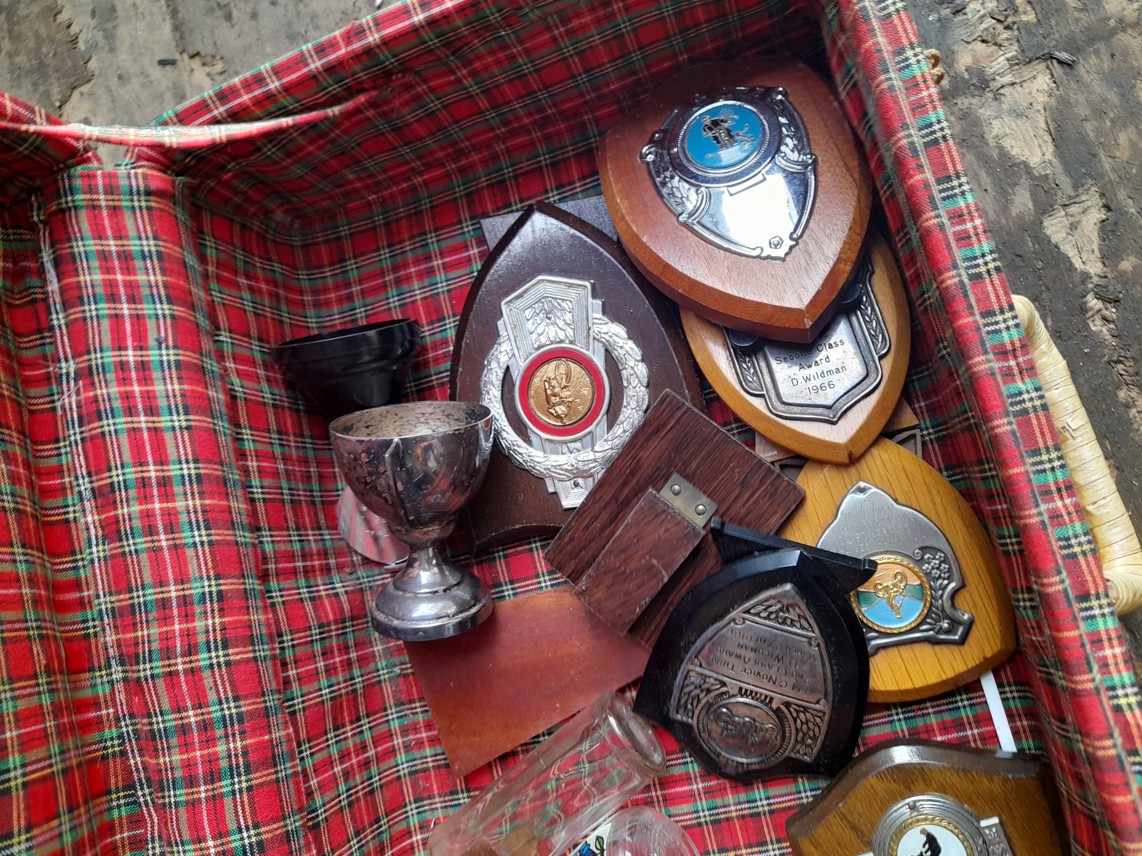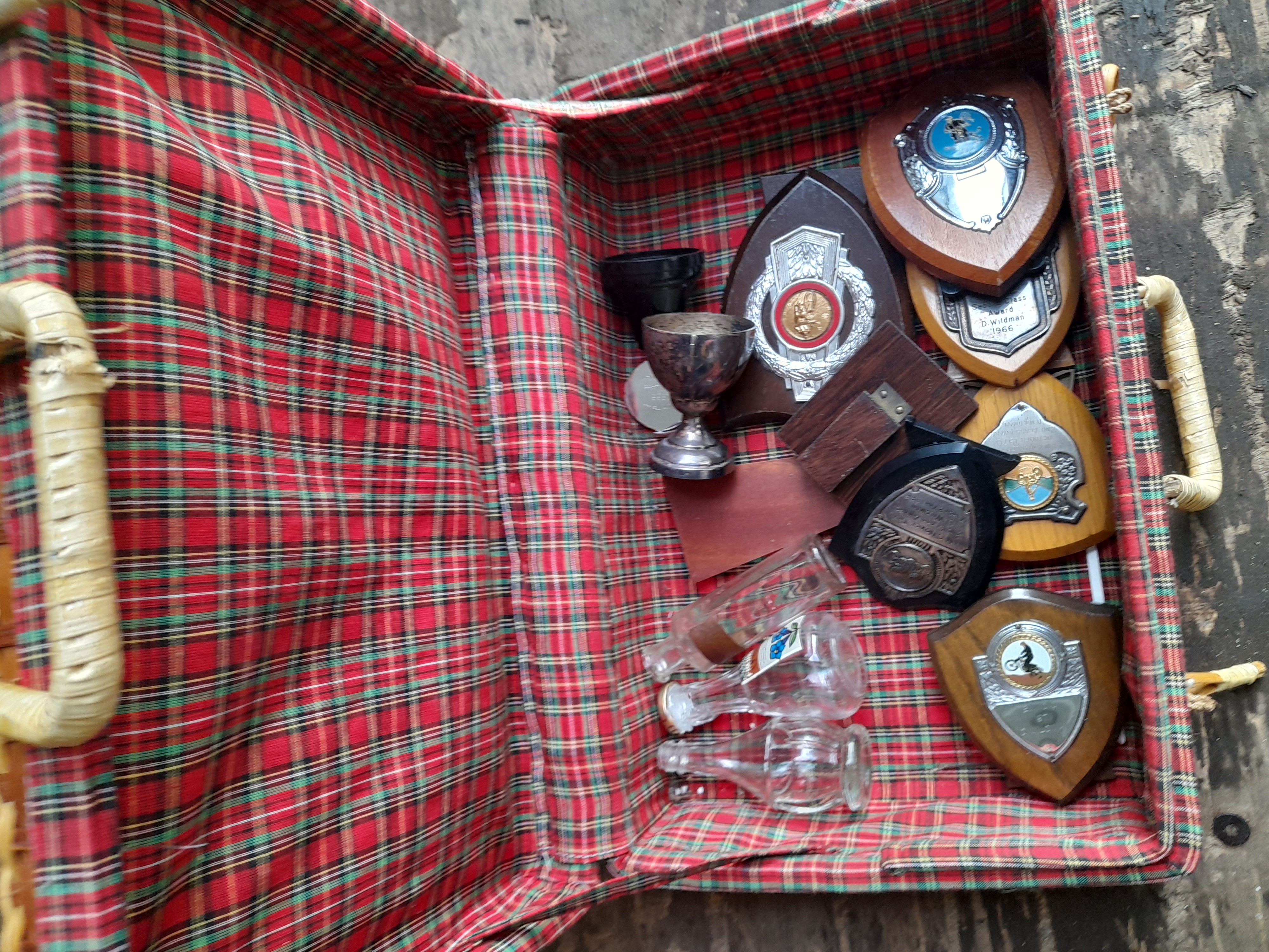 A brown woven suitcase with a red plaid interior containing several wooden and metal plaques inscribed for D. Wildman in 1966, a silver-toned trophy cup, and several clear glass bottles.