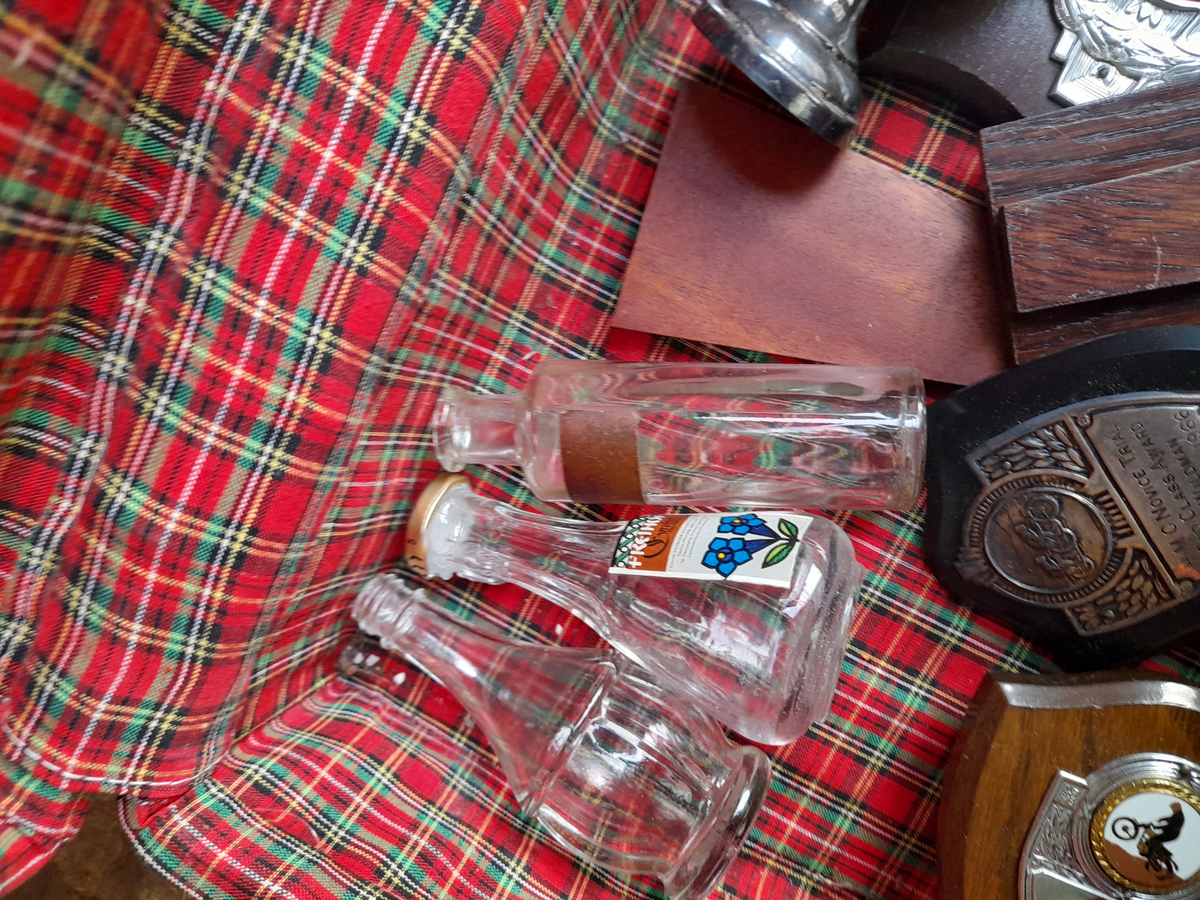 Lot 167: A Woven Suitcase Containing Vintage Awards and Glass Bottles