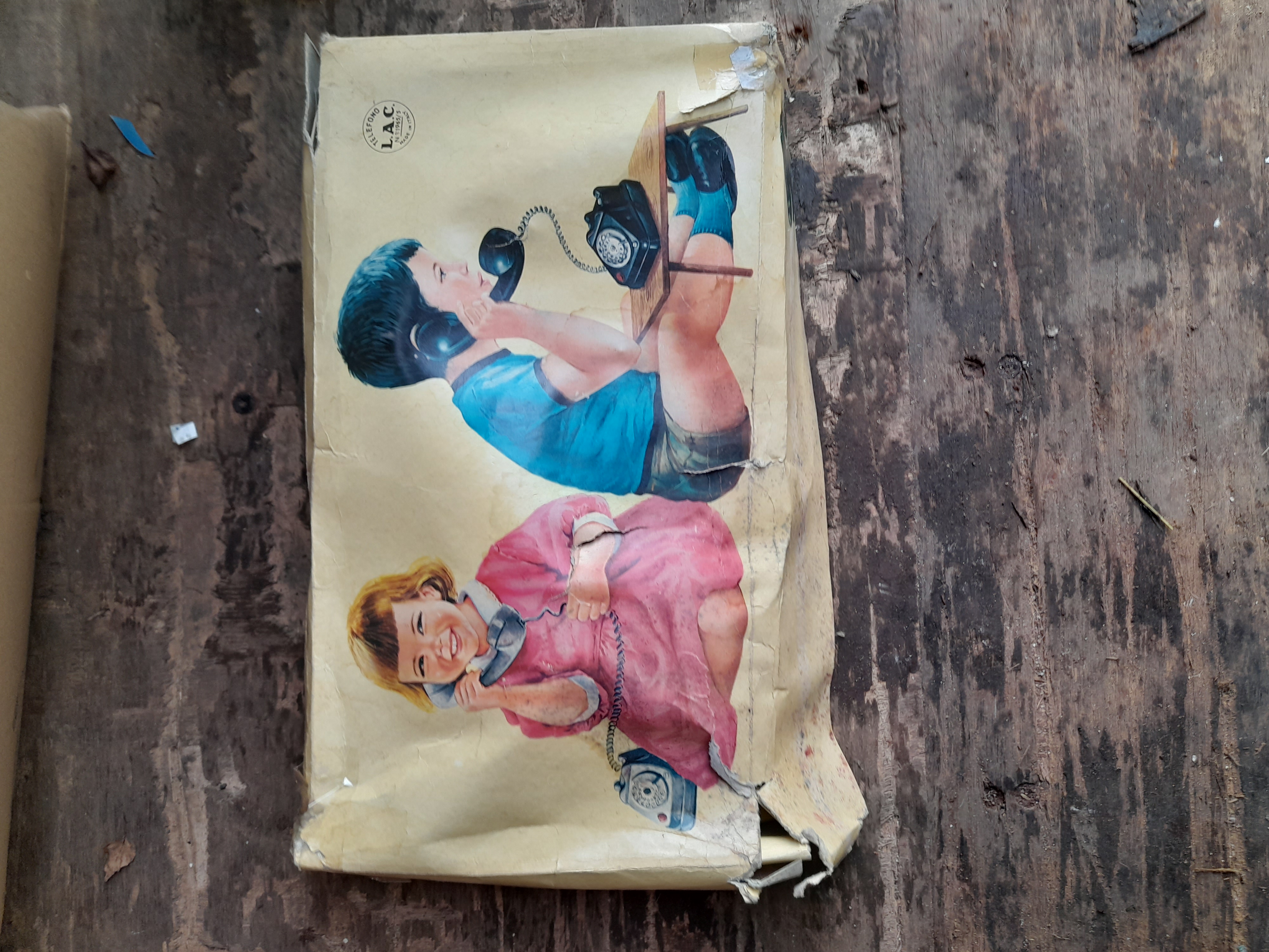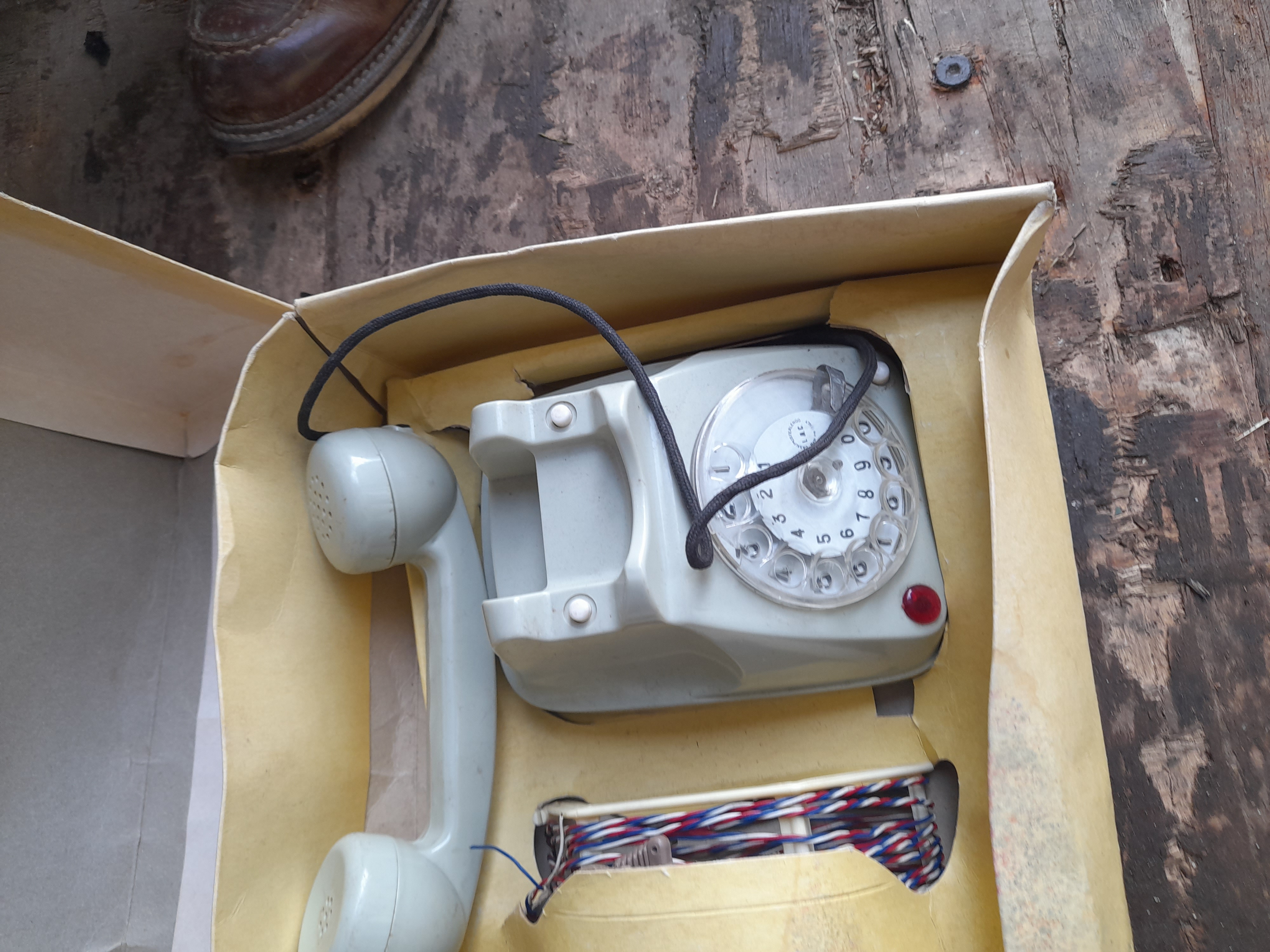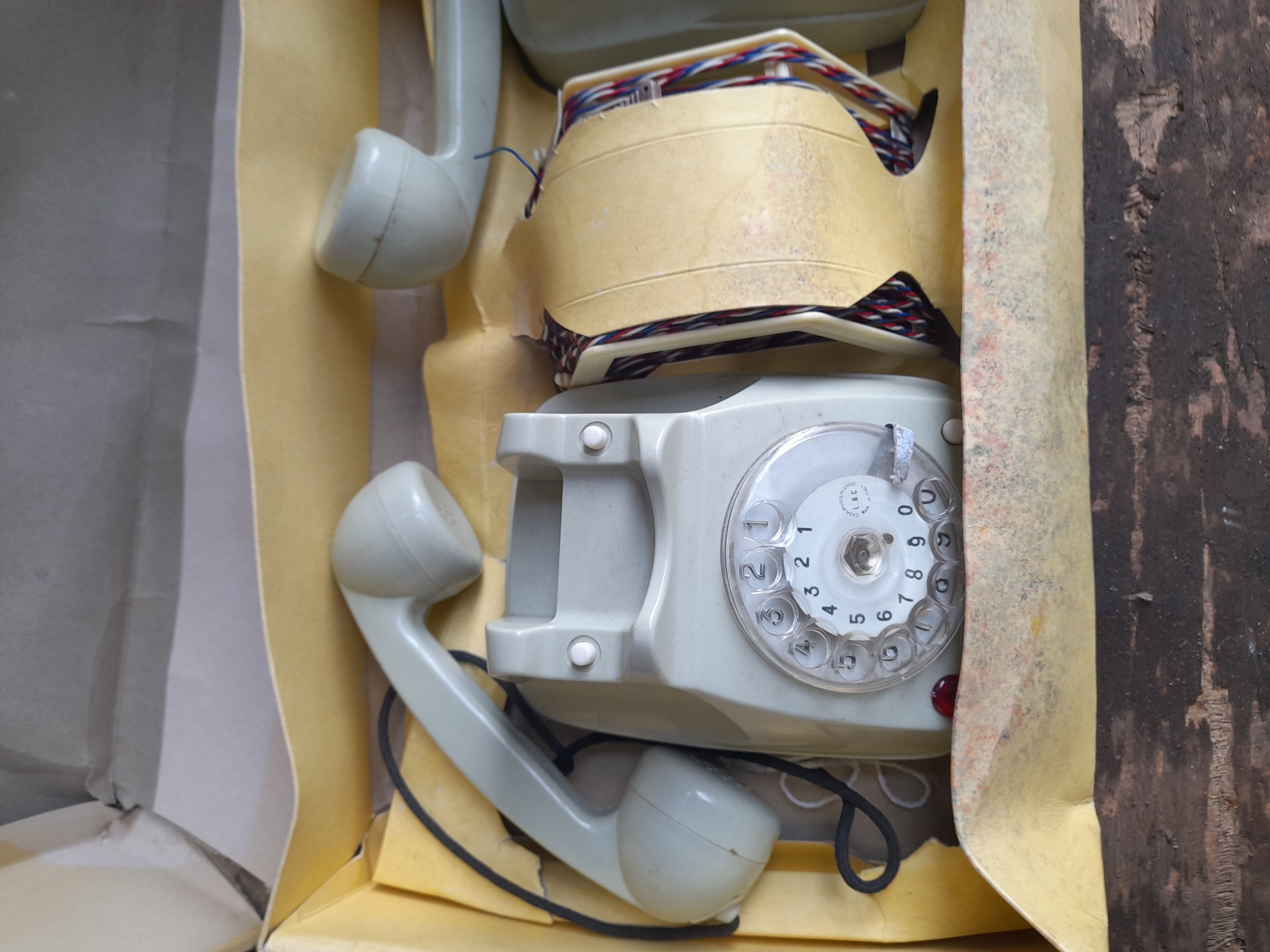 A pair of grey plastic rotary-dial telephones with a coil of multicoloured wire, presented in the original illustrated Telefono L.A.C. Casalpusterlengo box made in Italy.