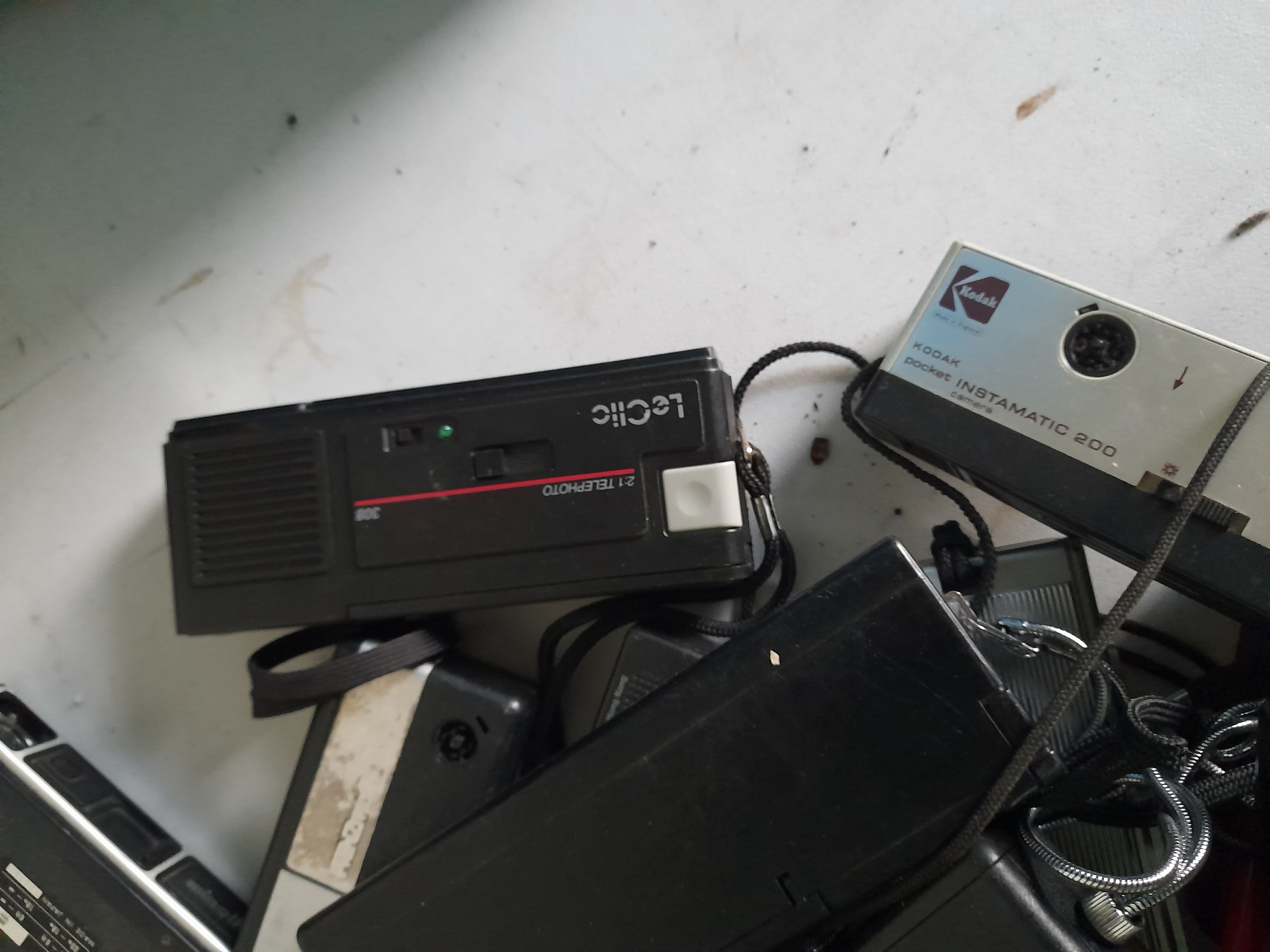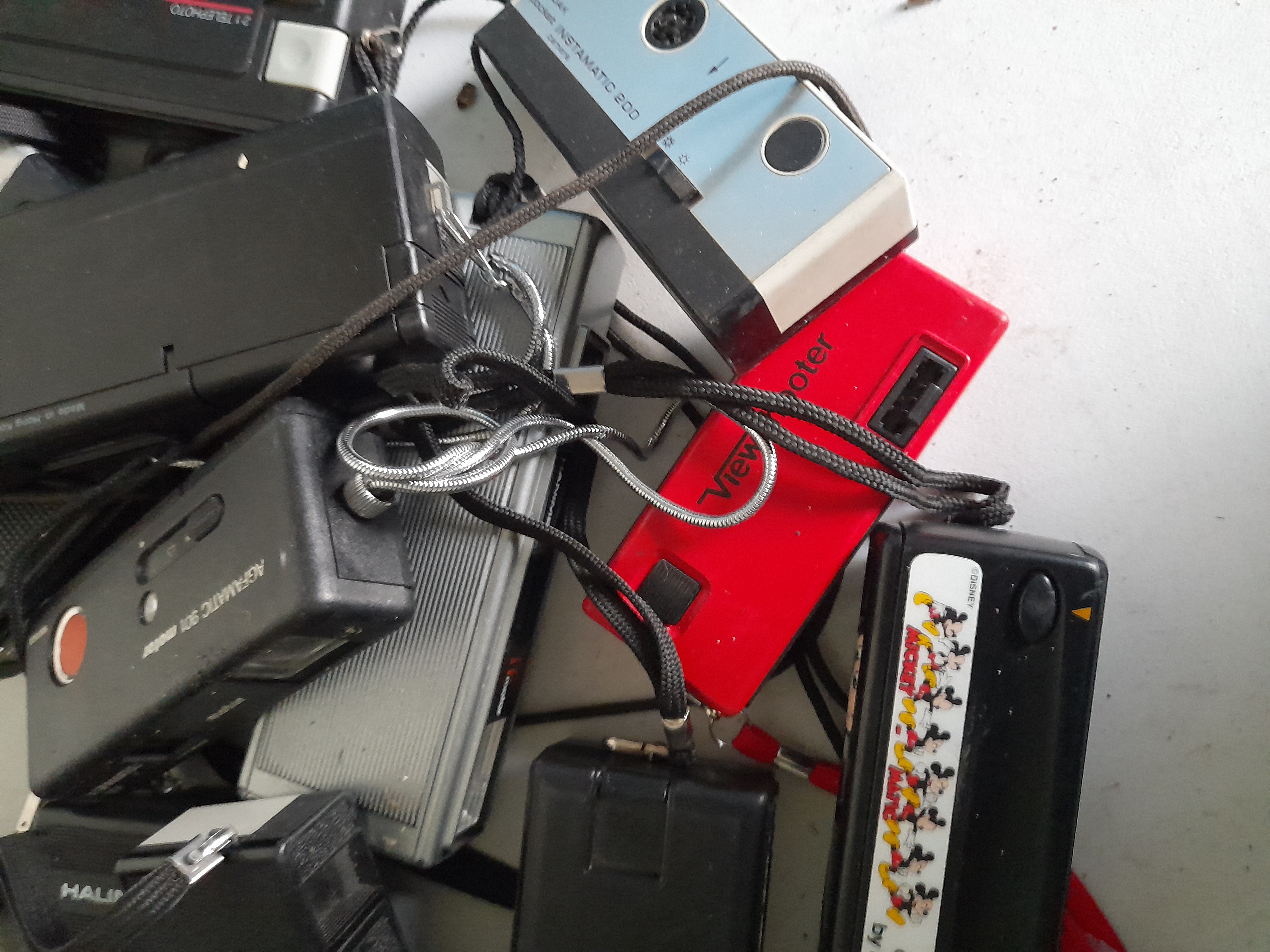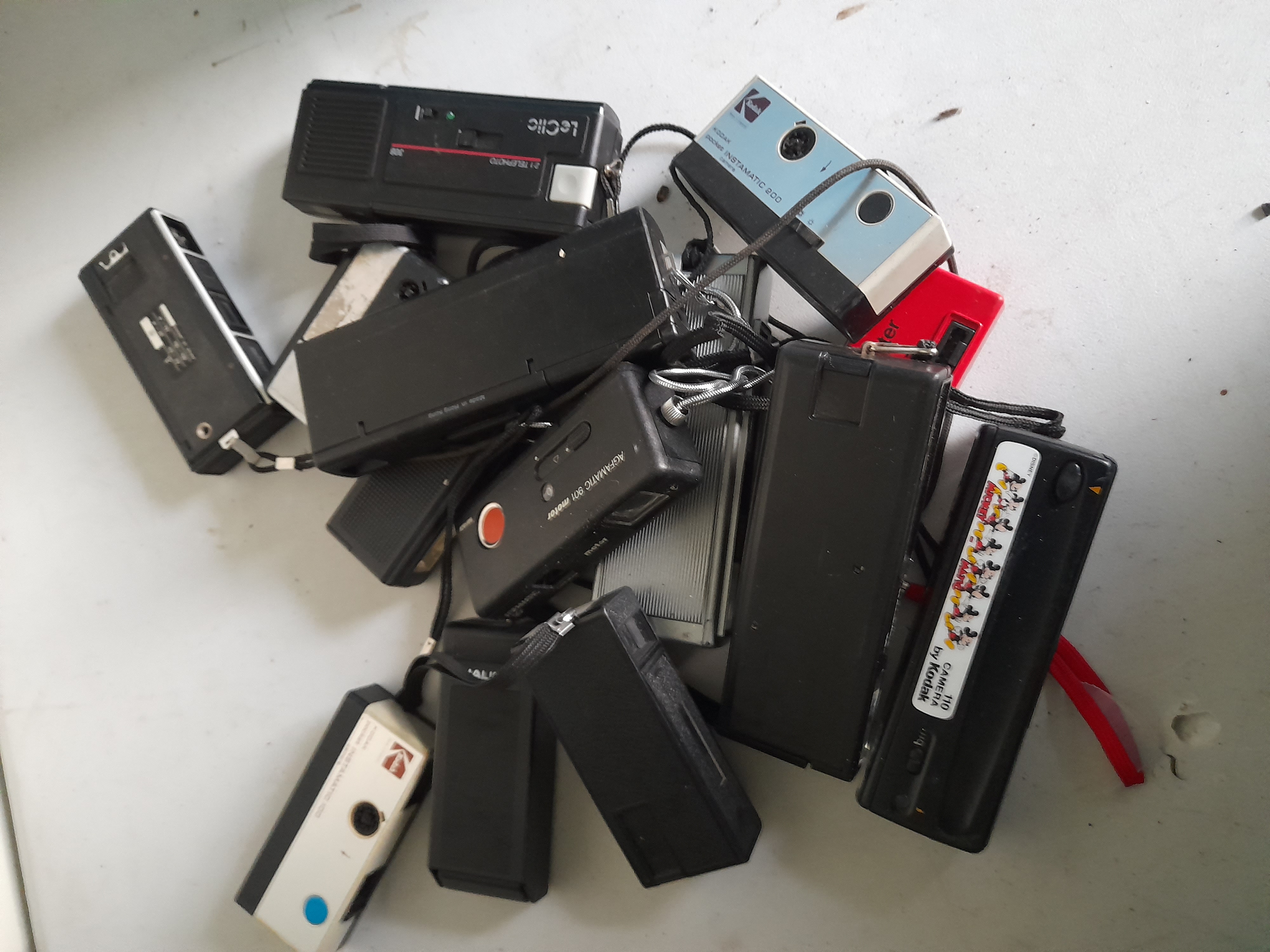 The collection includes a Kodak Pocket Instamatic 200 in a blue and silver finish; a Kodak Pocket Instamatic 100 in white and silver; a black LeClic 308 featuring a 2:1 Telephoto lens; and an Agfamatic 901 motor camera. Also featured is a distinctive bright red camera with View-Master branding and a black 110 camera by Kodak adorned with Mickey Mouse illustrations and a Disney copyright. The group is completed by a Halina camera and several unbranded black plastic subcompact cameras.