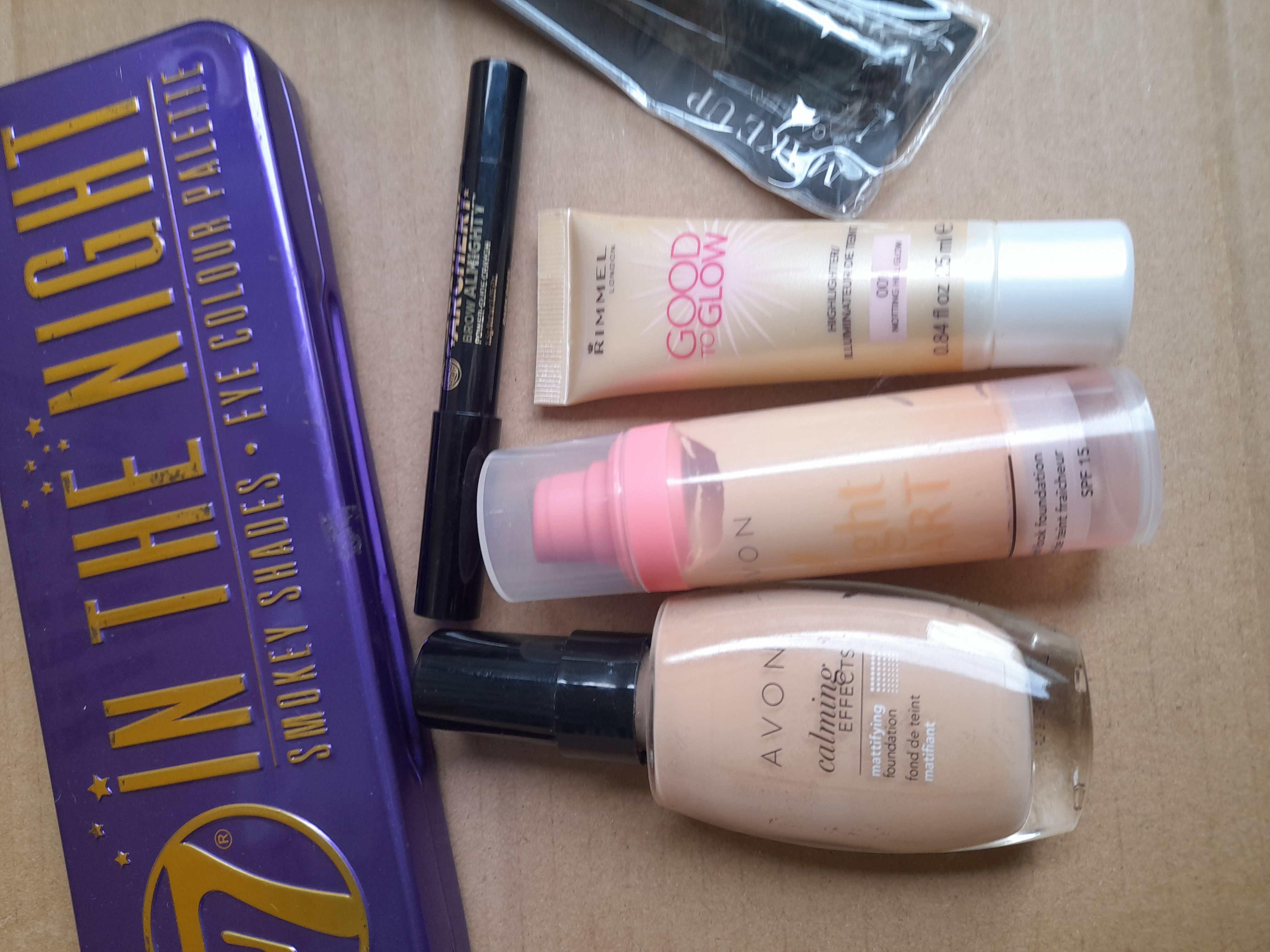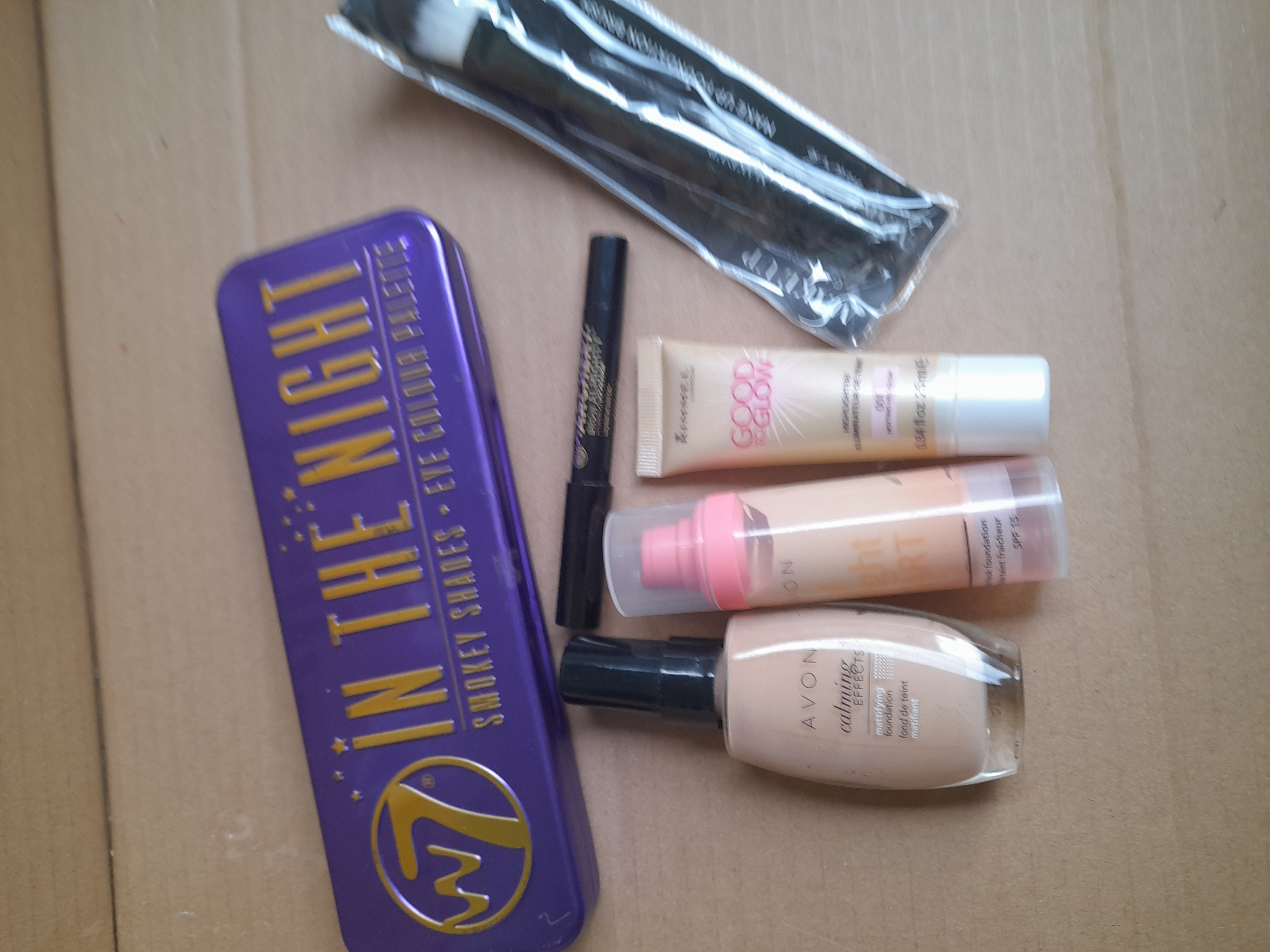A collection of makeup items including a W7 In The Night eye colour palette, an Archery brow pencil, a Rimmel highlighter, two Avon foundations, and a packaged brush.