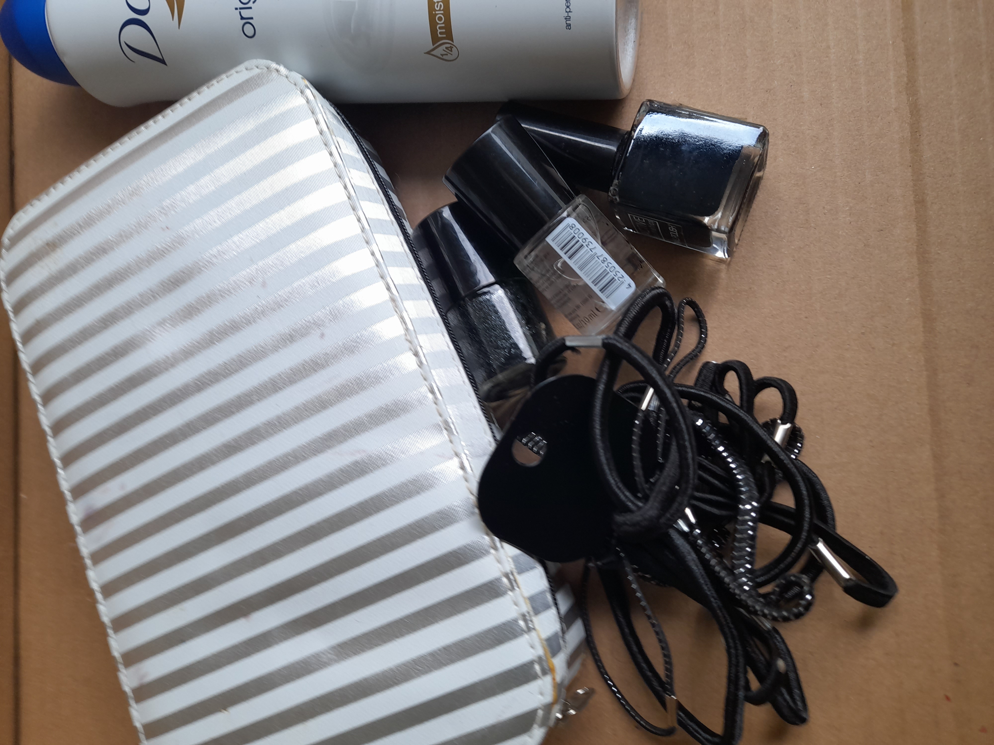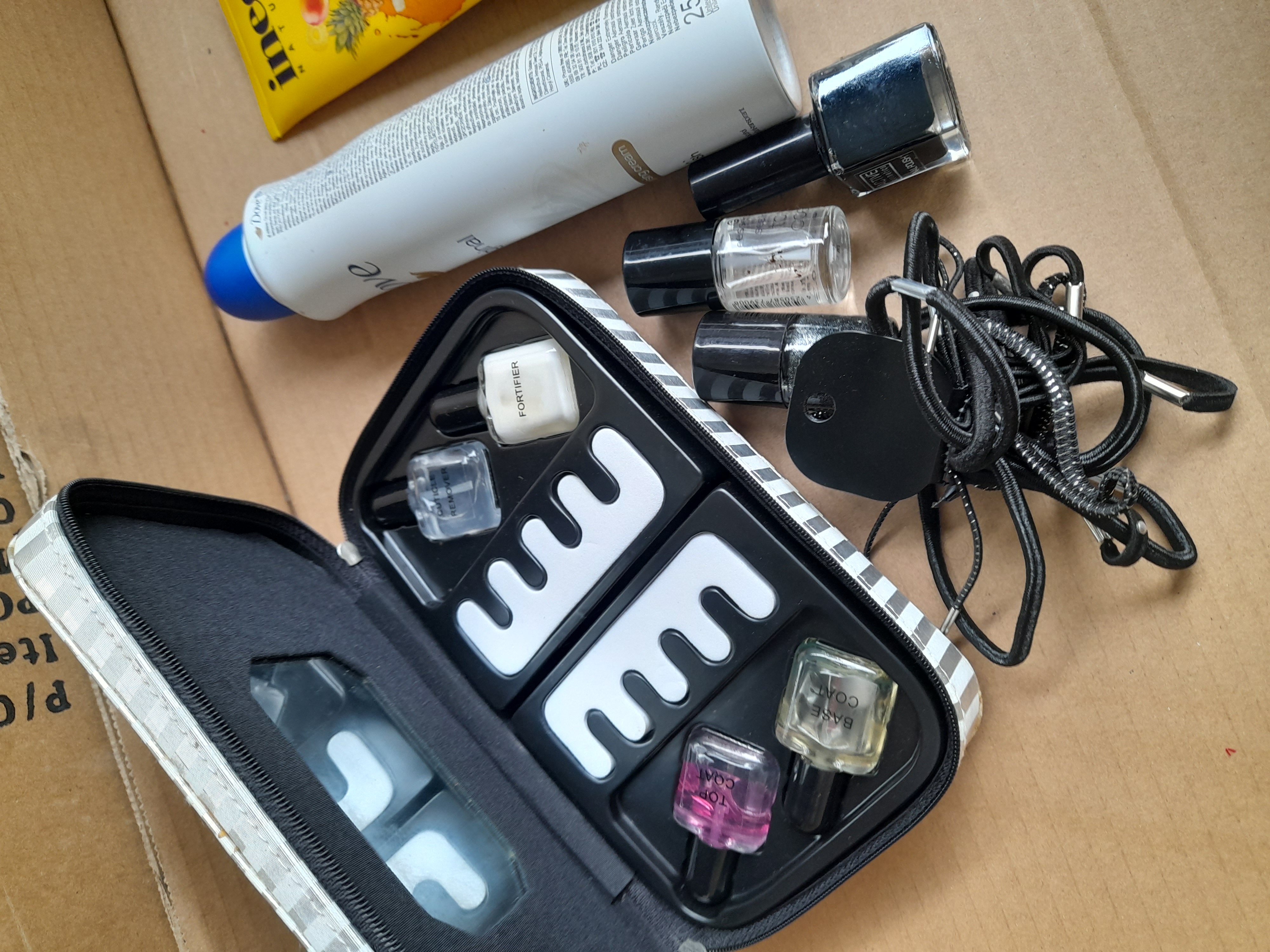 A collection of personal care products featuring Inecto Tropical Coconut infusion body lotion, Dove original anti-perspirant, several bottles of nail polish, black hair elastics, and a silver and white striped zippered manicure case containing fortifier, cuticle remover, top coat, and base coat treatments.