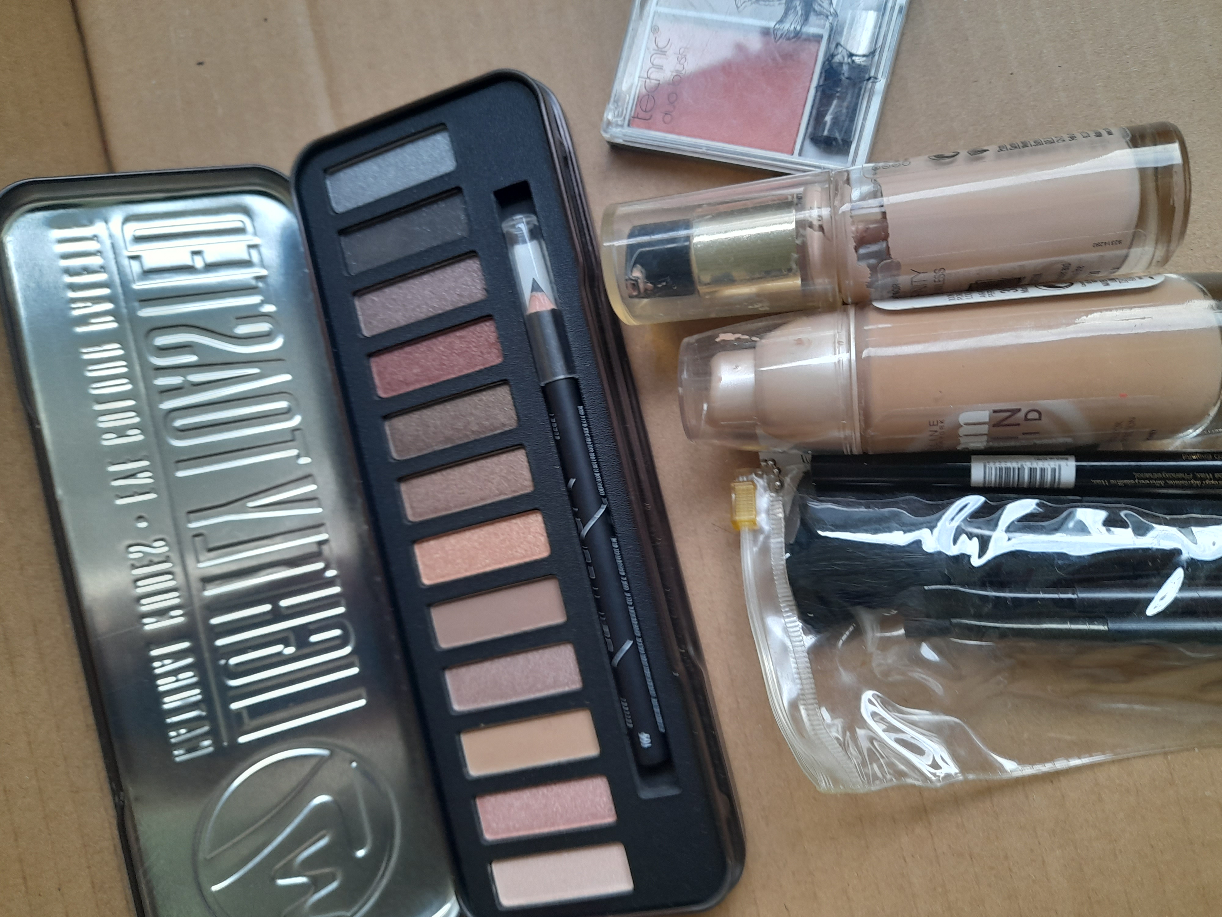 A collection of cosmetic items including a W7 Lightly Toasted eyeshadow palette, a Technic duo blush compact, Max Factor and Maybelline foundations, and a selection of makeup brushes in a clear pouch.