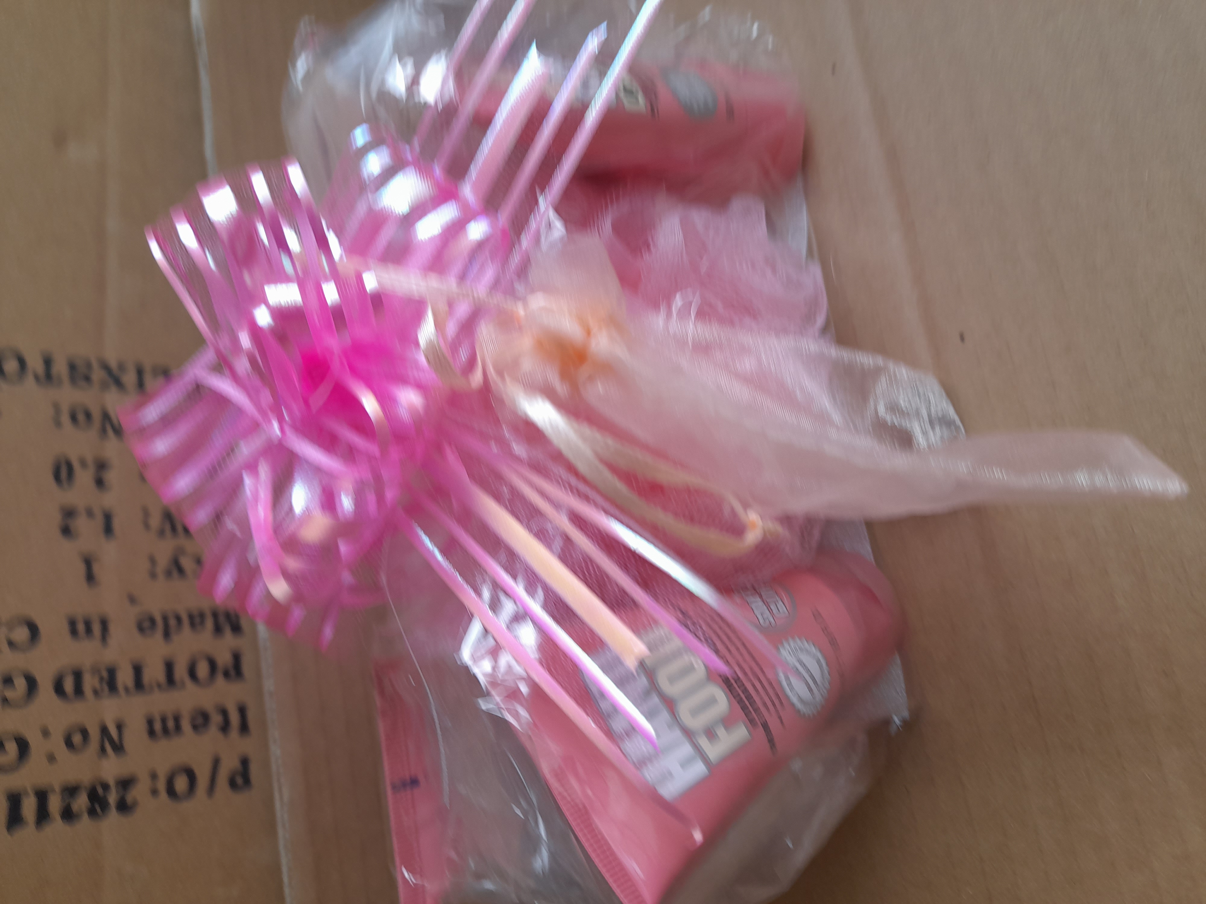 A collection of pink bath and body products including tubes labeled Scrub of Your Life and Hand Food alongside a pink mesh sponge, all contained within a gift-wrapped bag featuring a large pink bow.