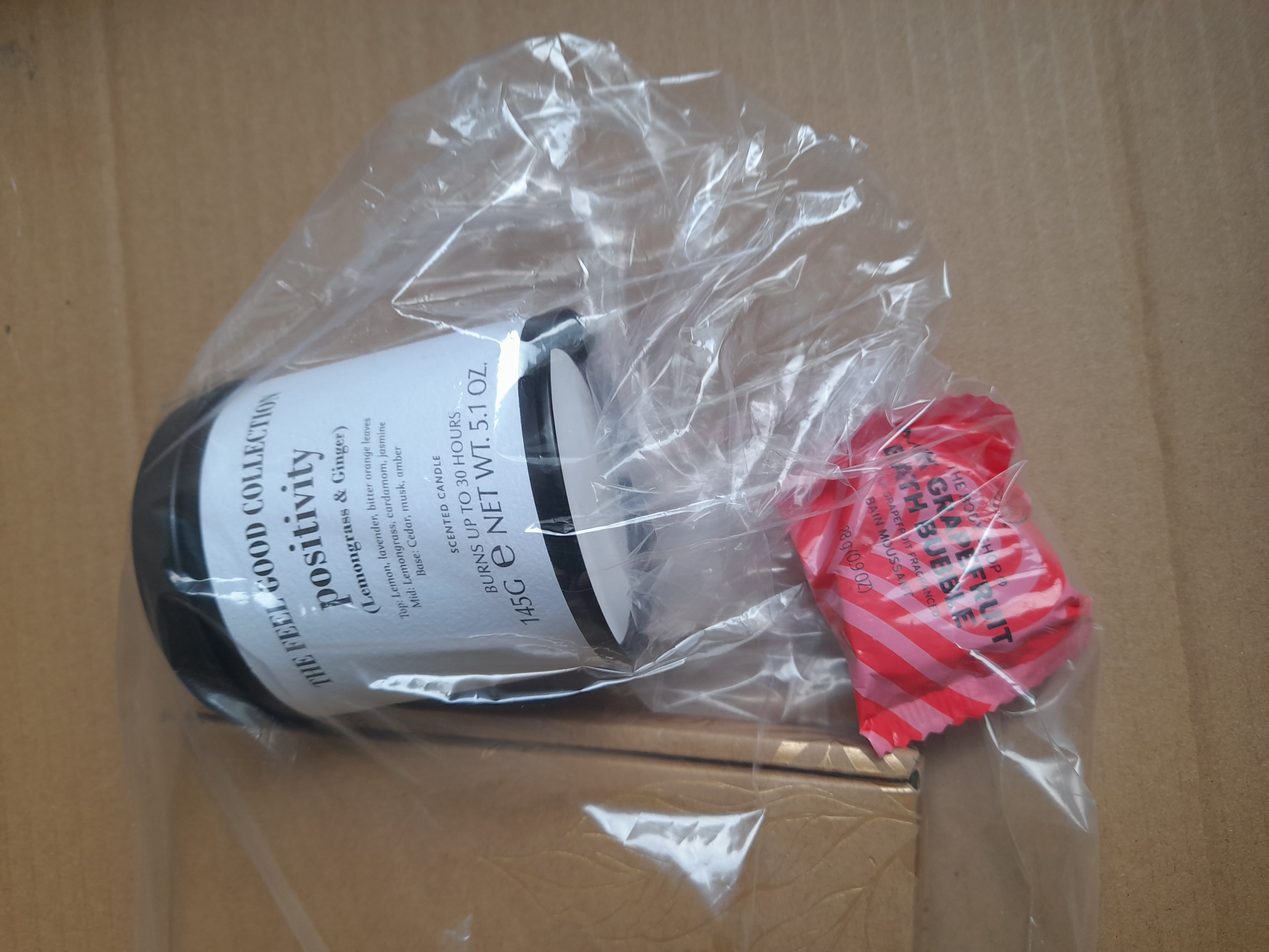 A collection of bath and body products including a Vegan Postable Pamper Box, a 145g The Feel Good Collection Positivity Lemongrass and Ginger scented candle, and a The Body Shop Pink Grapefruit Bath Bubble.