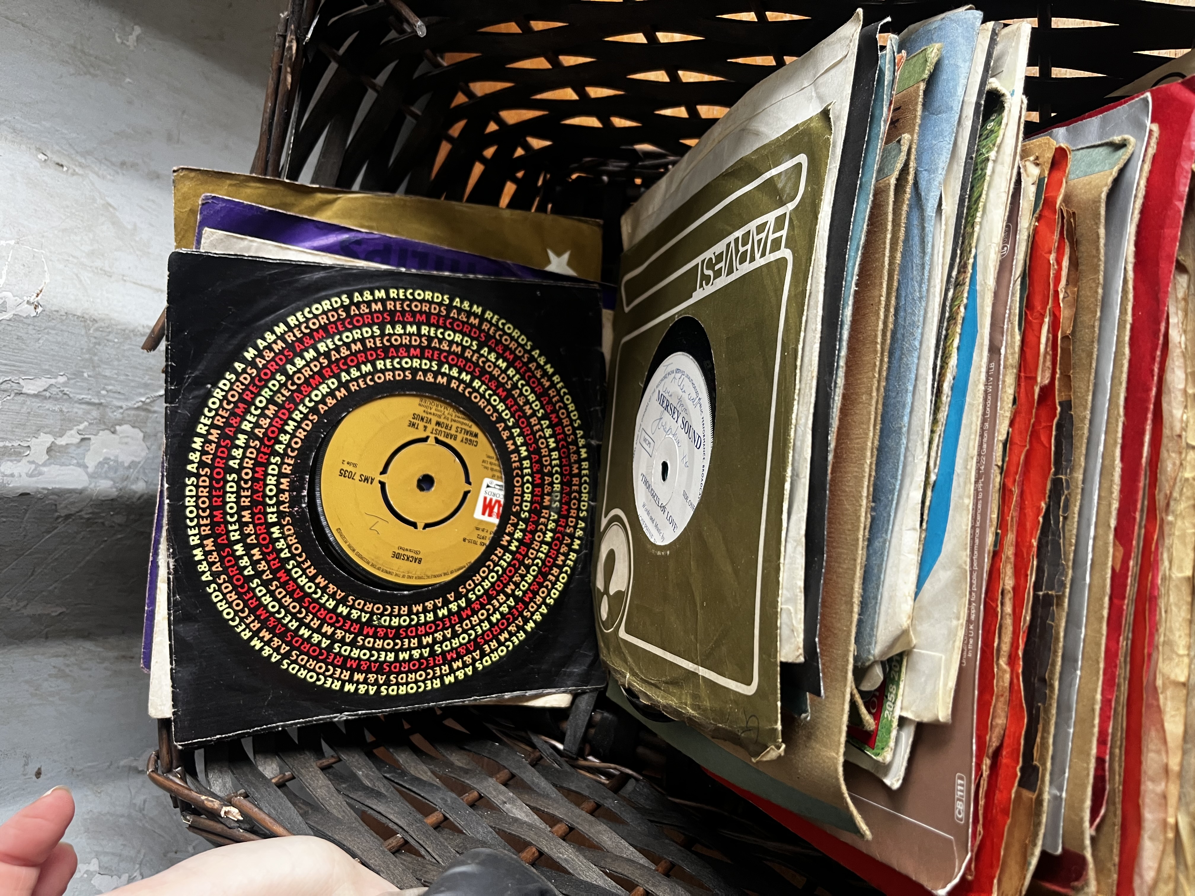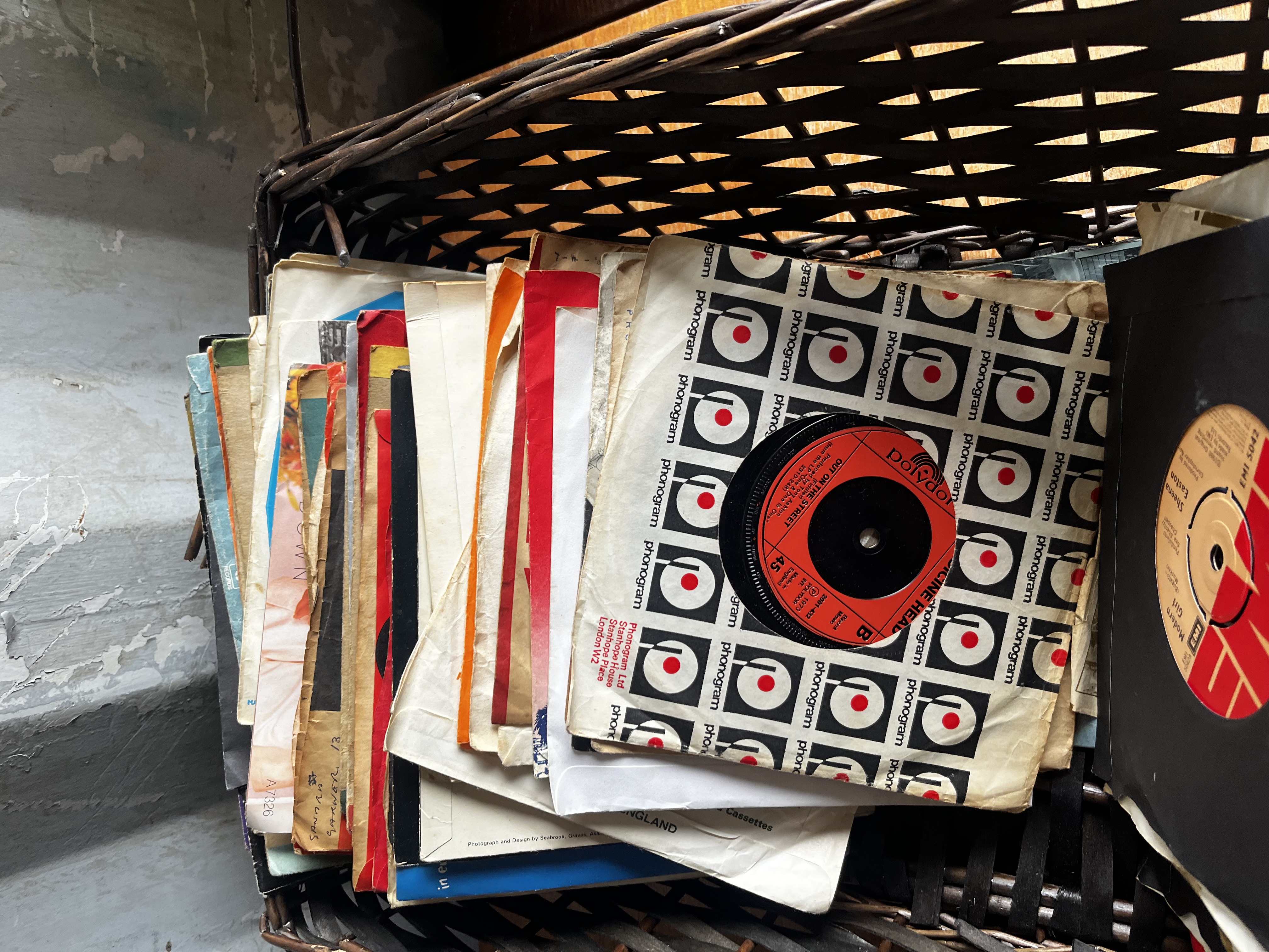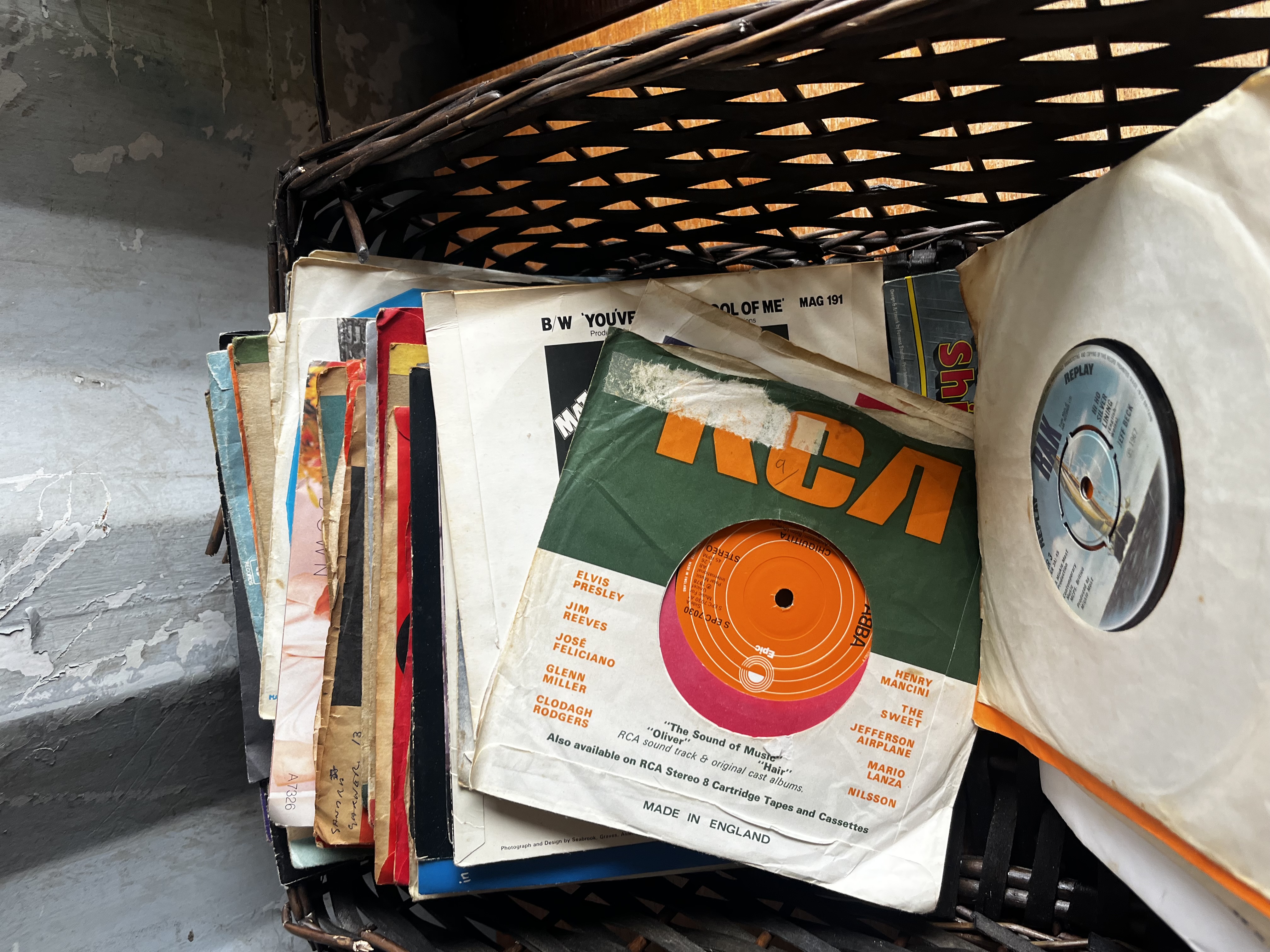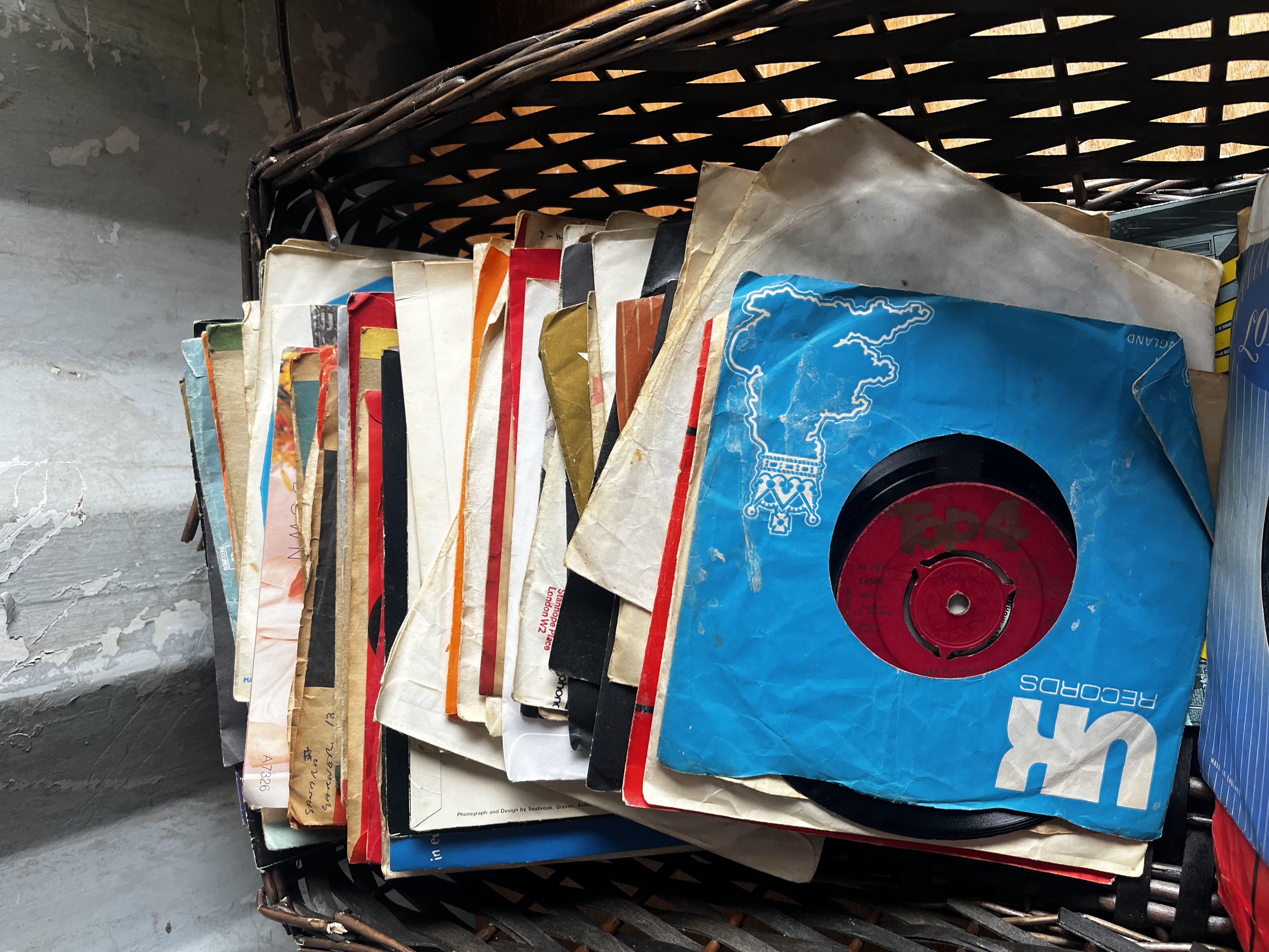 Large job lot From the 70s/80s note: wickerbasket has collapsed during lotting so exchanged for record box
