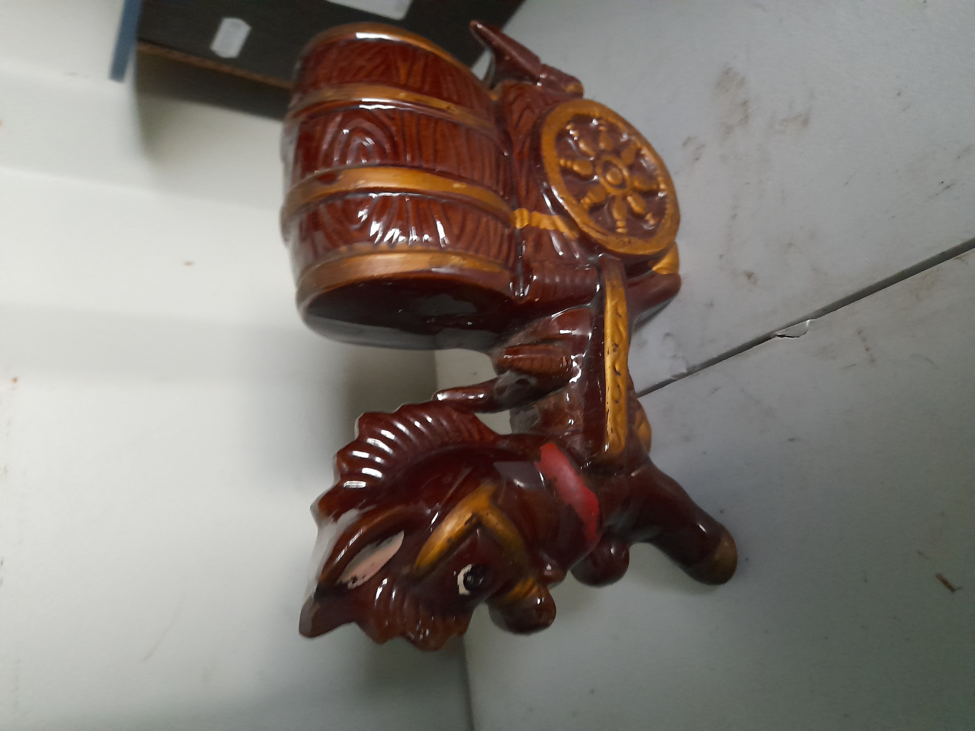 A mid-century novelty ceramic figure of Japanese origin, depicting a stylised donkey pulling a cart in the form of a whiskey barrel. The piece is crafted from redware and finished in a high-gloss chocolate brown glaze. The barrel features moulded relief wood-grain texturing with contrasting golden-yellow accents applied to the barrel bands and the spoked wheel. The donkey is rendered with simplified features, including hand-painted black eyes and a red harness detail. While often utilised as a decorative planter, this specific form was originally designed as a novelty whiskey decanter. Based on visual consensus and style, this item dates to the mid-20th century export period. Height: approximately 15 cm.