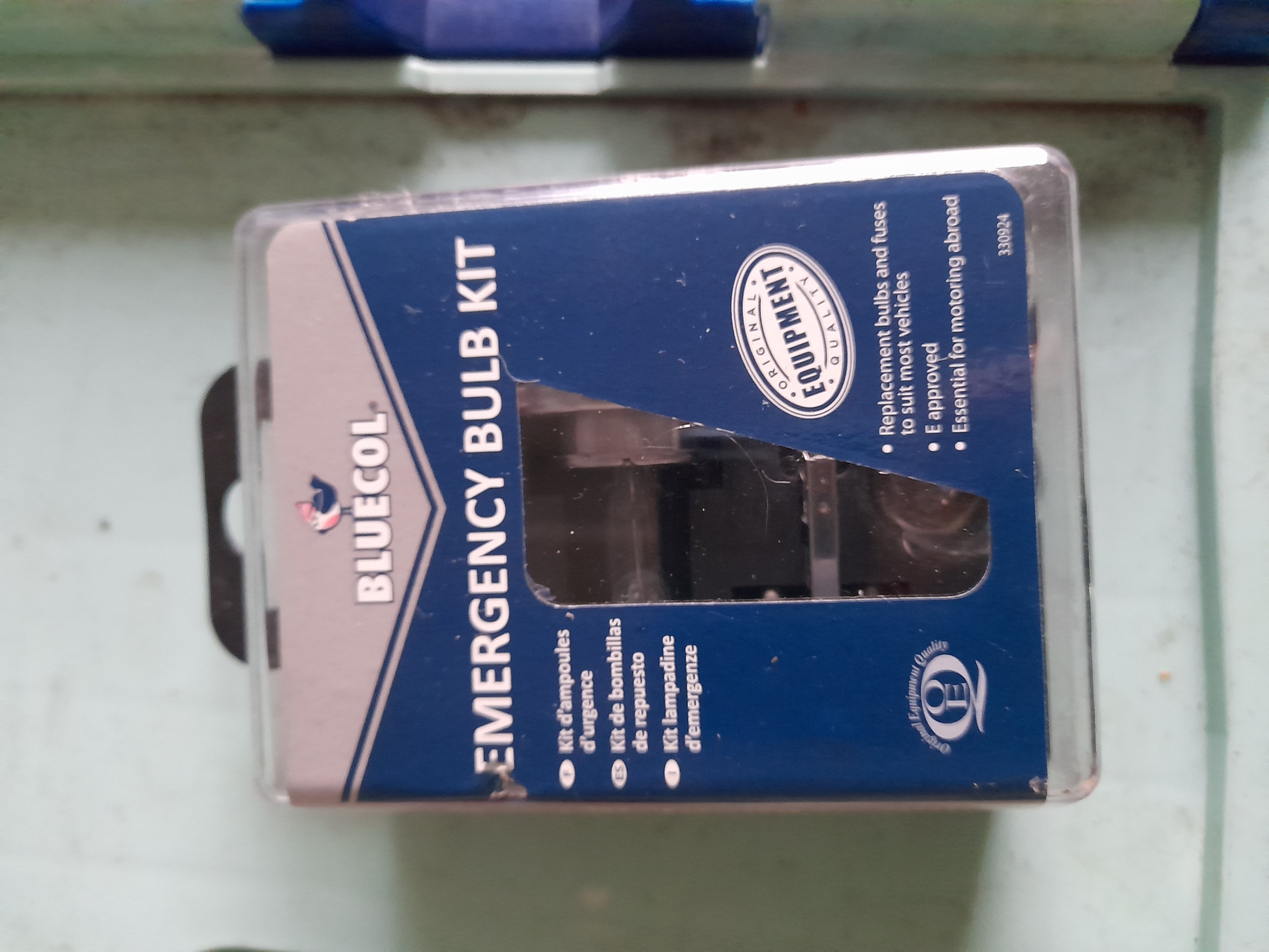 An automotive emergency bulb kit by Bluecol, manufactured by Tetrosyl Limited of Bury, Lancashire. This contemporary utility item consists of a variety of replacement bulbs and fuses of original equipment quality, designed for universal vehicle application. The components are housed within a black plastic storage case featuring a transparent viewing window positioned to the centre of the front panel. The label is printed in blue and silver, bearing the maker’s name and stating the kit is E-approved and essential for motoring abroad. The reverse of the case provides multi-language instructions, a barcode, and the manufacturer’s details. Marks include the product code CC F60527 and the E-approval symbol. Measurements: No scale or ruler present in images.