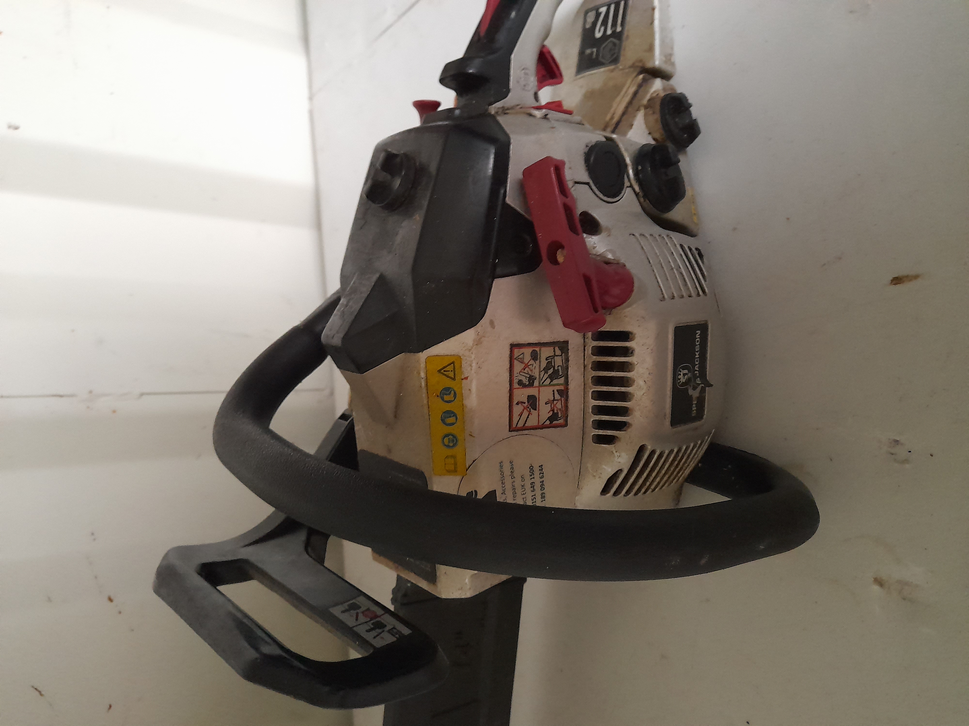 A Spear and Jackson petrol chainsaw featuring a white and black body with red accents and a black guide bar cover.