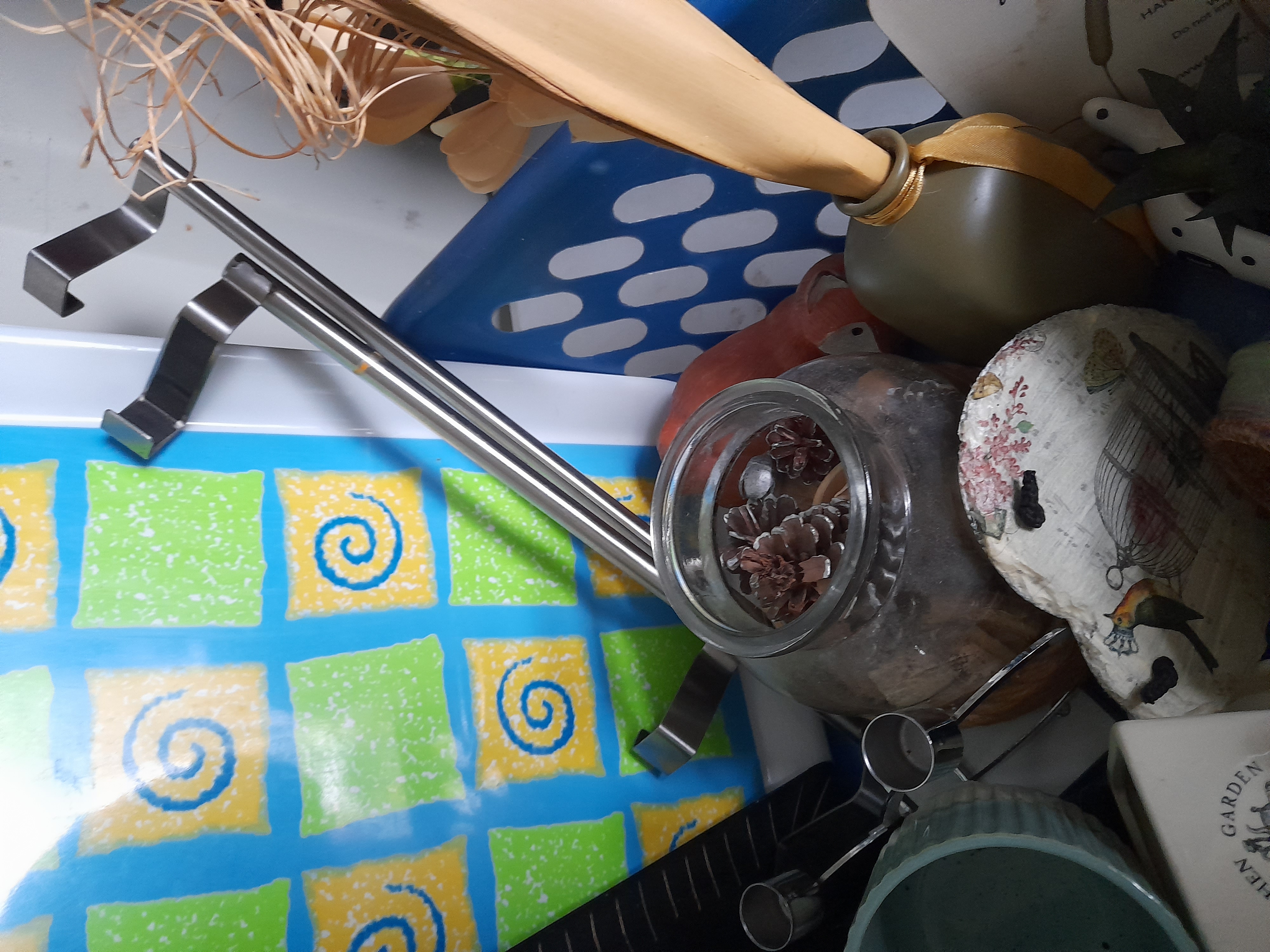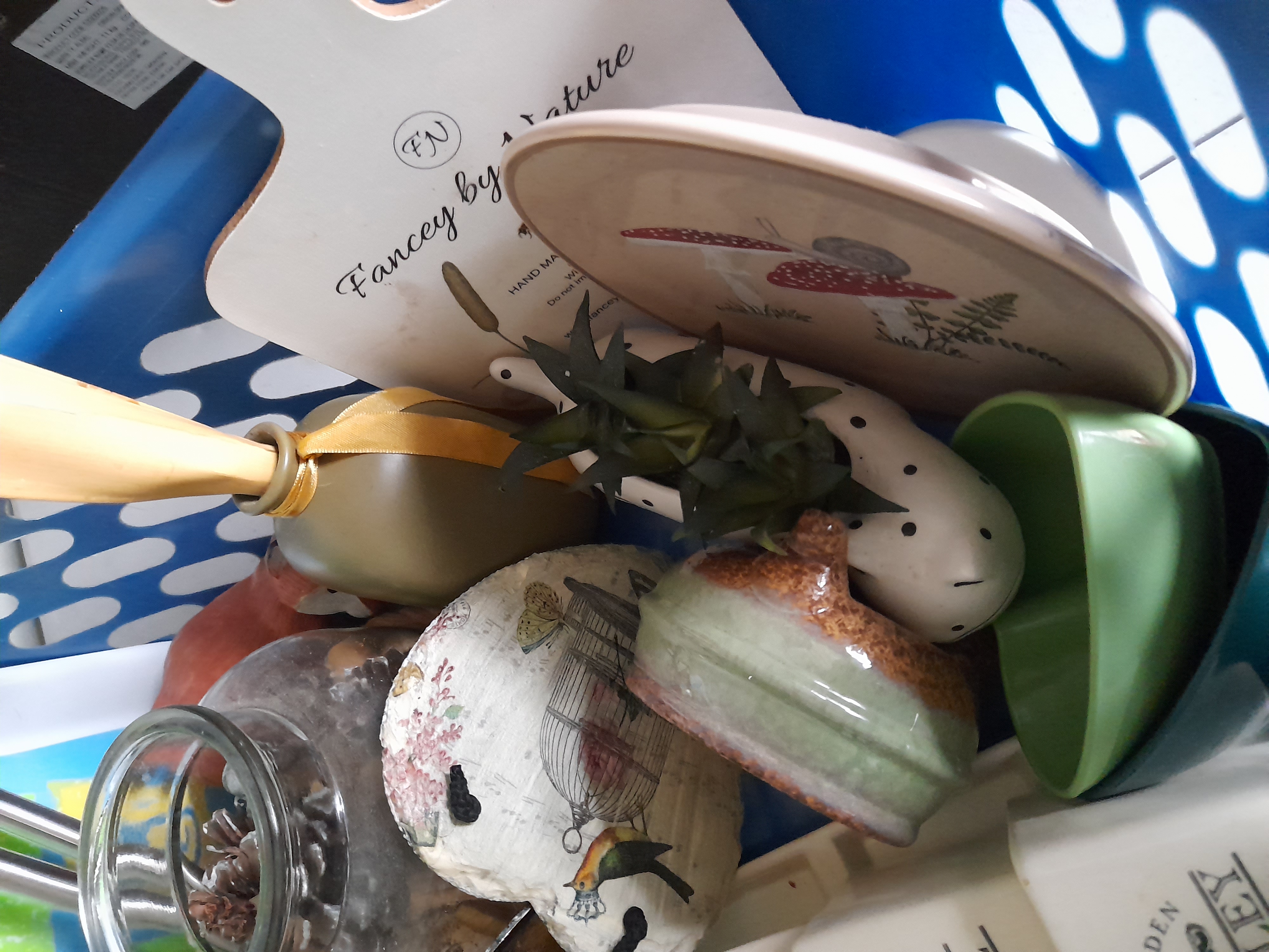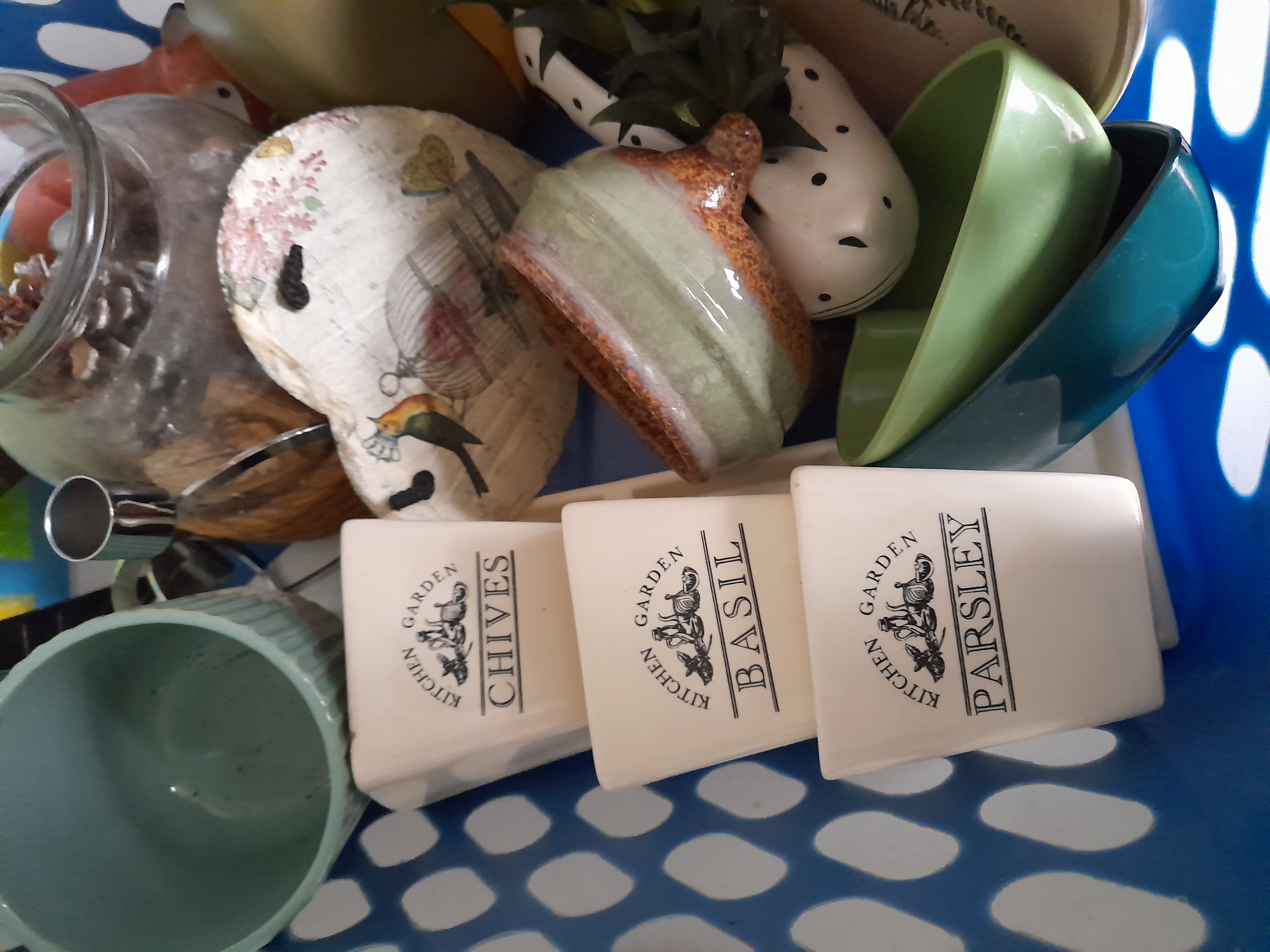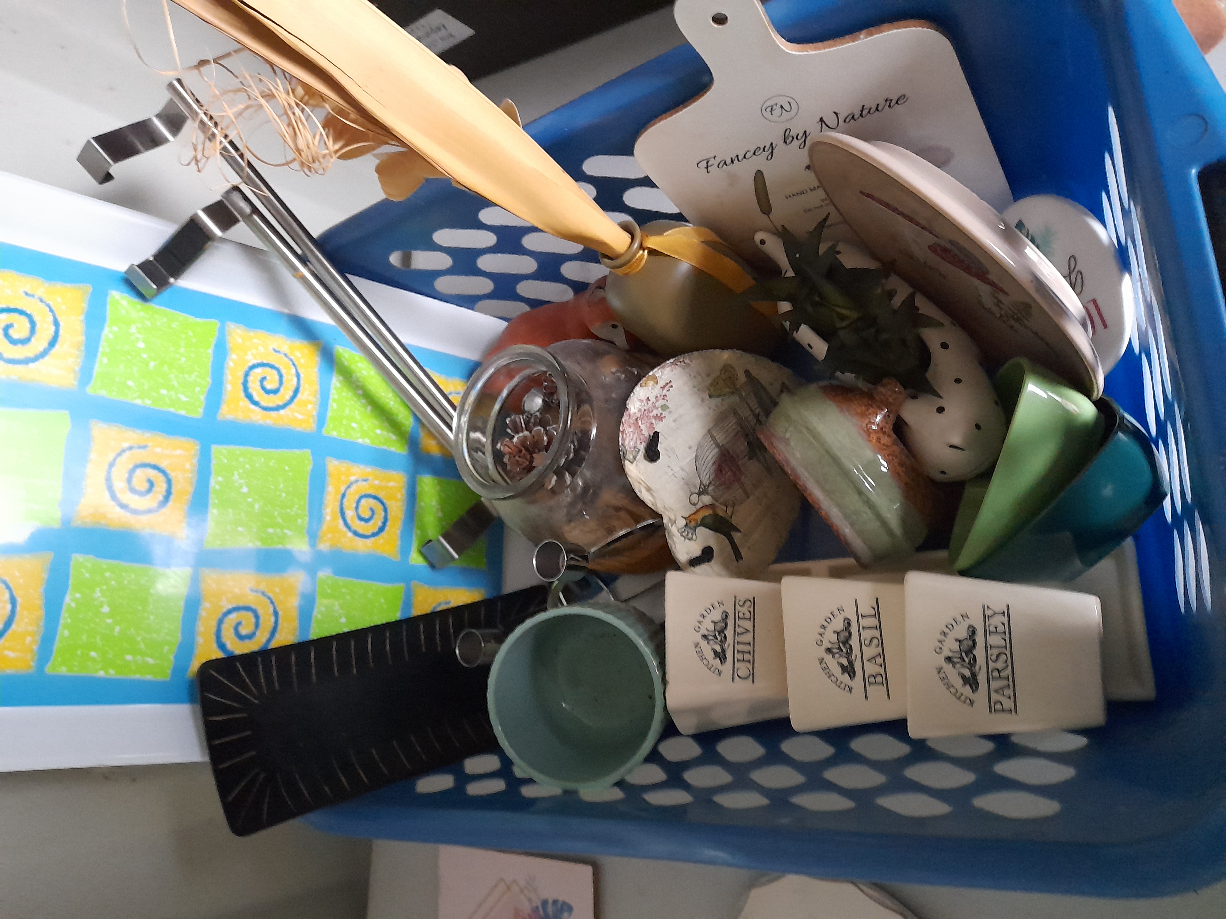 A collection of multi-coloured household and decorative items including Kitchen Garden ceramic herb planters, a Fancy by Nature board, a patterned tray, glassware, and metal hardware.