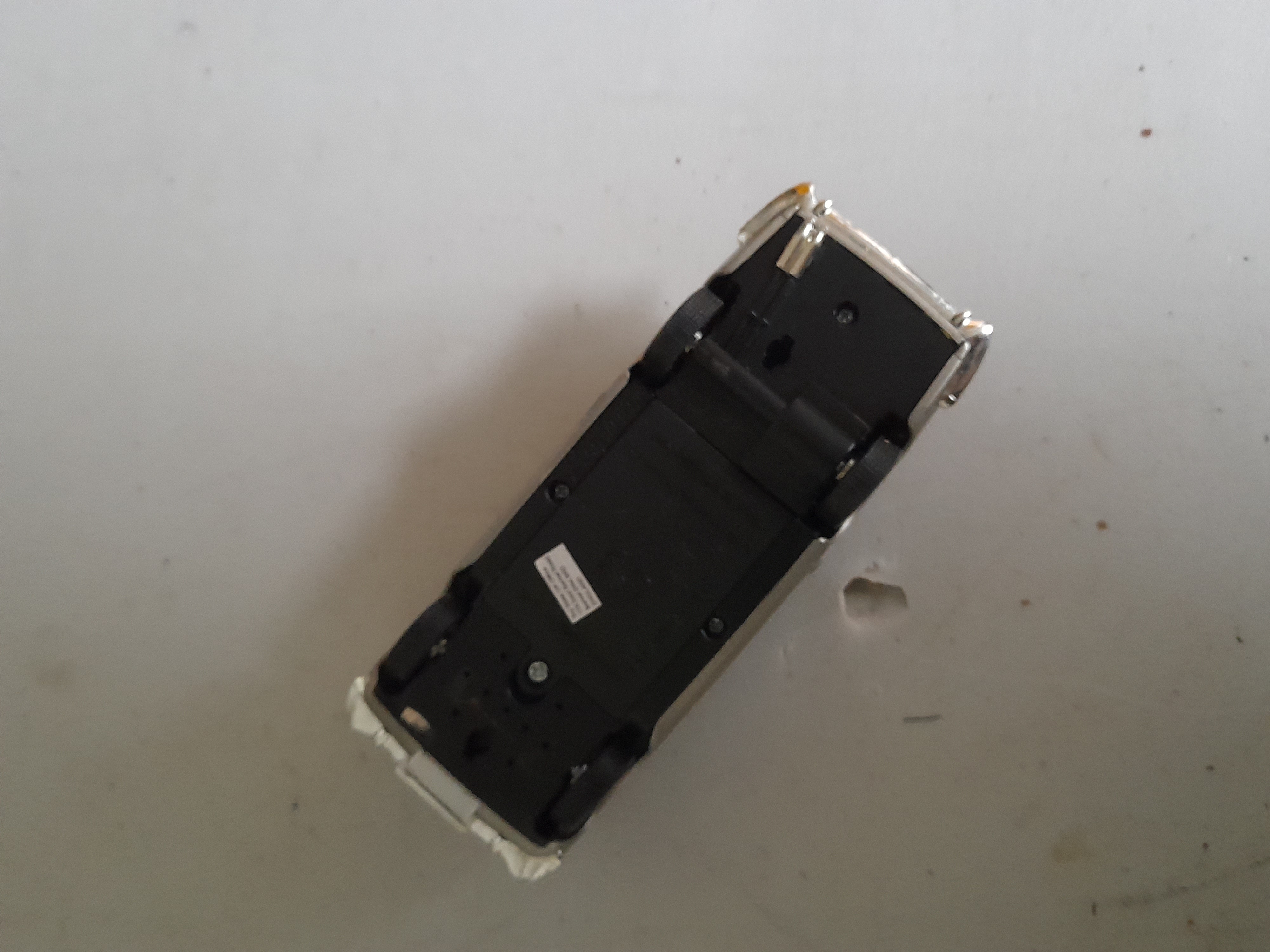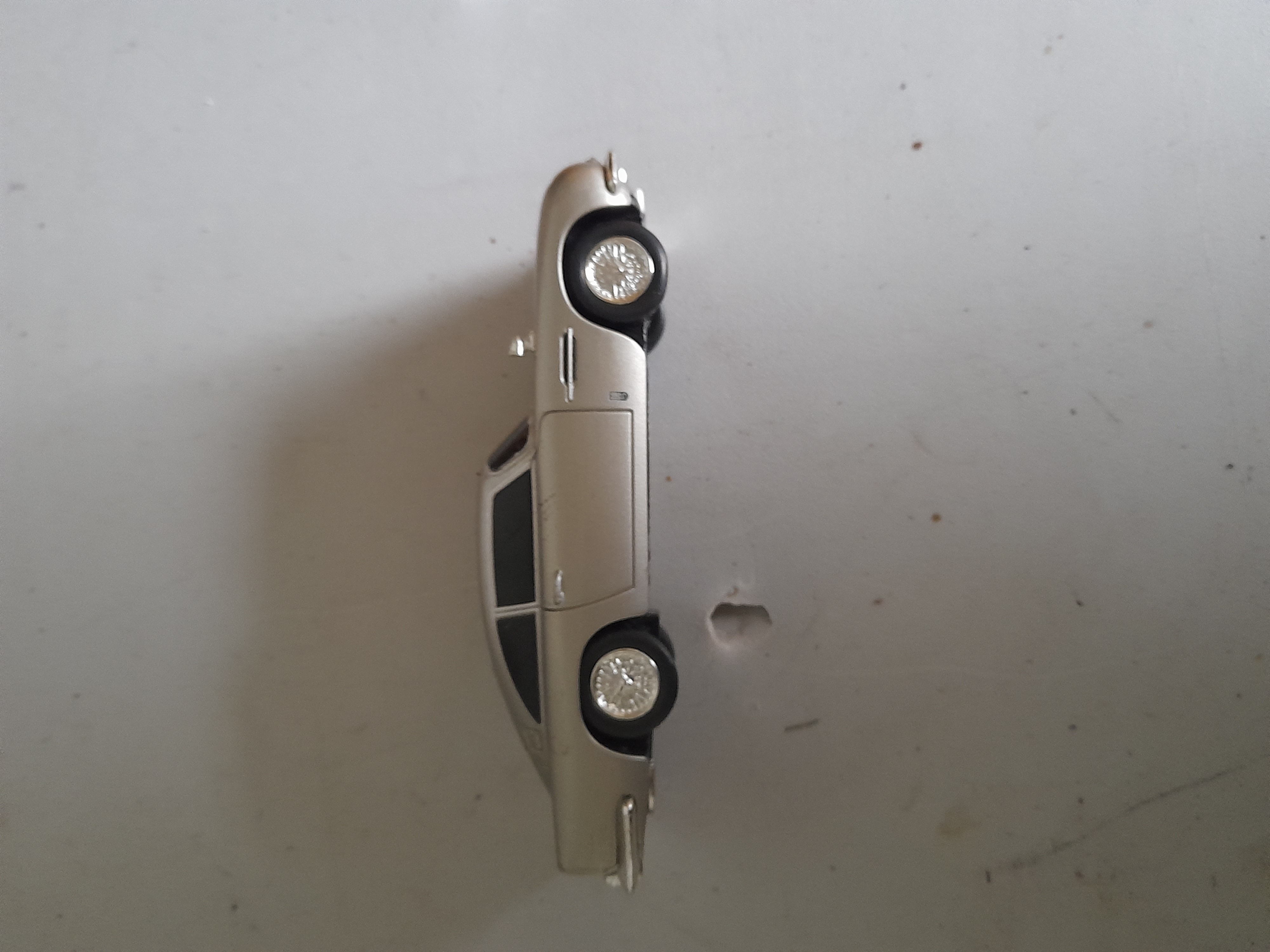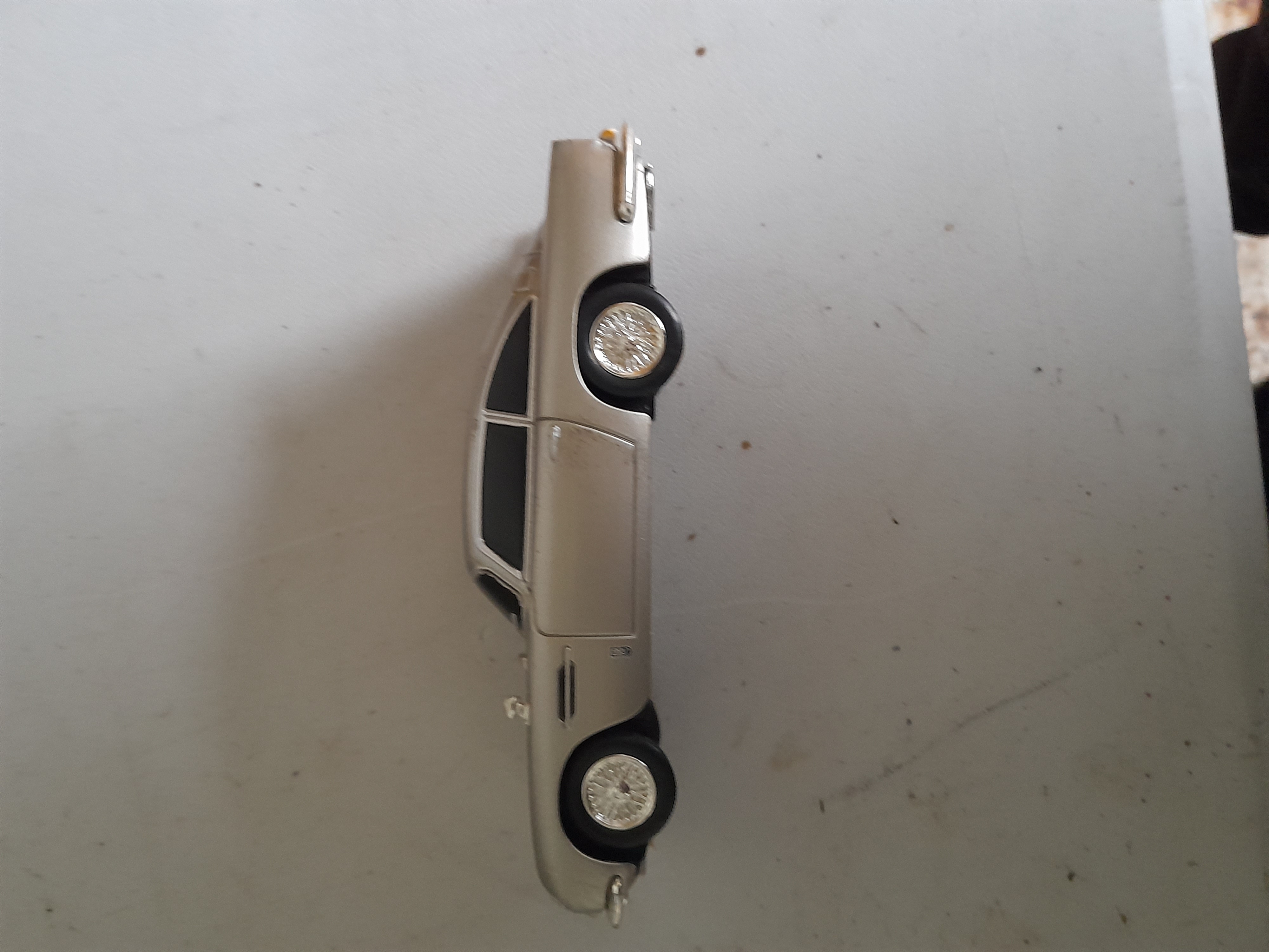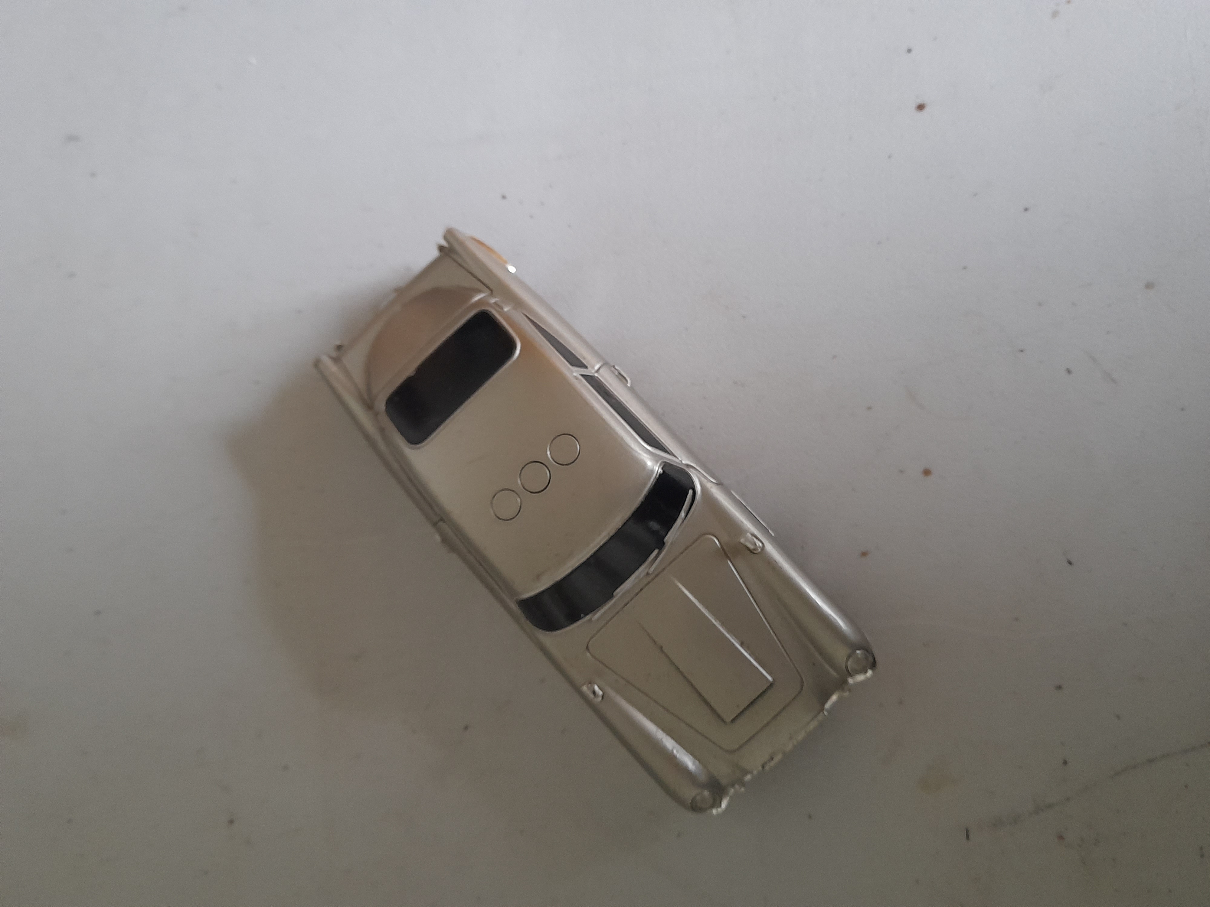 A silver-coloured plastic toy car modelled after an Aston Martin DB5 featuring a small white label on its underside. Onboard sound effects