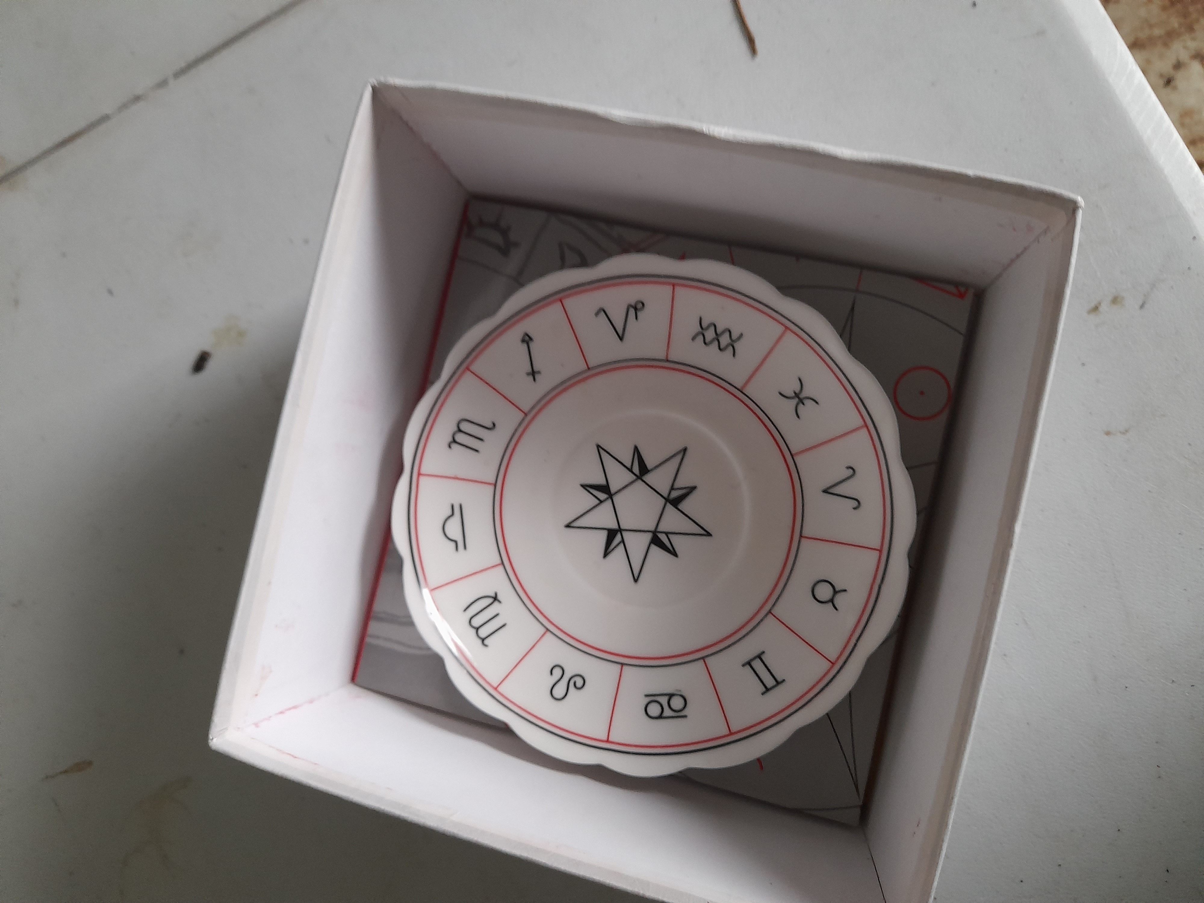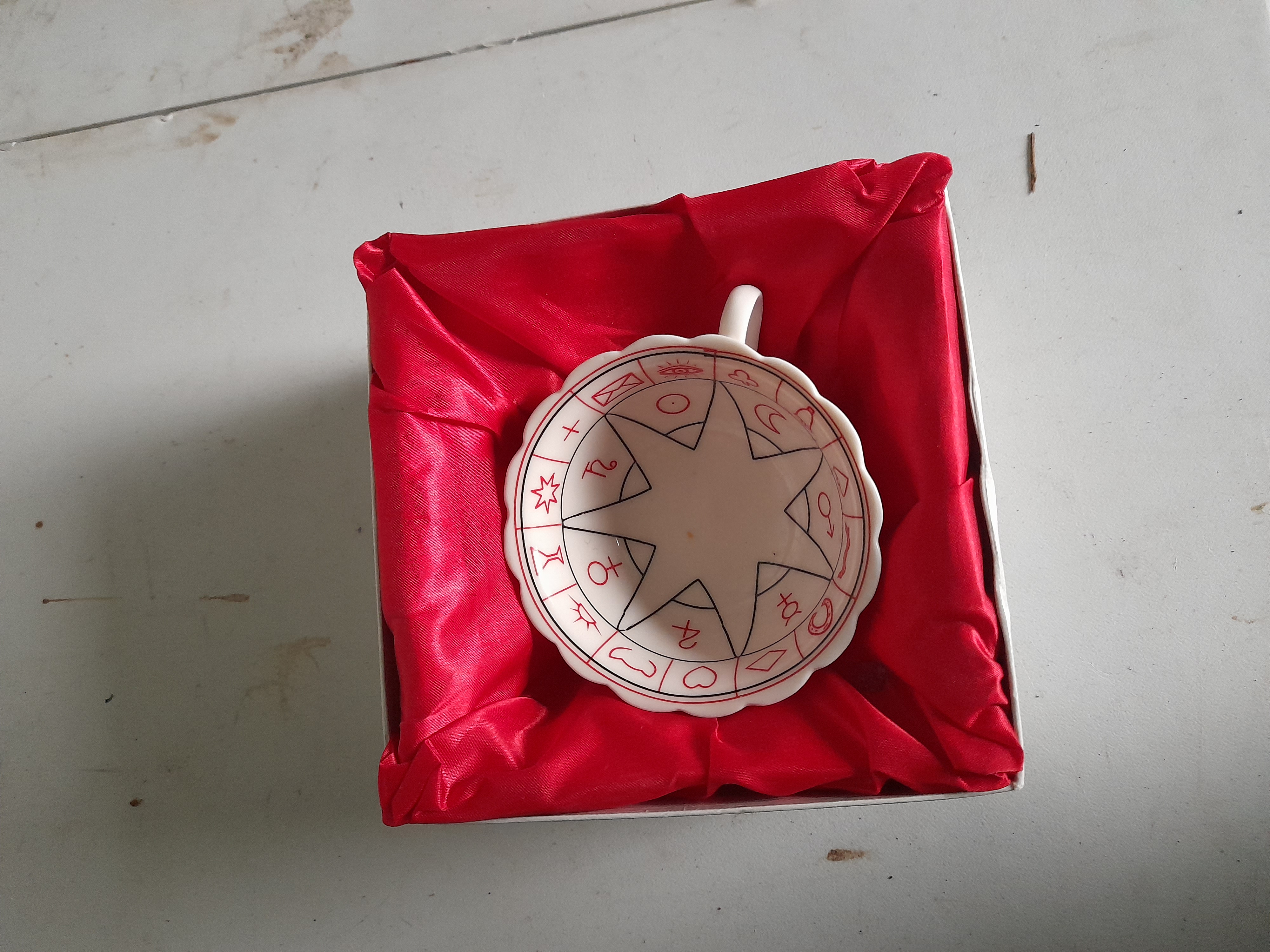 A contemporary tasseography or tea leaf reading set designed by Jane Lyle, comprising a teacup and matching saucer. The pieces are crafted from glazed white fine ceramic with elegant scalloped rims. The interior of the cup is decorated with red transfer-printed esoteric and planetary symbols, including a heart, an eye, and celestial icons, all centred around a black eight-pointed star. The saucer features the twelve signs of the zodiac rendered in black within red-lined segments, encircling a matching central star motif. This set is a modern revival of traditional Victorian fortune-telling ceramics. The items are presented in their original packaging, with the cup housed in a red satin-lined presentation box. Cup diameter approximately 10 cm; Saucer diameter approximately 14.5 cm.