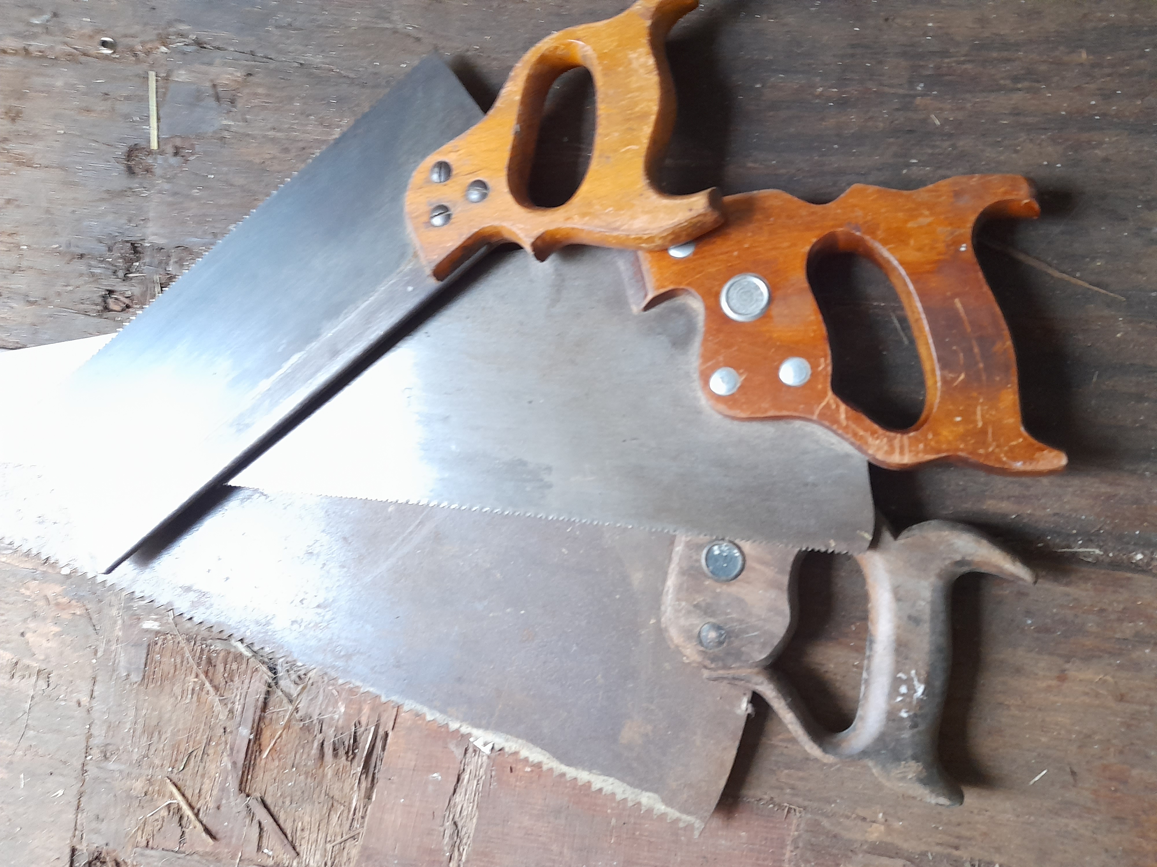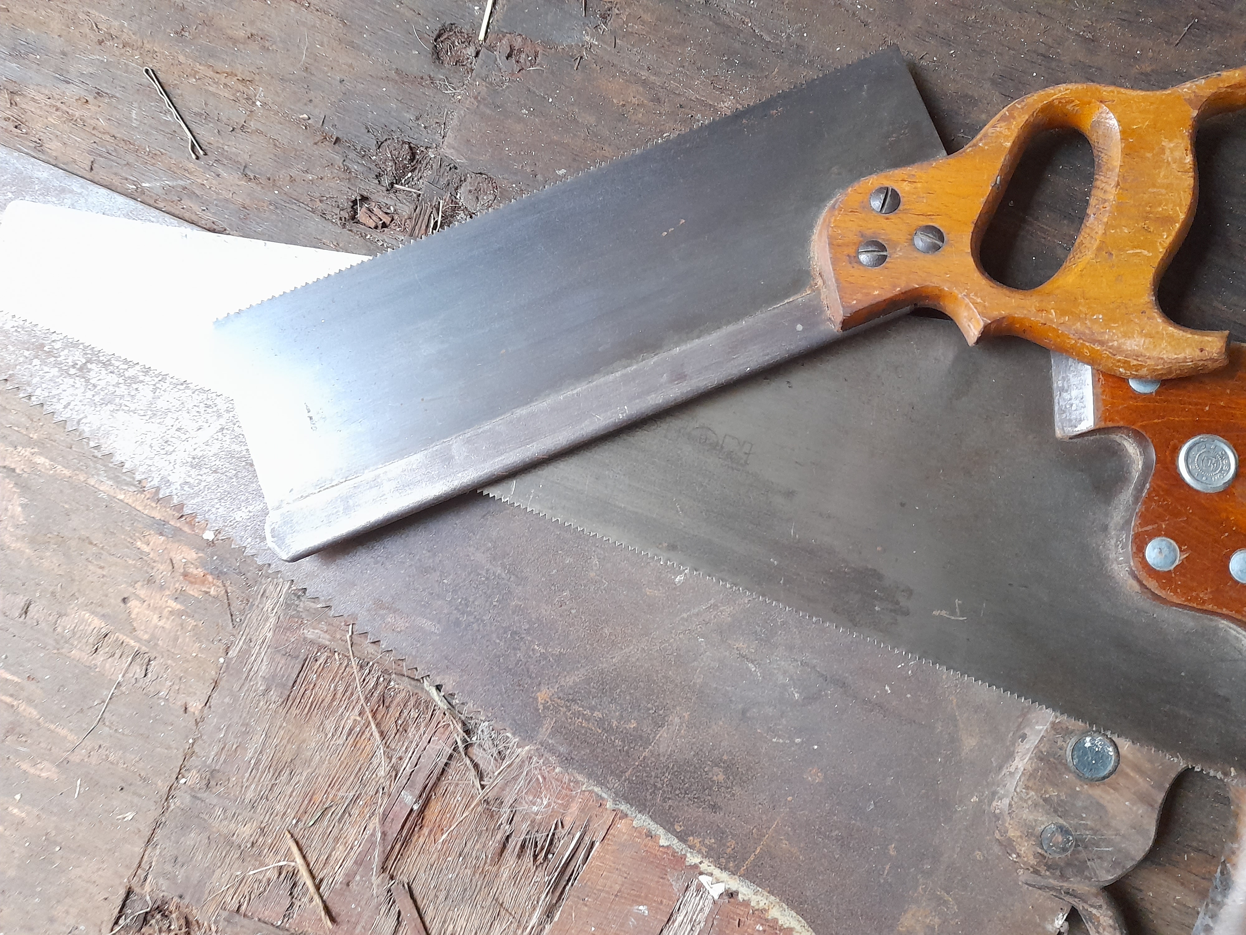 A collection of handsaws featuring silver-toned metal blades and brown wooden handles, including a backsaw and one saw with a circular medallion.
