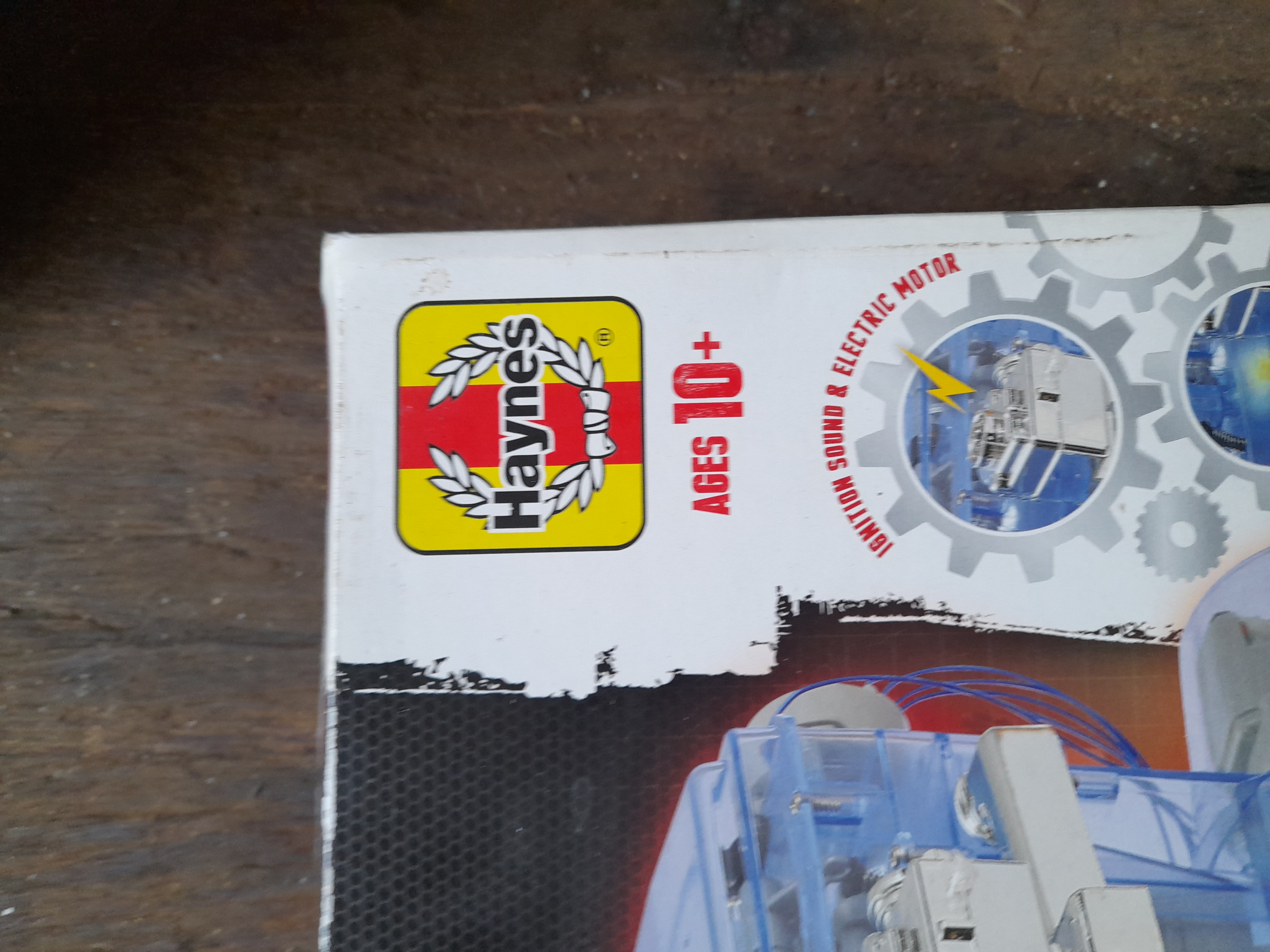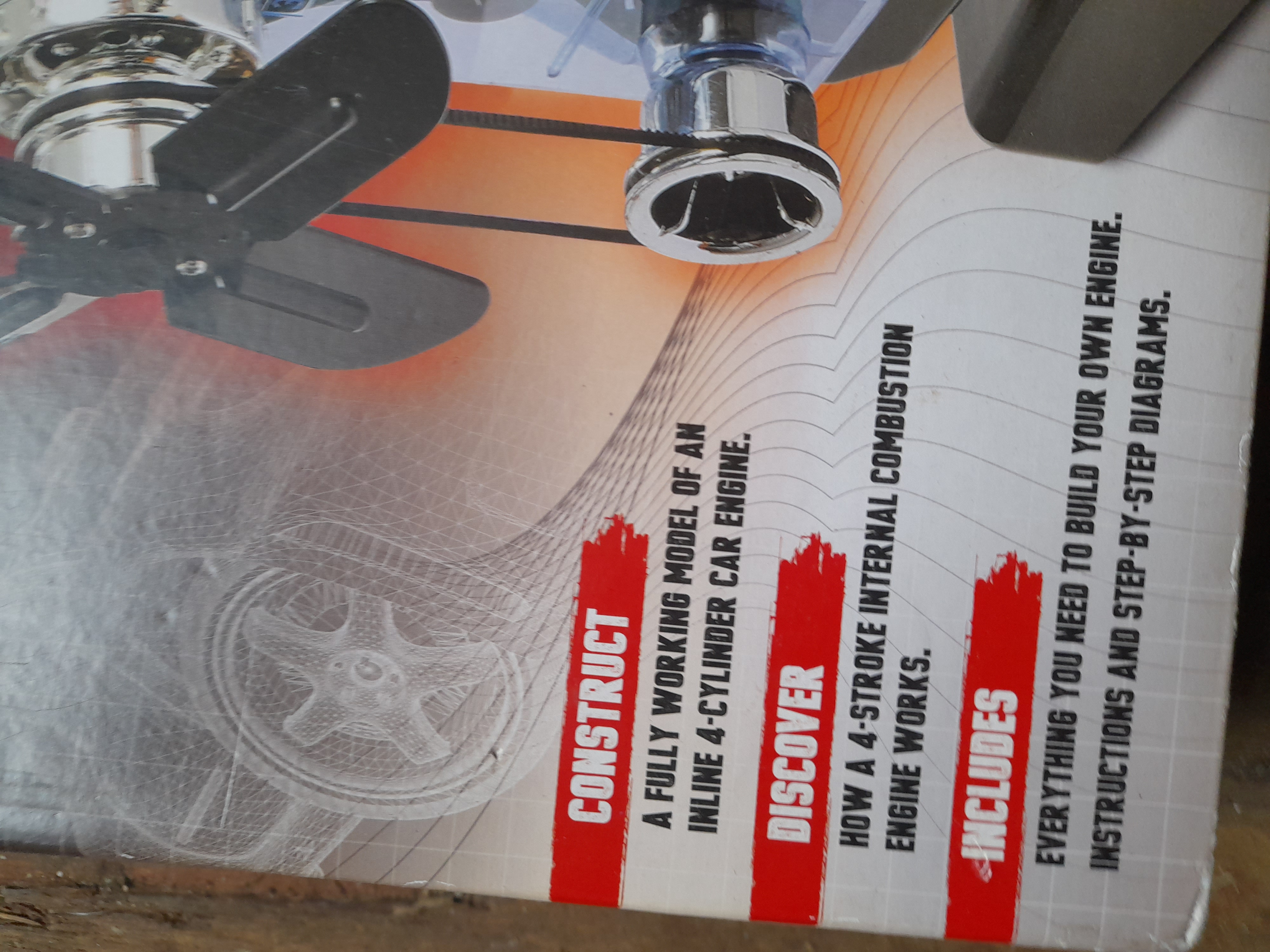 A boxed Haynes Machine Works 4-cylinder internal combustion engine model kit featuring over 100 parts in a multicoloured box.