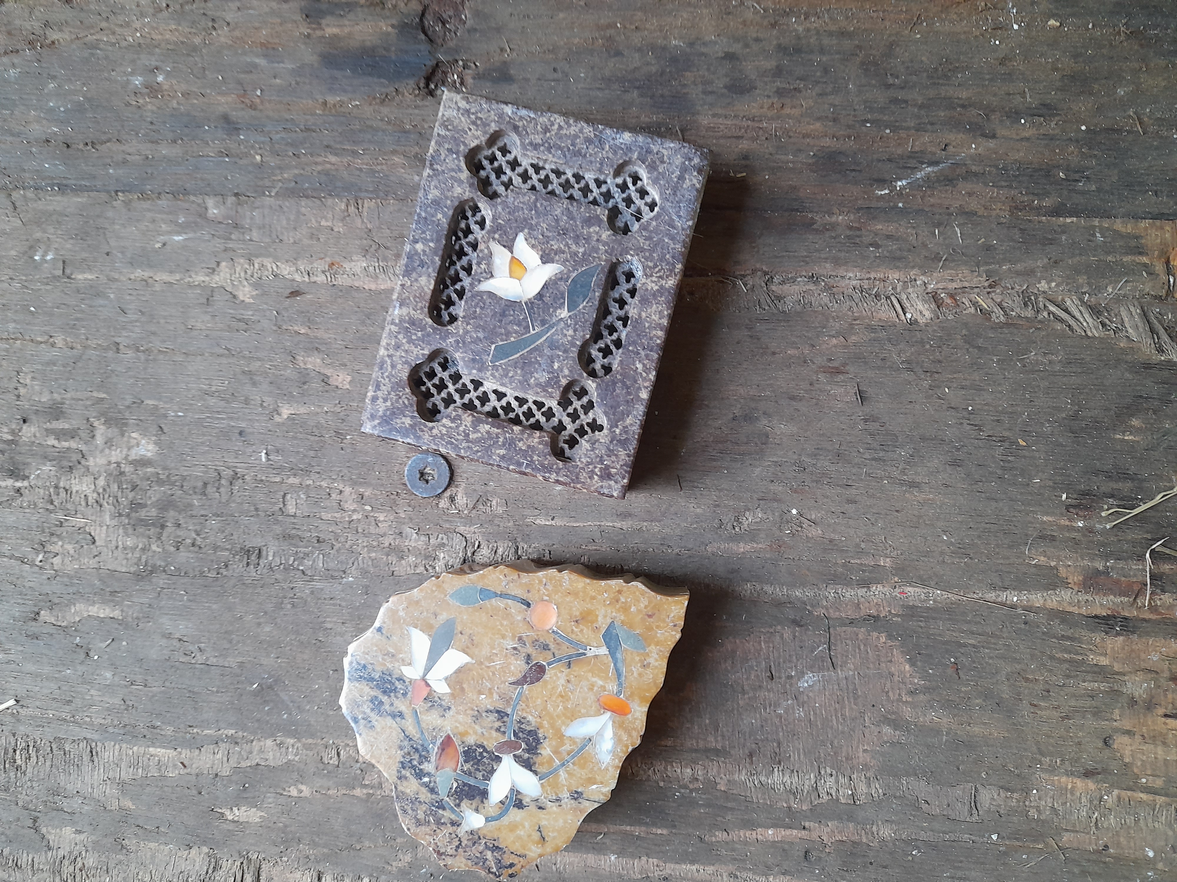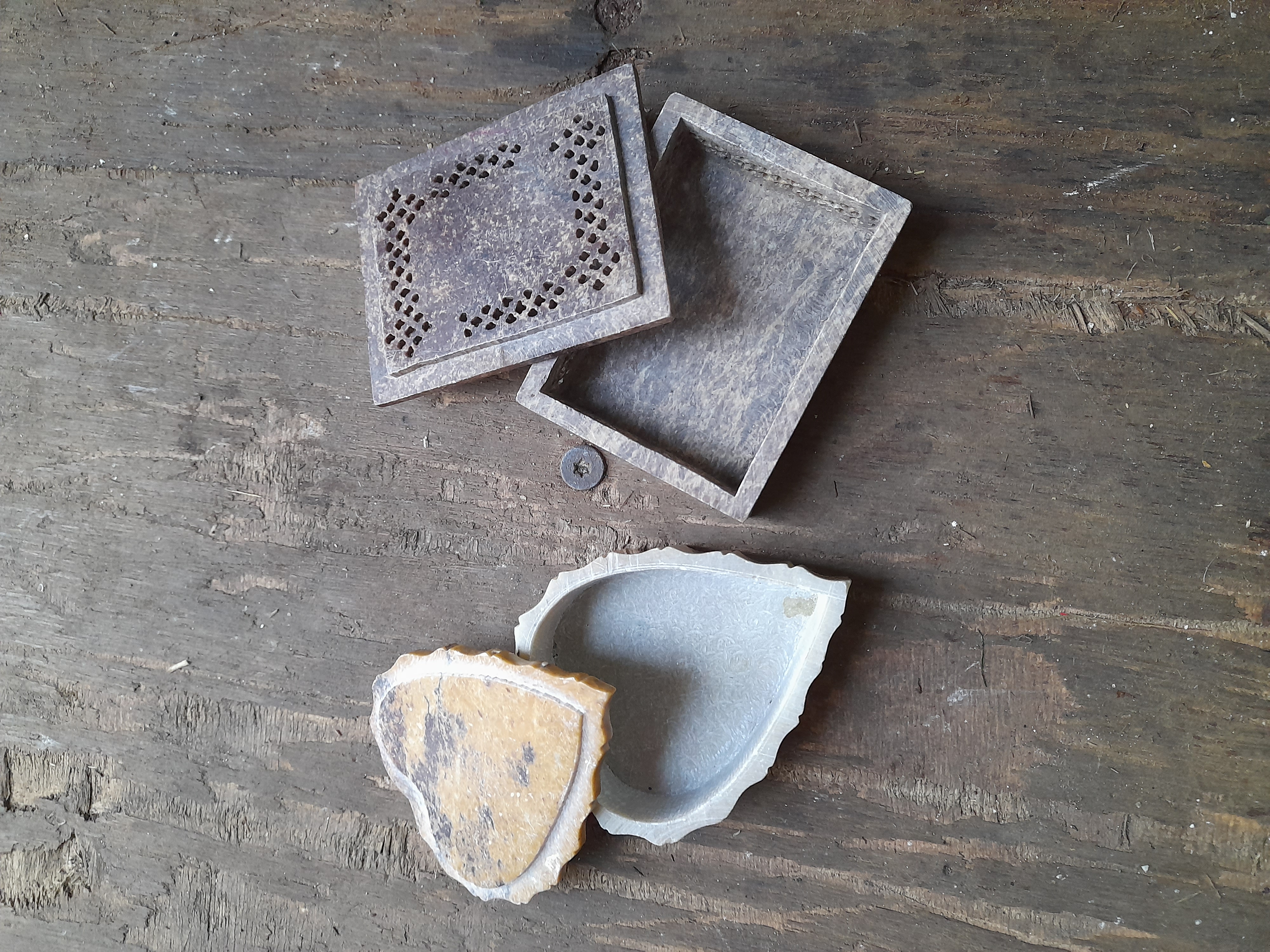 Two soapstone trinket boxes including a rectangular dark grey example with a pierced lid and floral inlay, and a yellow leaf-shaped box with multi-coloured floral inlay.