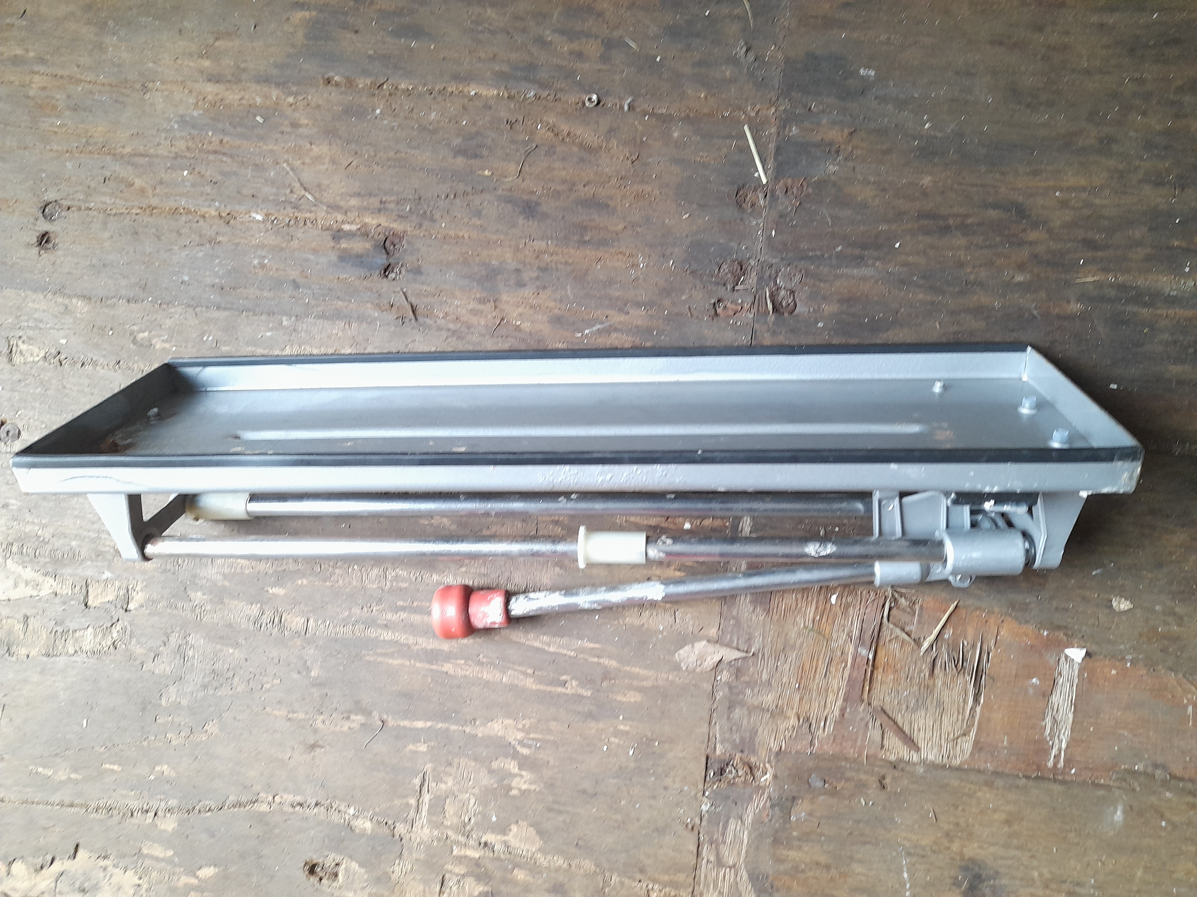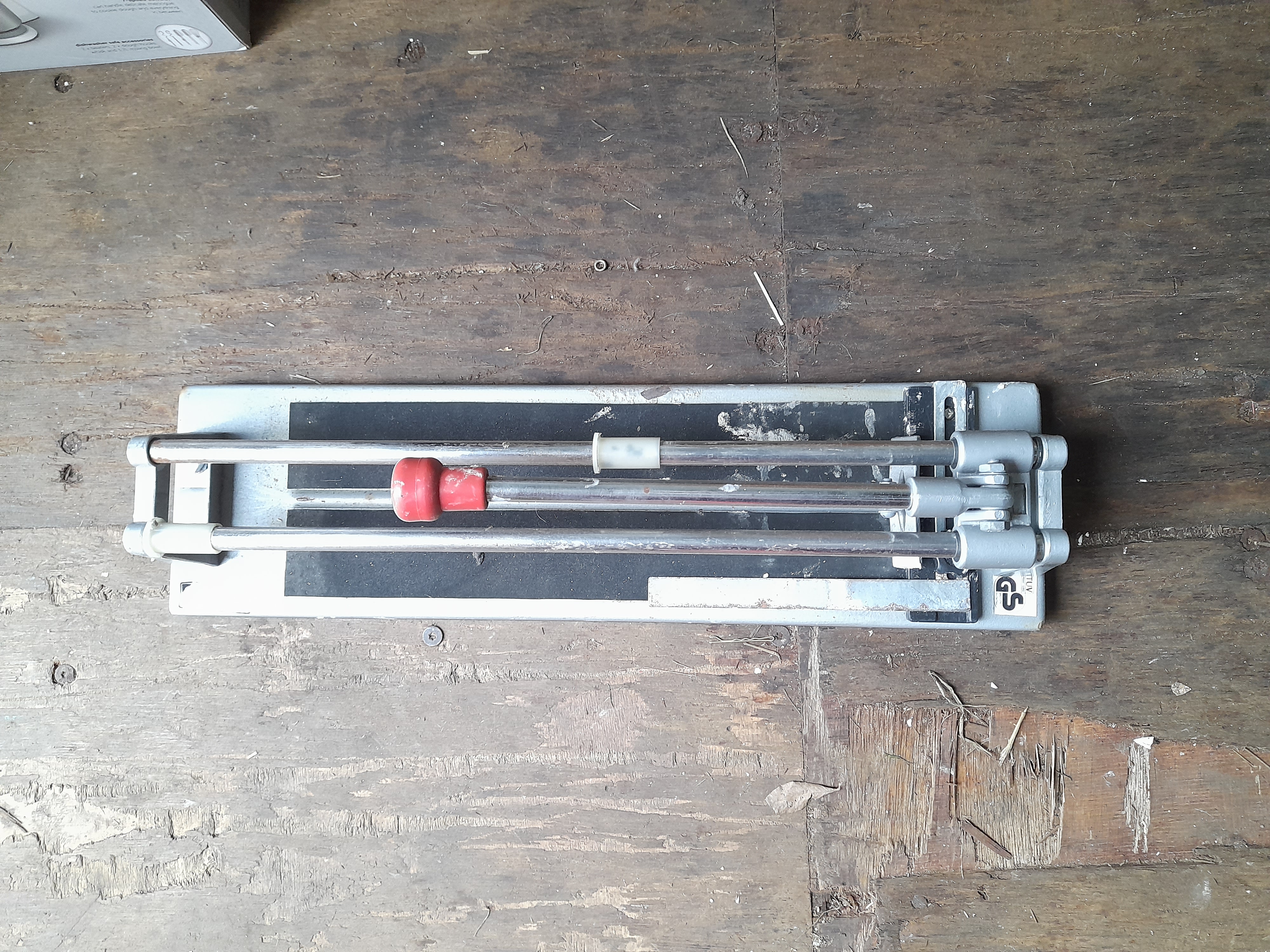 A manual floor tile cutter featuring a grey and silver metal body with a red handle knob and a visible GS logo on the base.