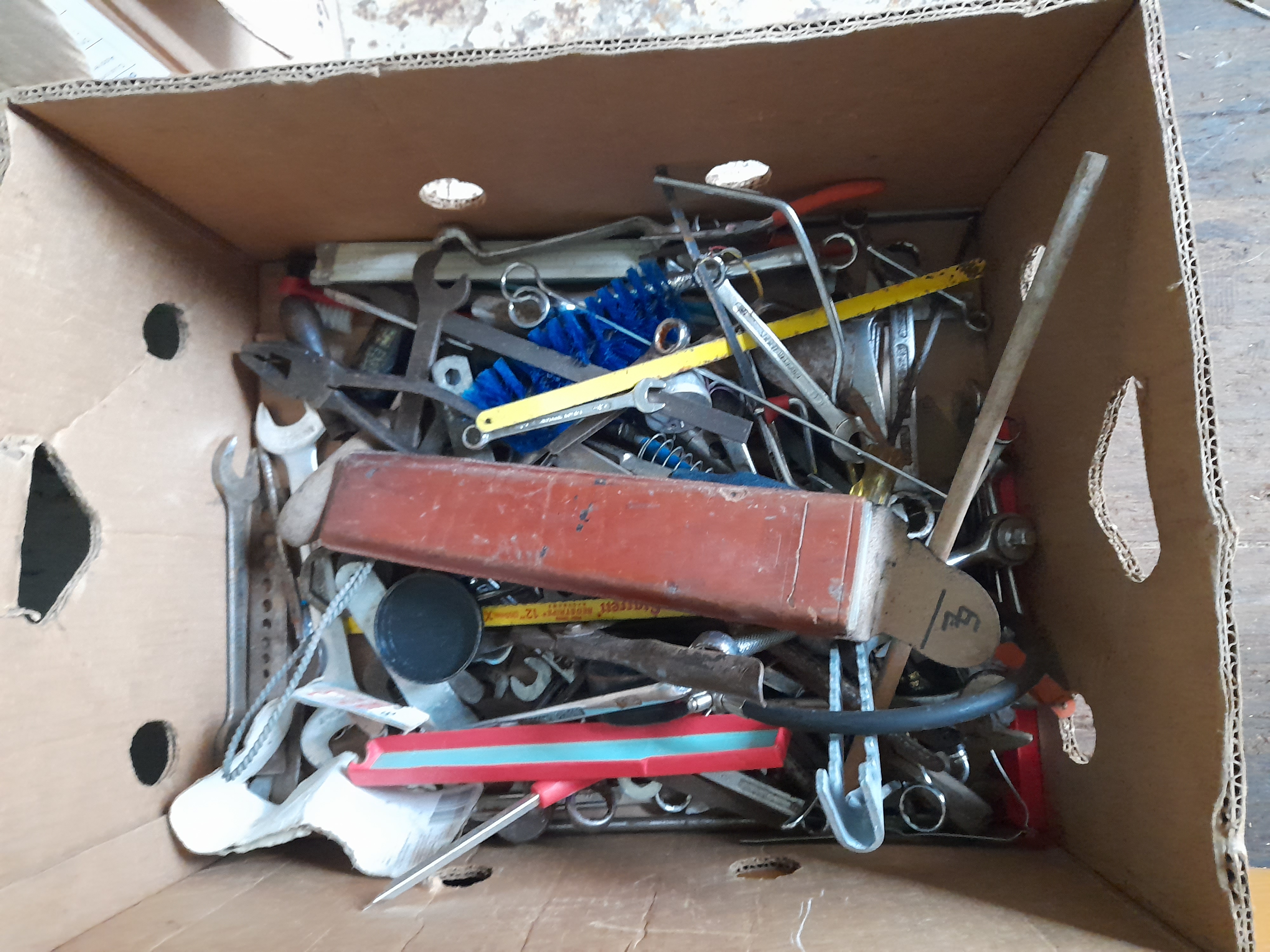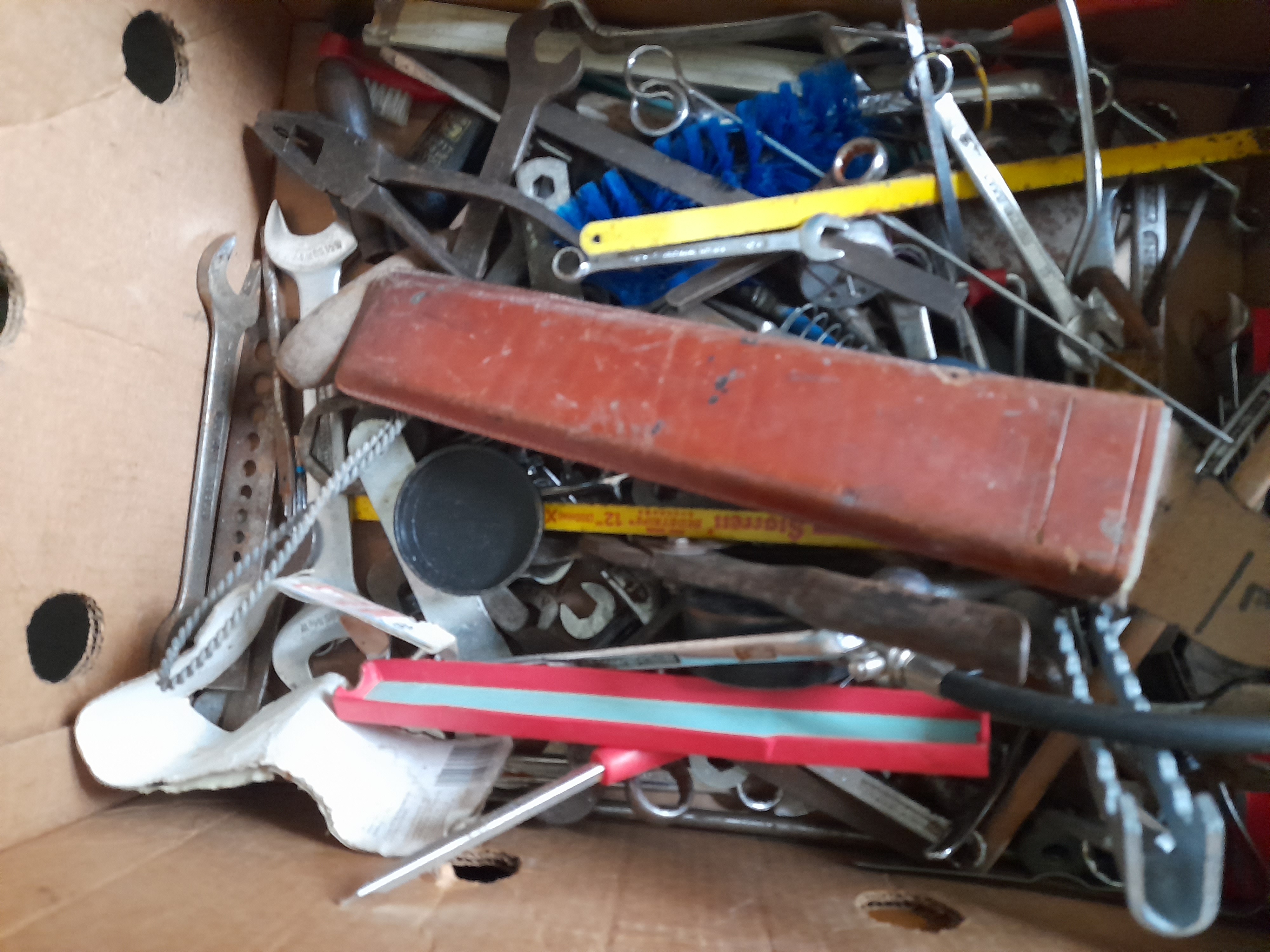 A collection of various hand tools including spanners, pliers, brushes, and a yellow Starrett 12 inch hacksaw blade.