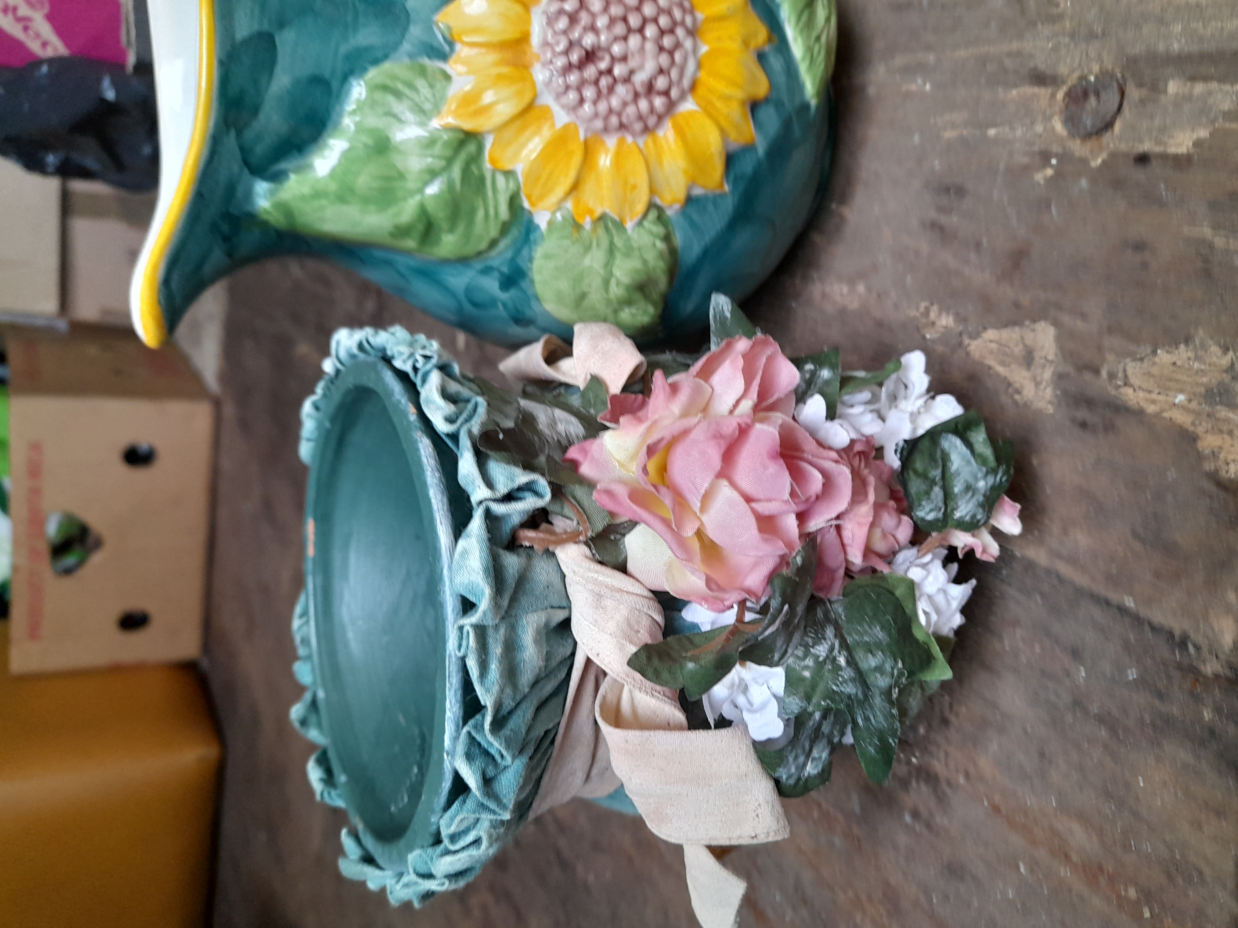 A trio of decorative items comprising a teal ceramic pitcher with a raised sunflower motif, a clear glass swan-shaped vessel, and a ruffled teal container adorned with artificial pink and white flowers.
