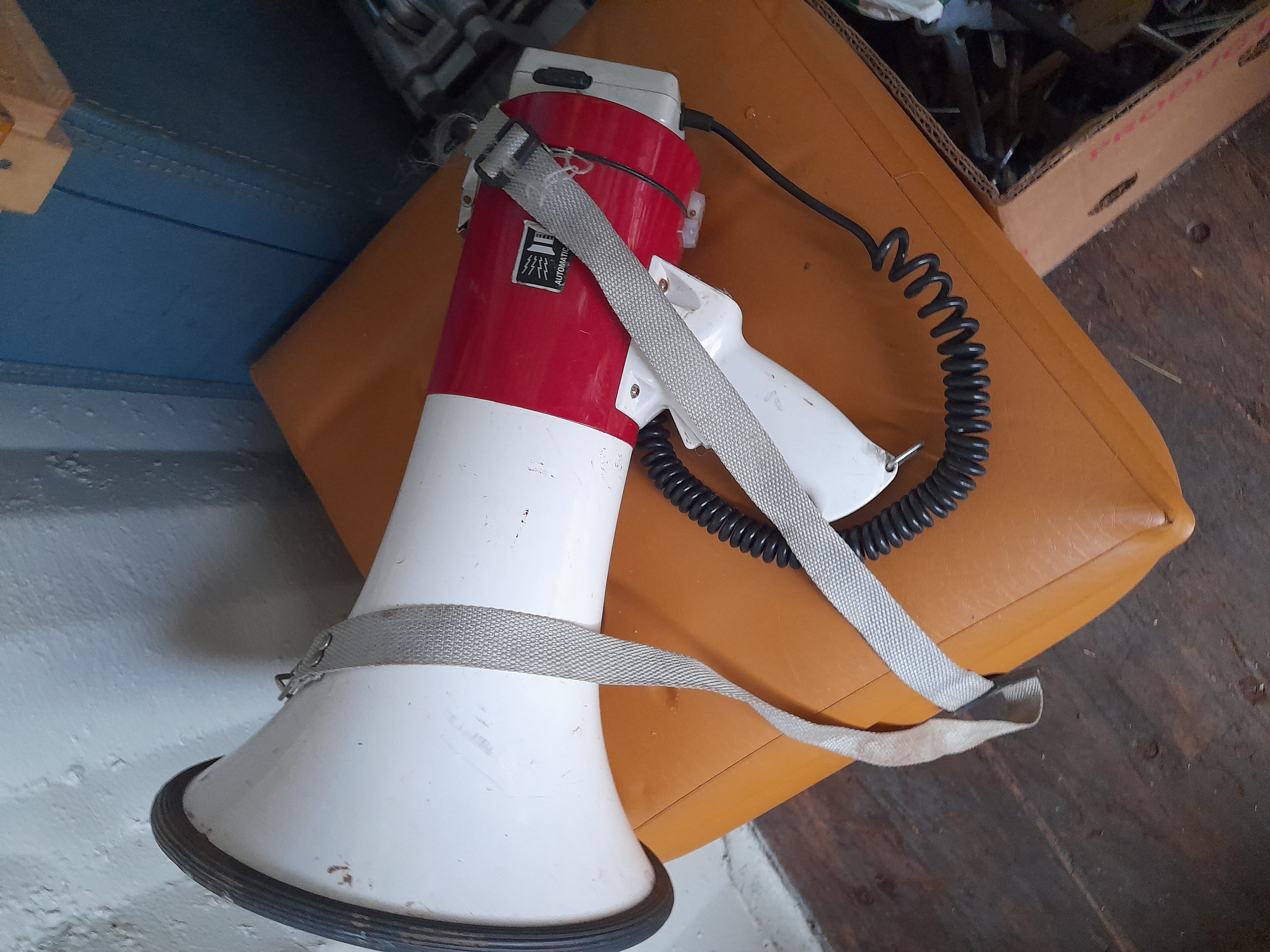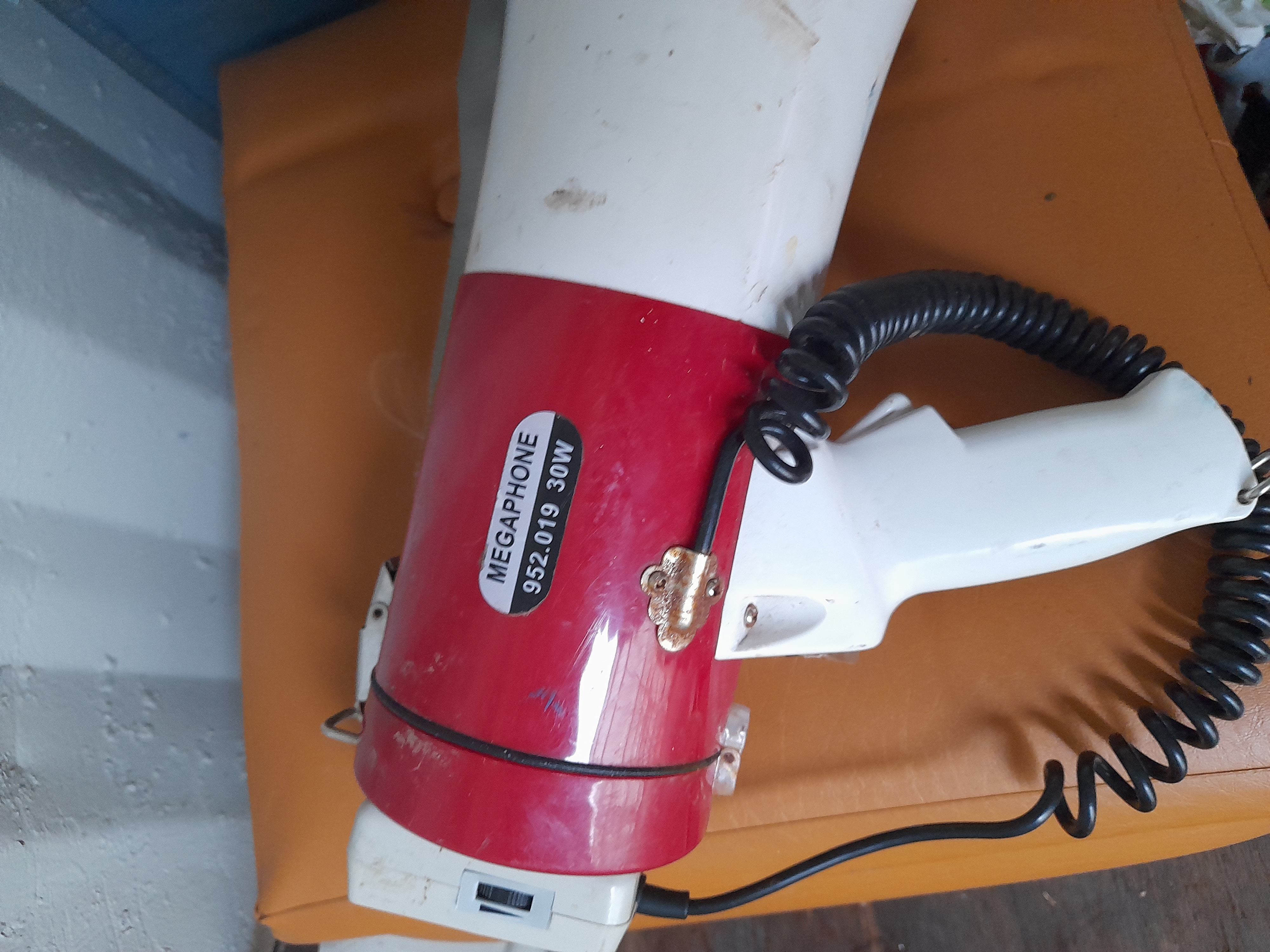 A red and white 30W handheld power megaphone featuring an attached microphone, shoulder strap, and model label 952.019.