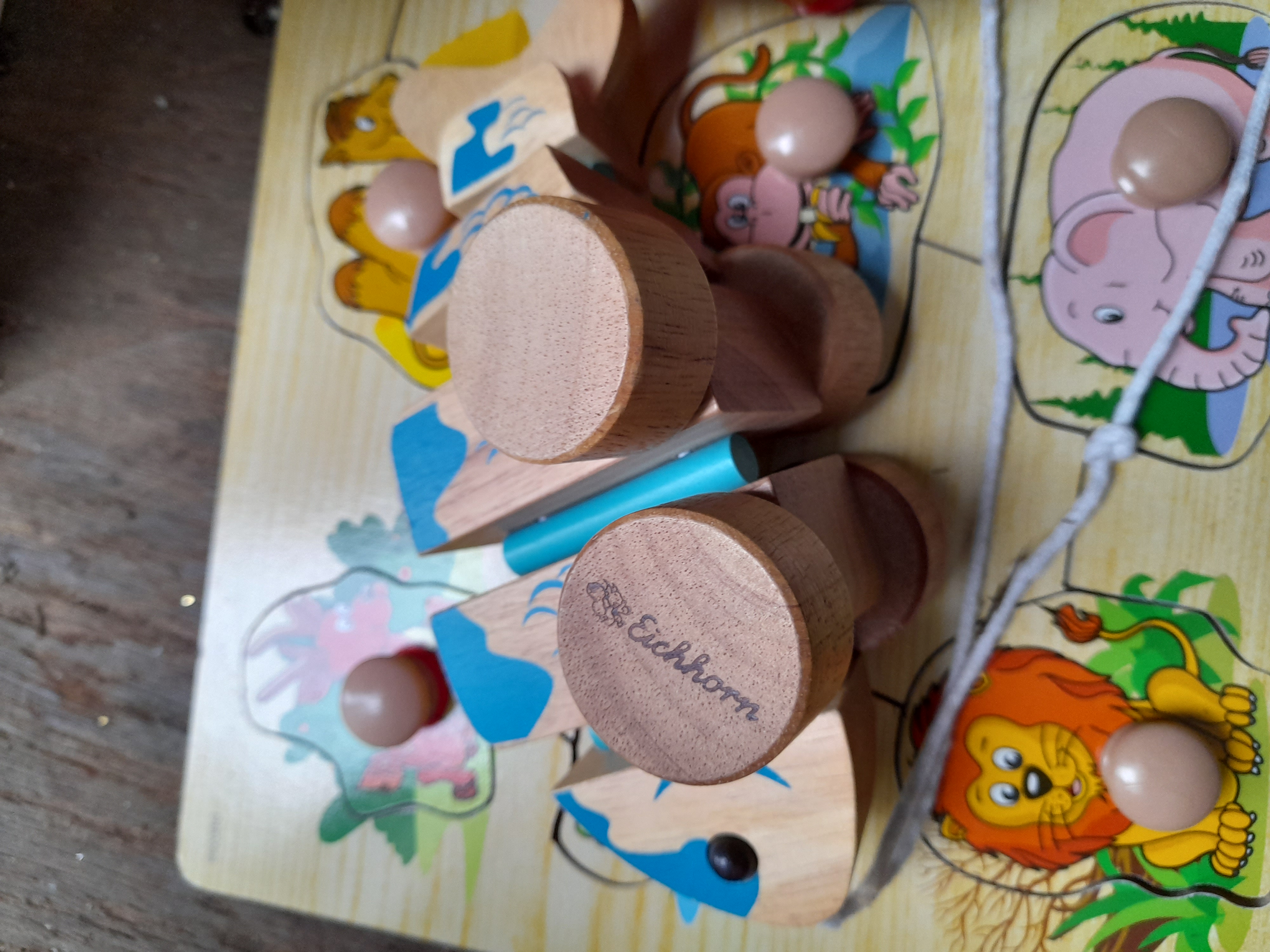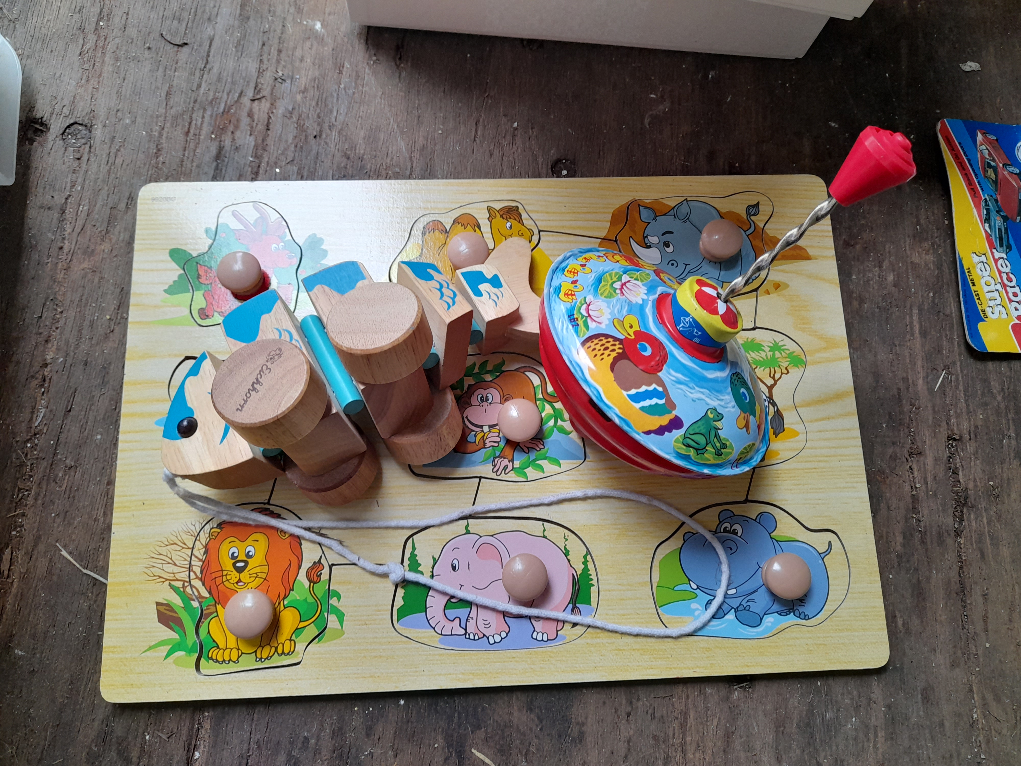 A collection of multi-coloured children’s toys including a wooden animal jumbo knob puzzle, an Eichhorn wooden pull toy, and an illustrated tin spinning top.