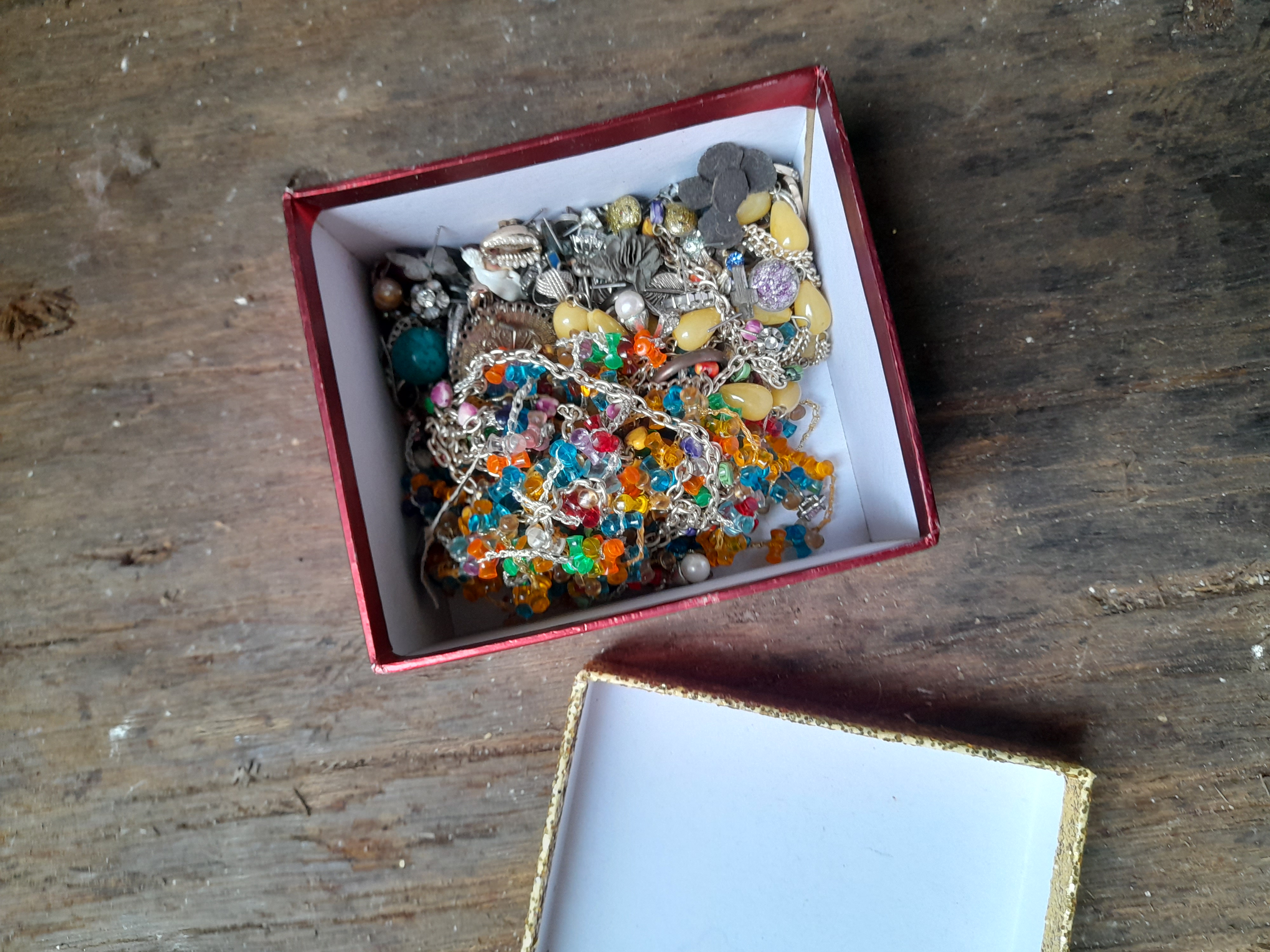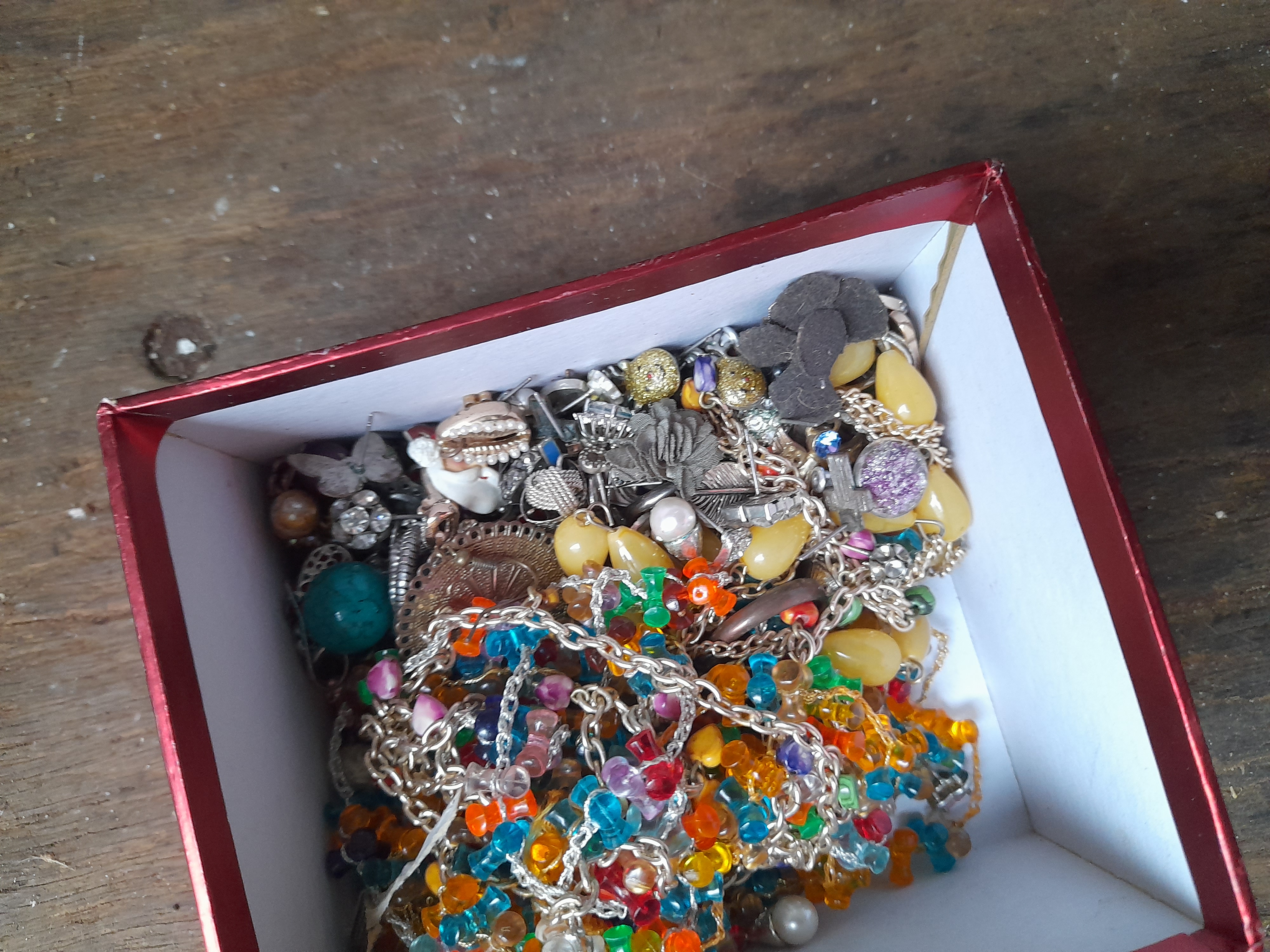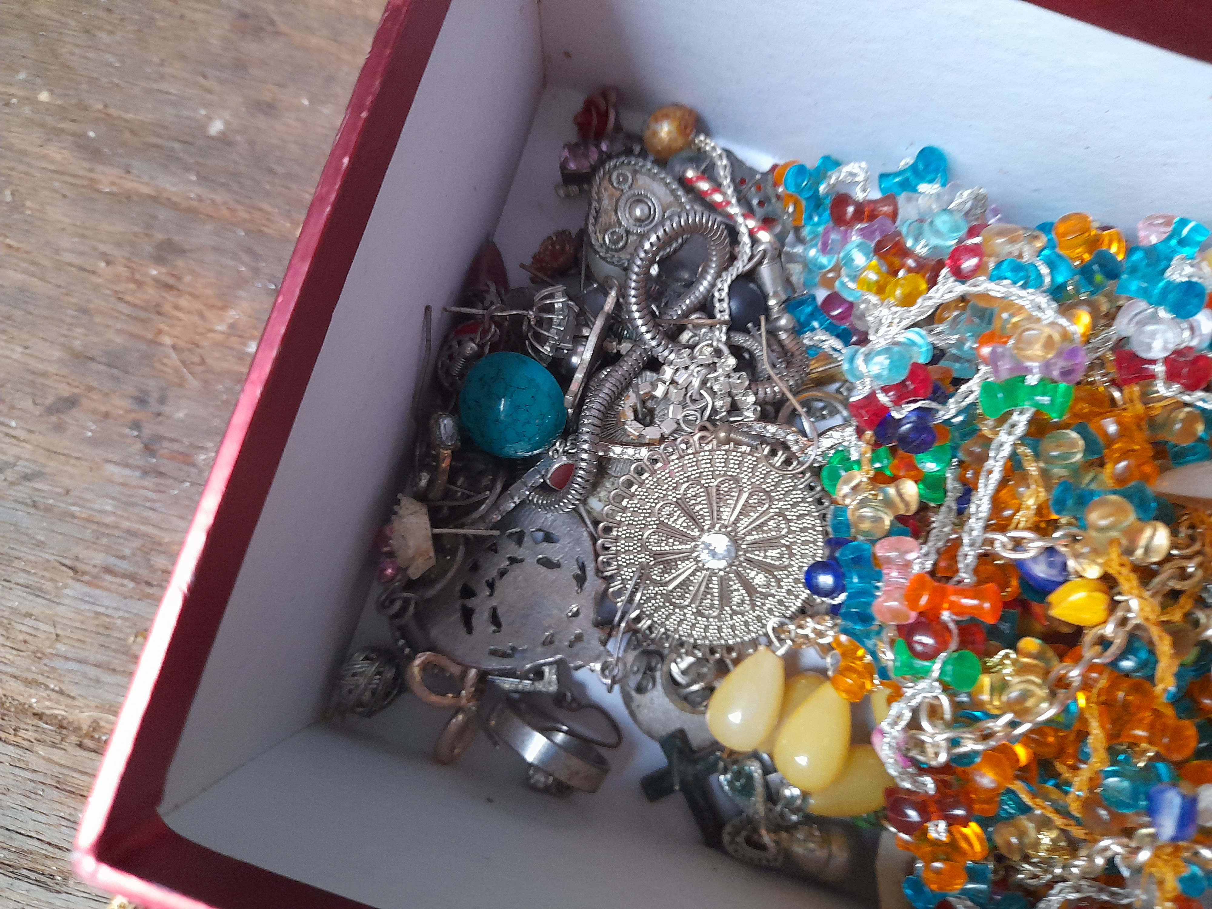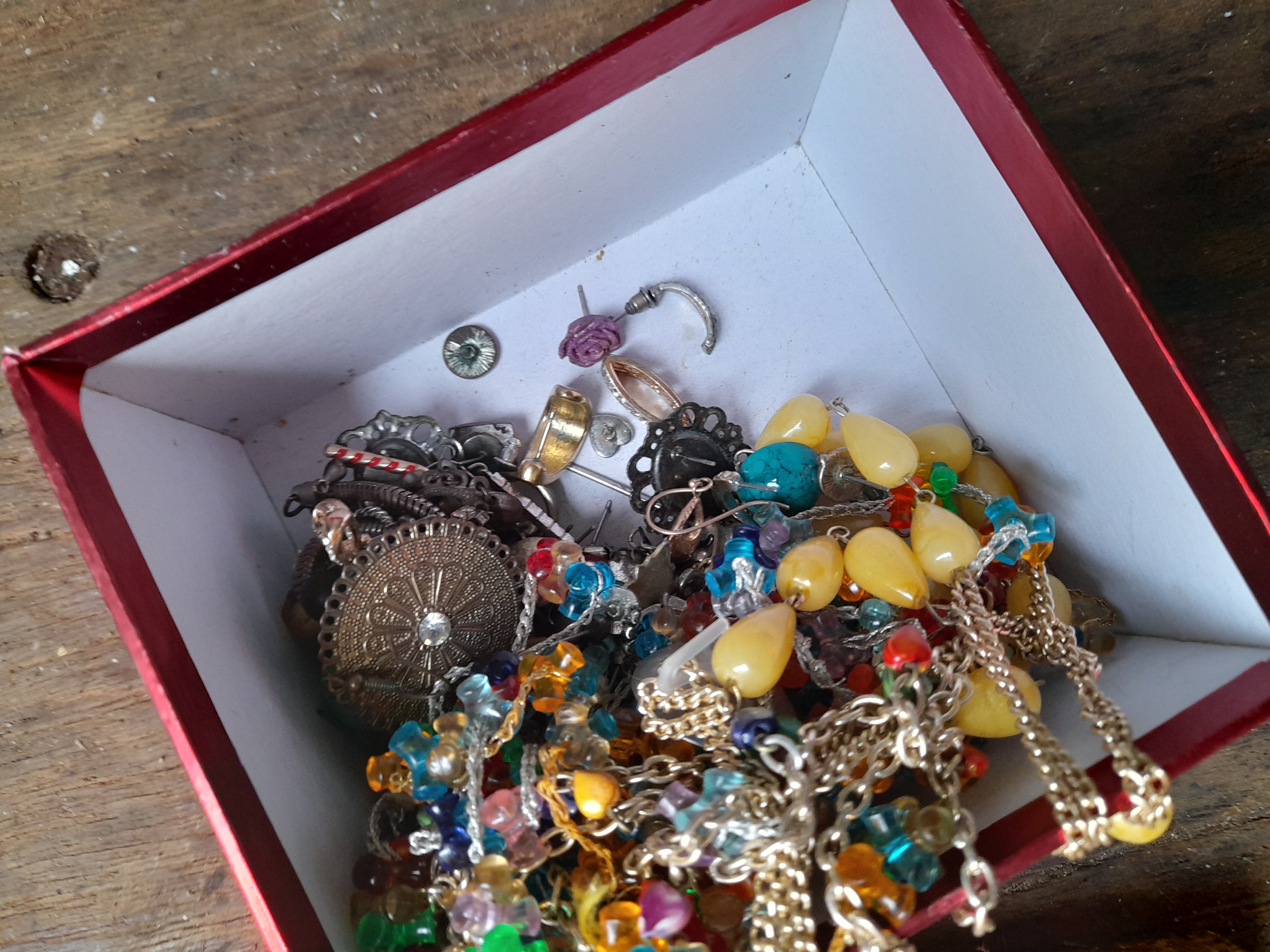 A collection of multicoloured and silver-tone costume jewellery, including beaded necklaces, various earrings, and pendants, housed in a small red box.