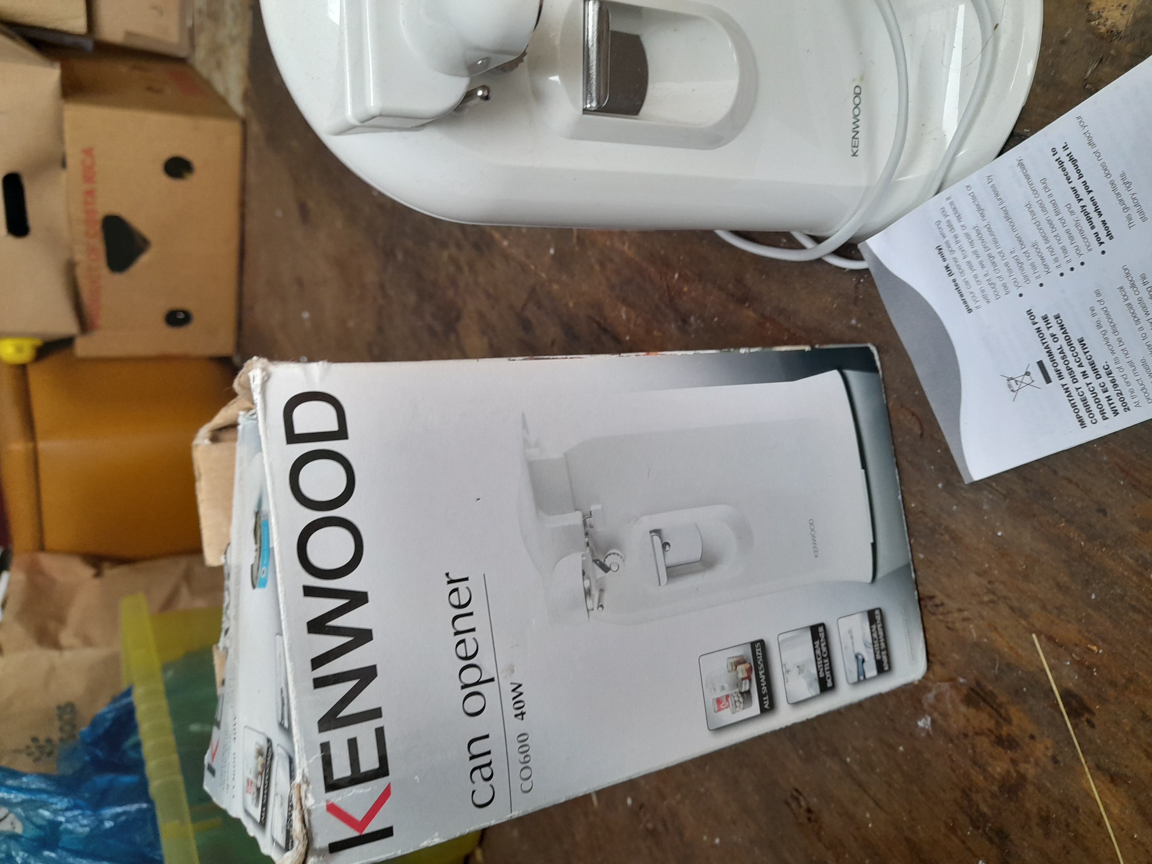 A white Kenwood CO600 40W electric can opener accompanied by its original cardboard packaging and instructional documentation.