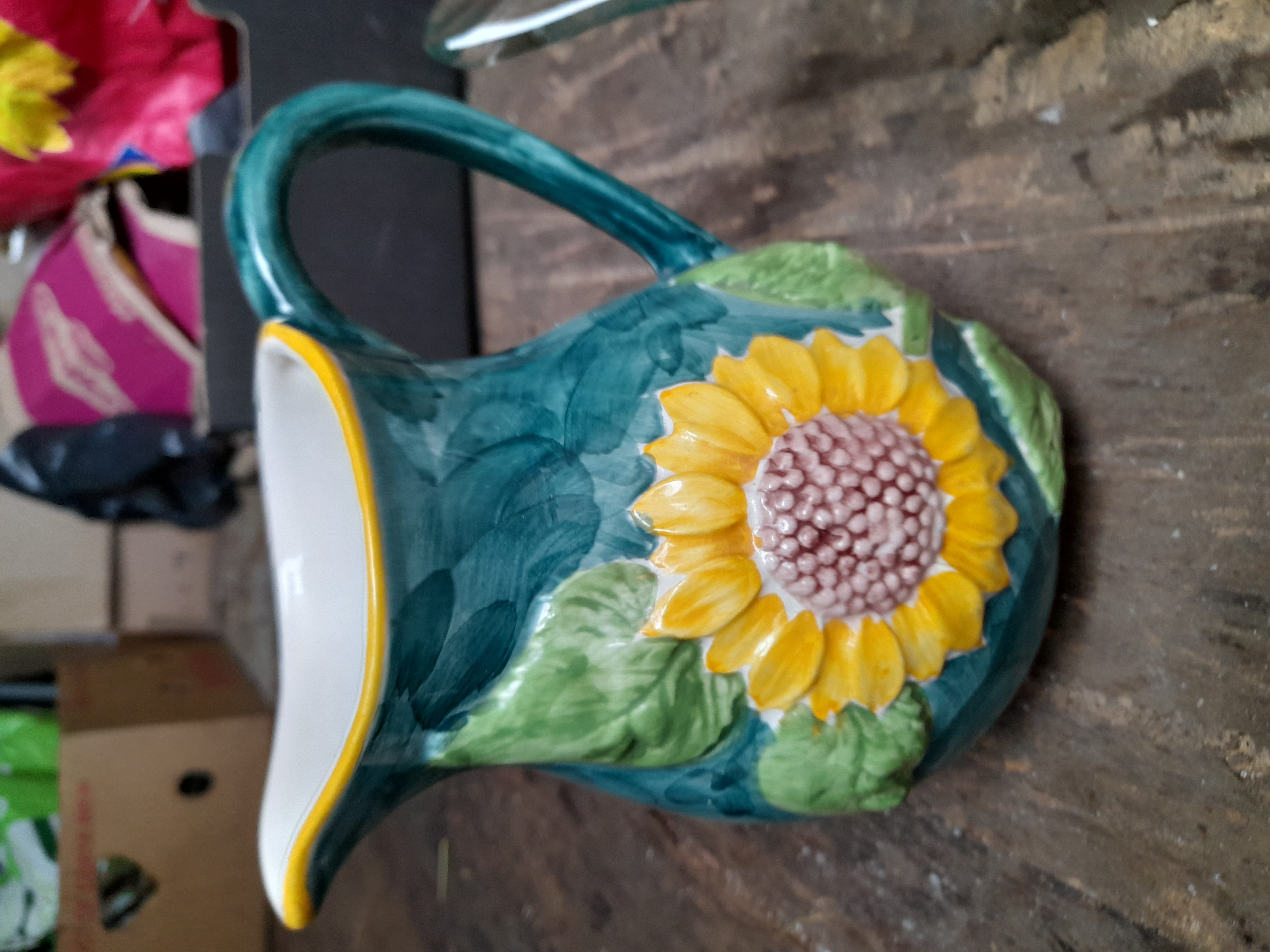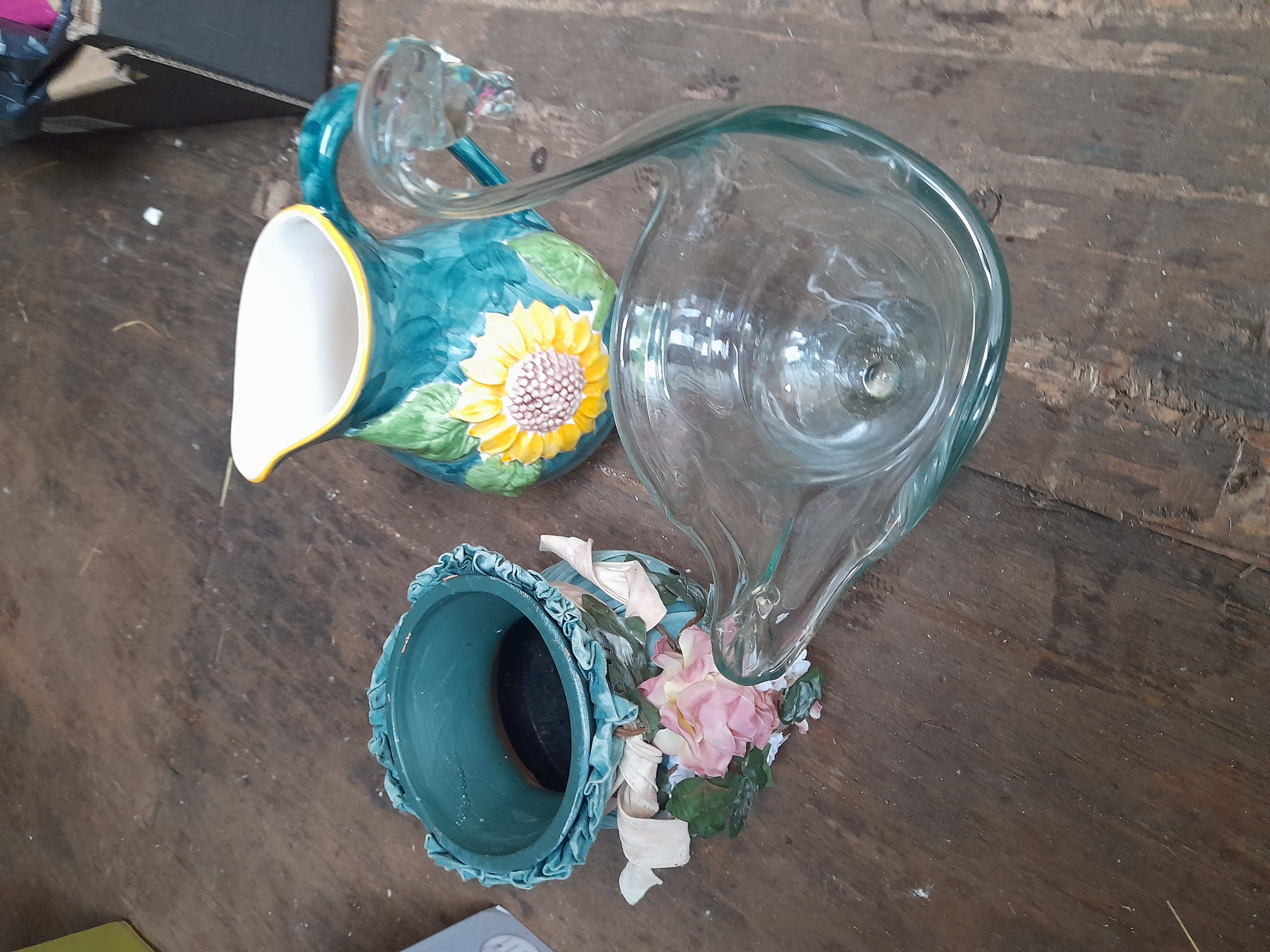 A trio of decorative items comprising a teal ceramic pitcher with a raised sunflower motif, a clear glass swan-shaped vessel, and a ruffled teal container adorned with artificial pink and white flowers.