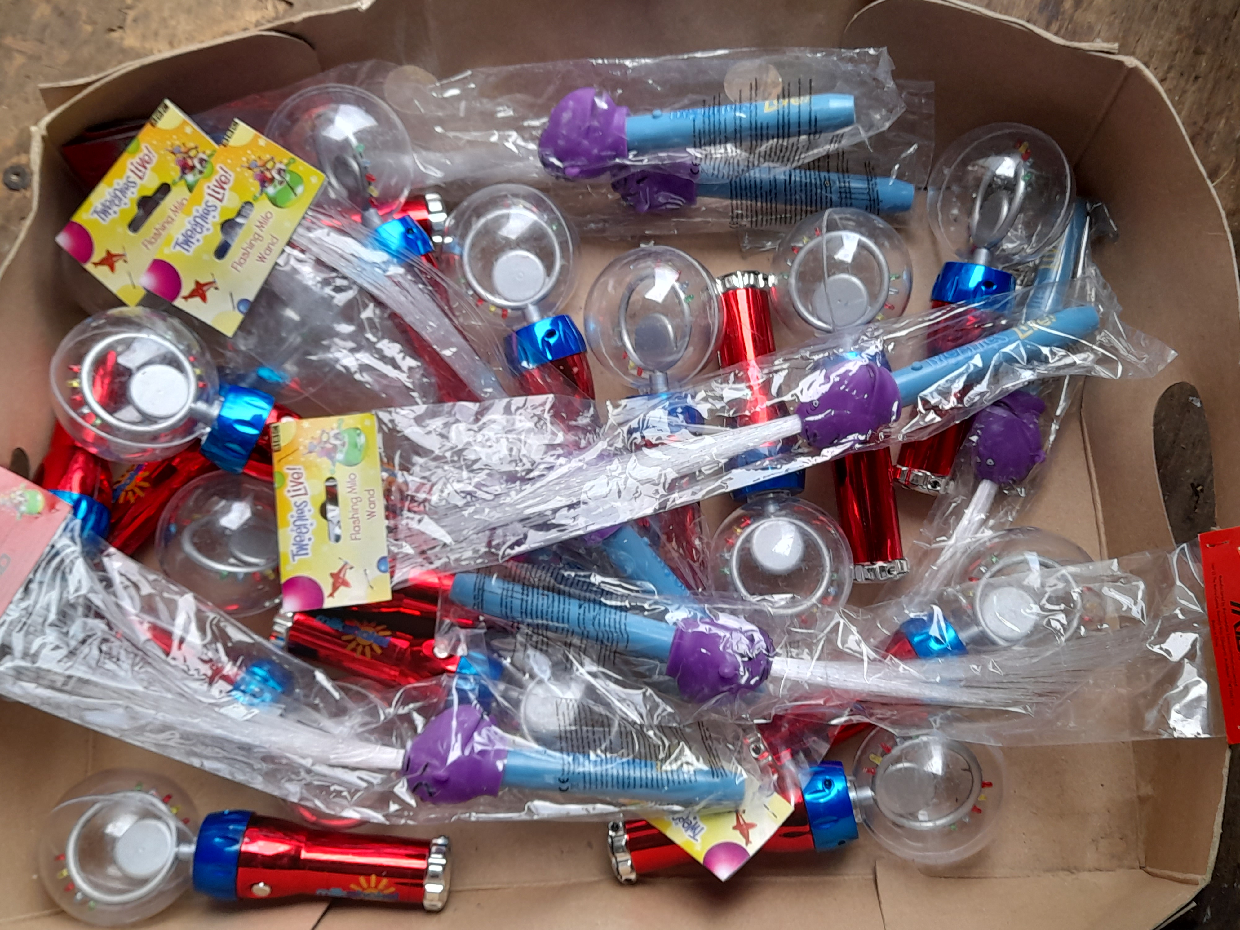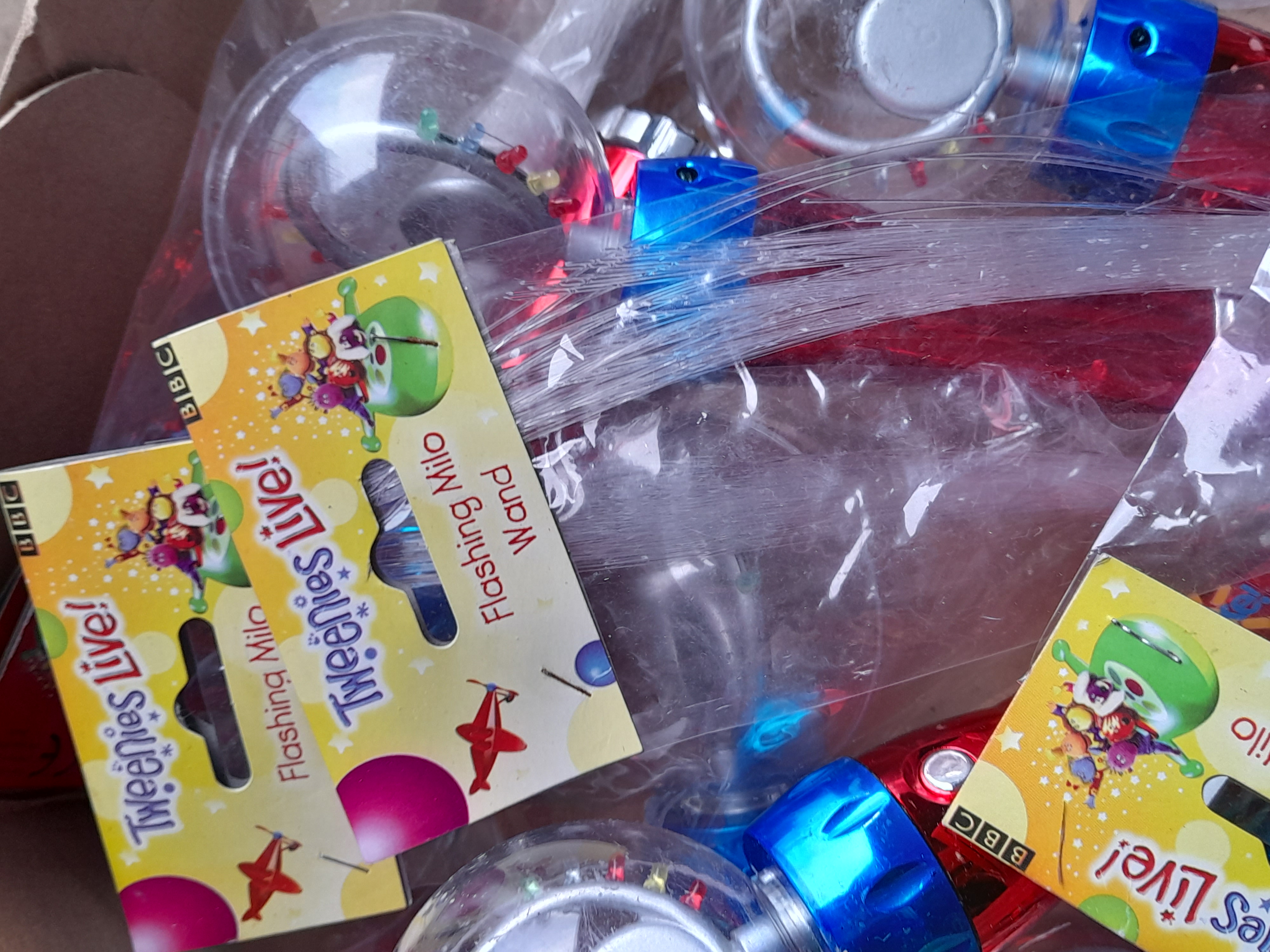 A collection of BBC branded Tweenies Live Flashing Milo wands in various colours including red, blue, and purple, many in original plastic packaging.