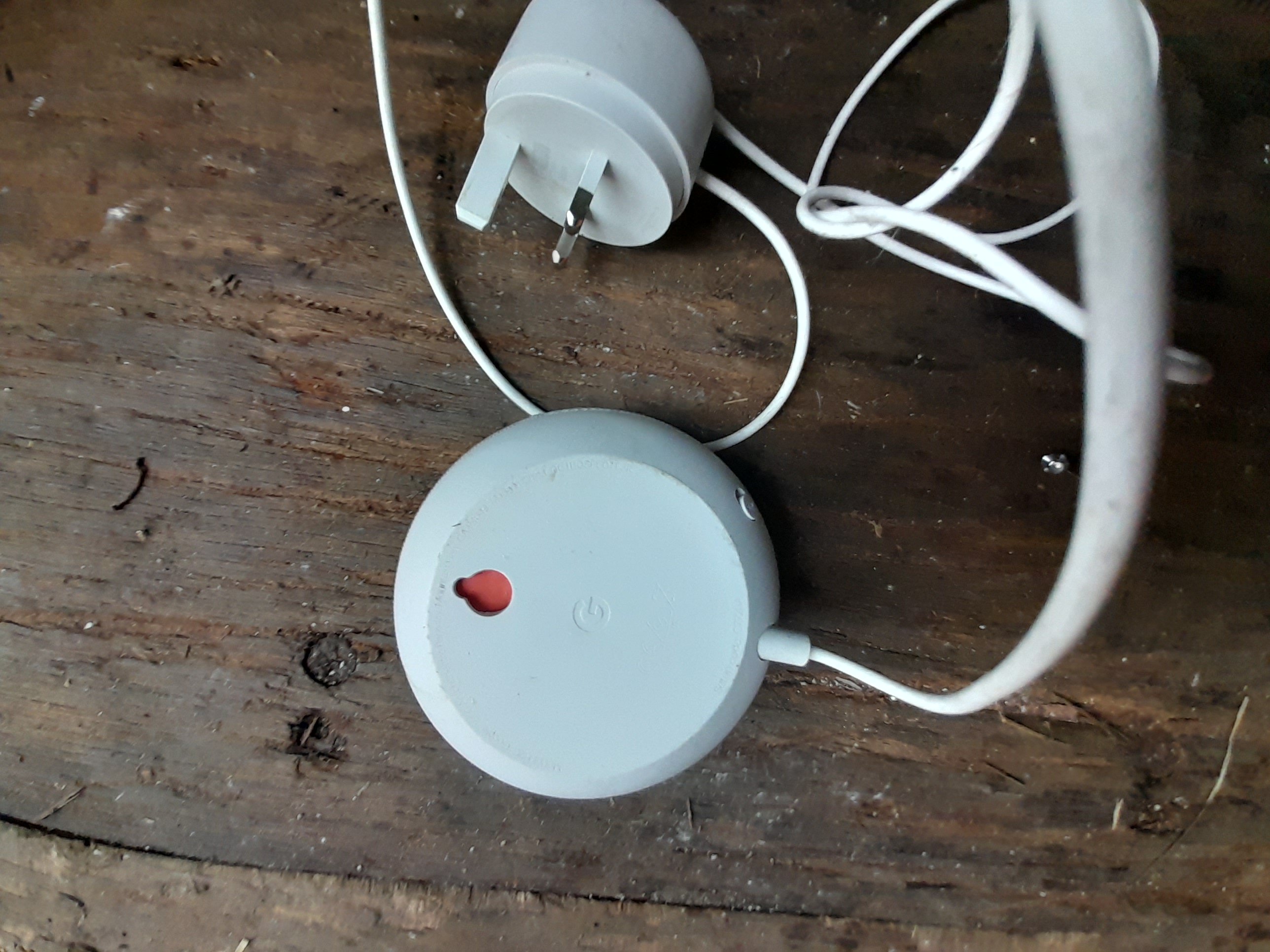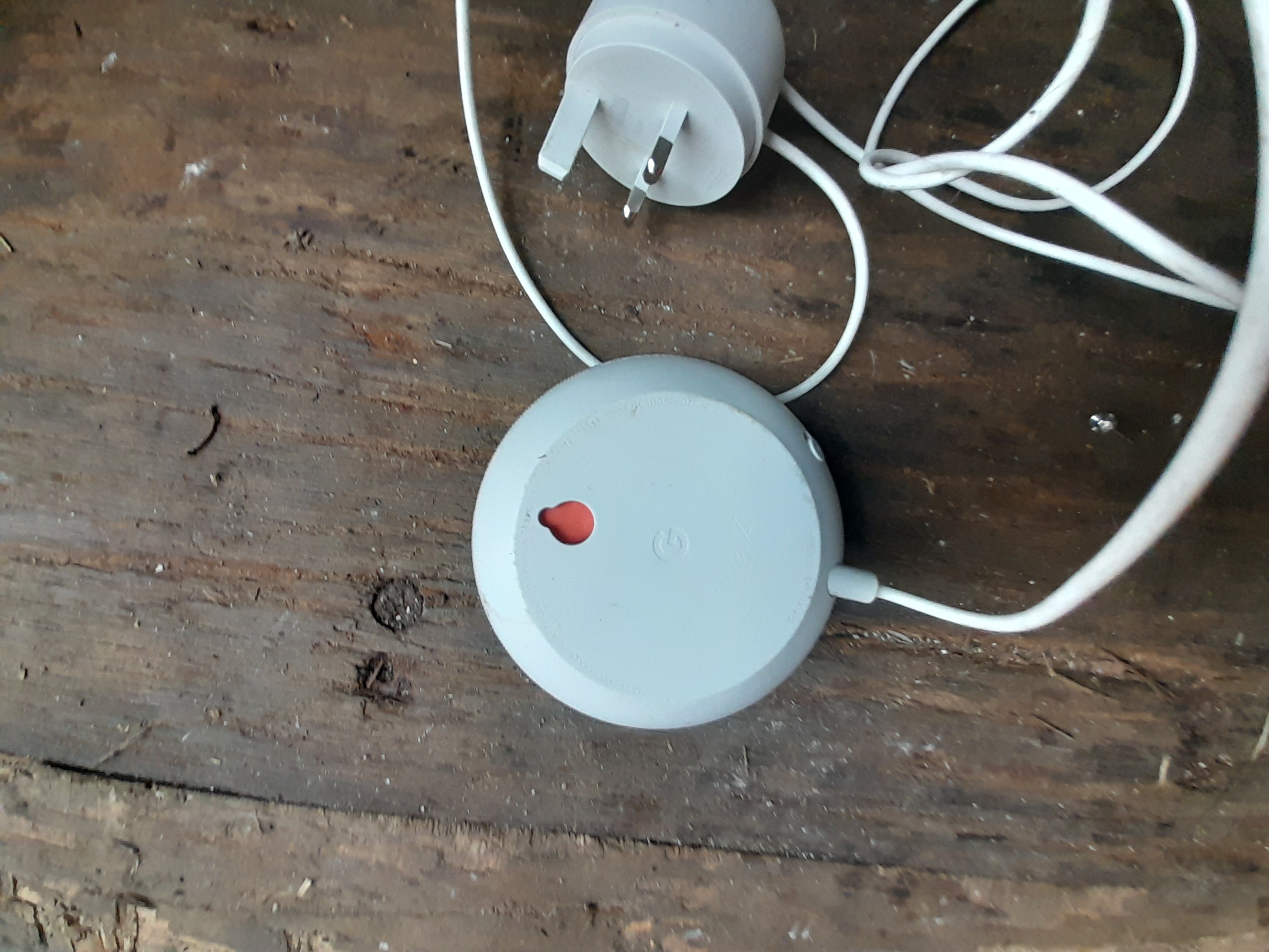A light grey Google Nest Mini smart speaker featuring a fabric top and a Google logo on the base, accompanied by its power cord and UK mains adapter.
