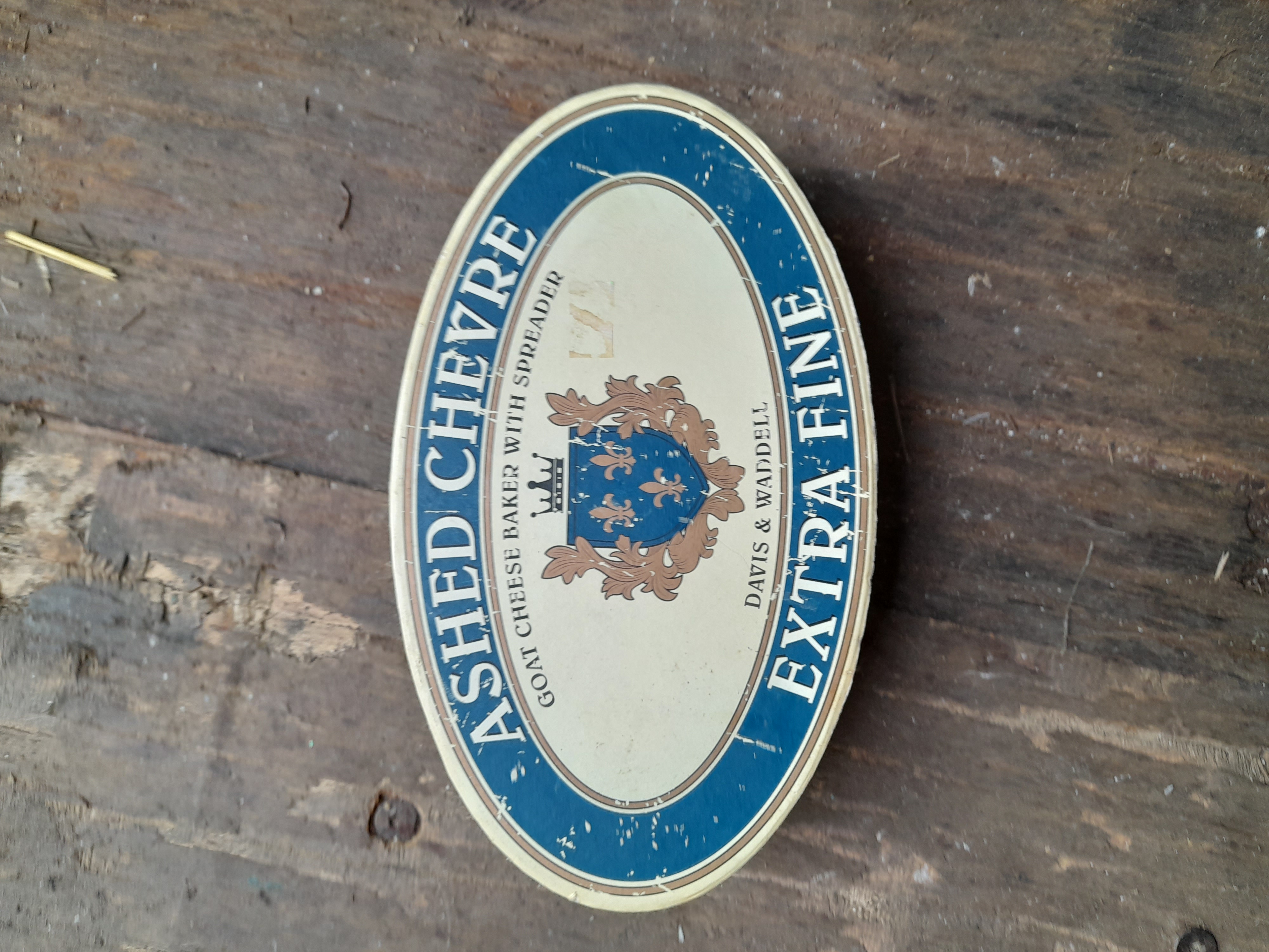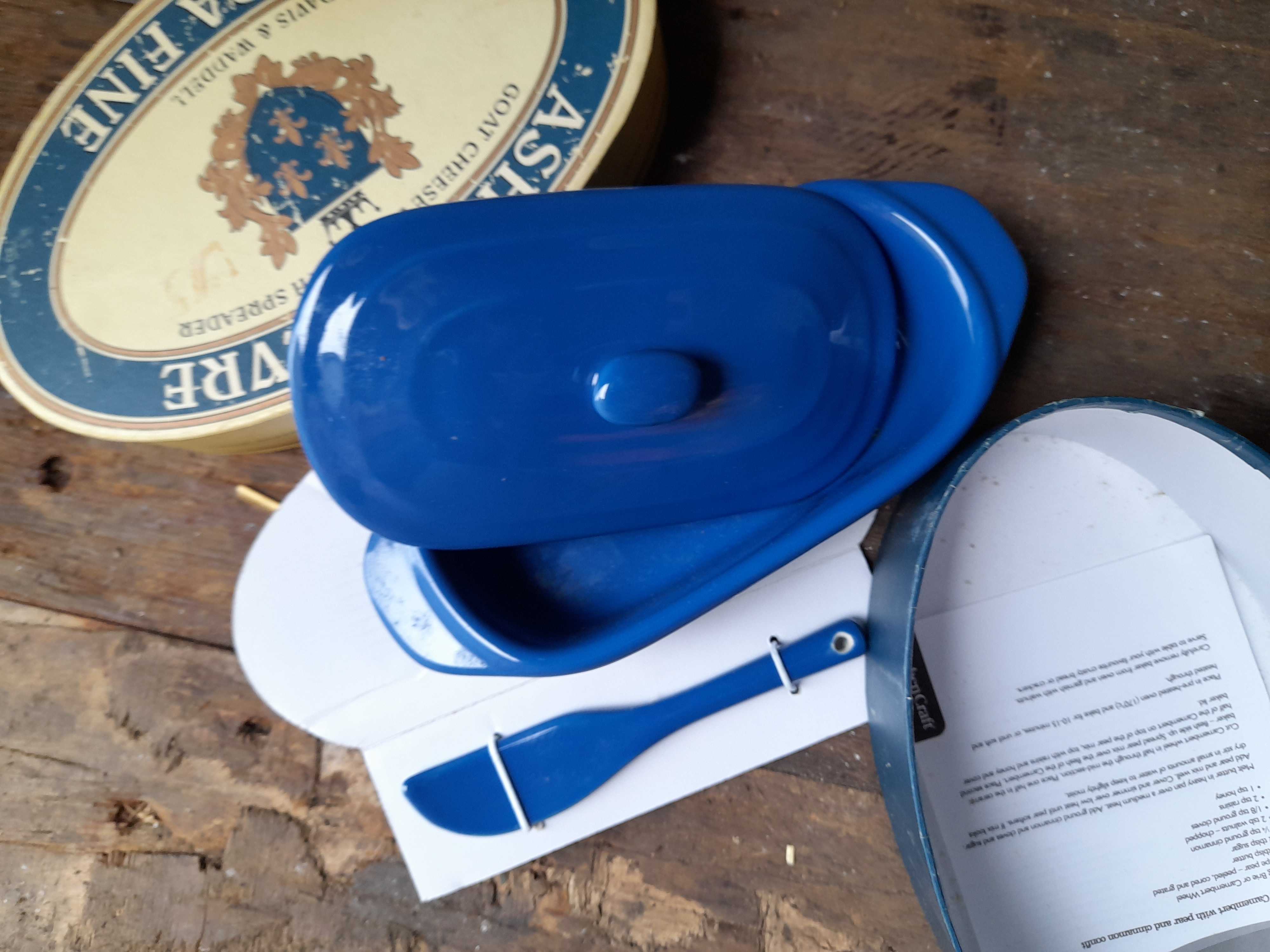 A blue ceramic goat cheese baker set including a matching spreader and original packaging branded Davis & Waddell and Kitchen Craft.