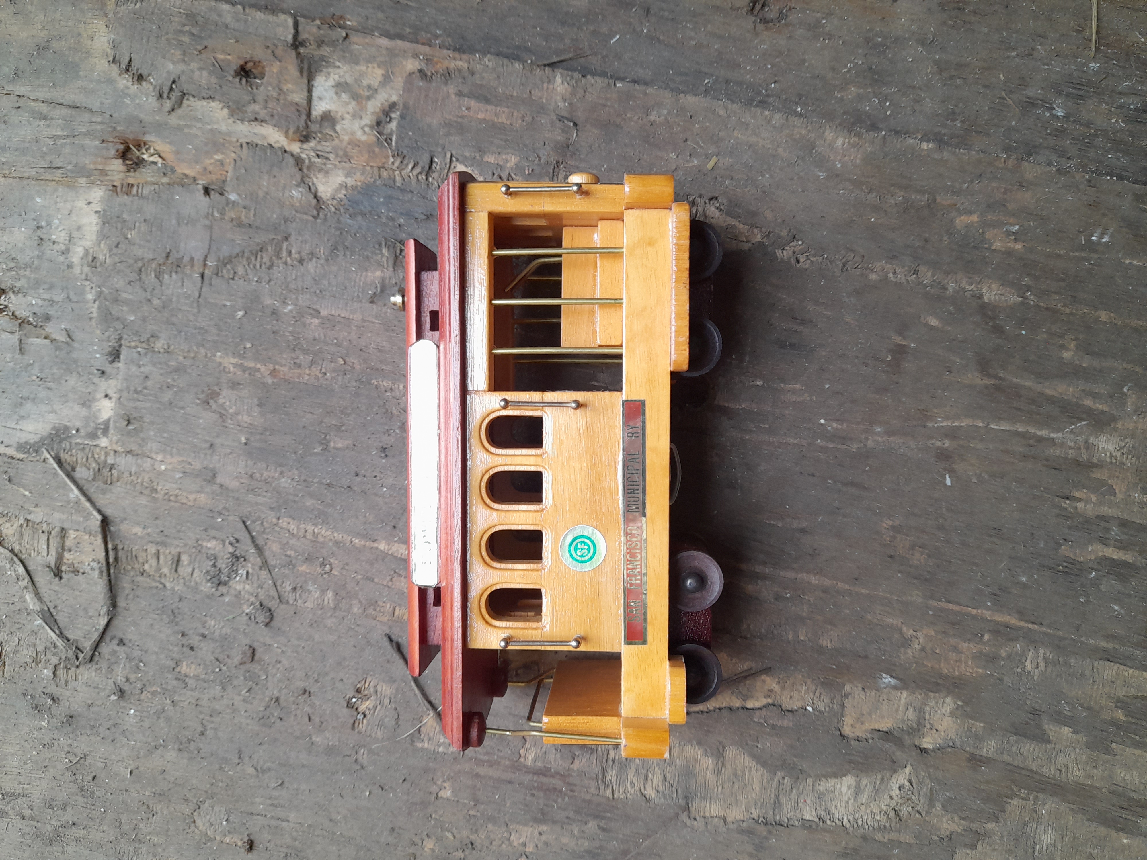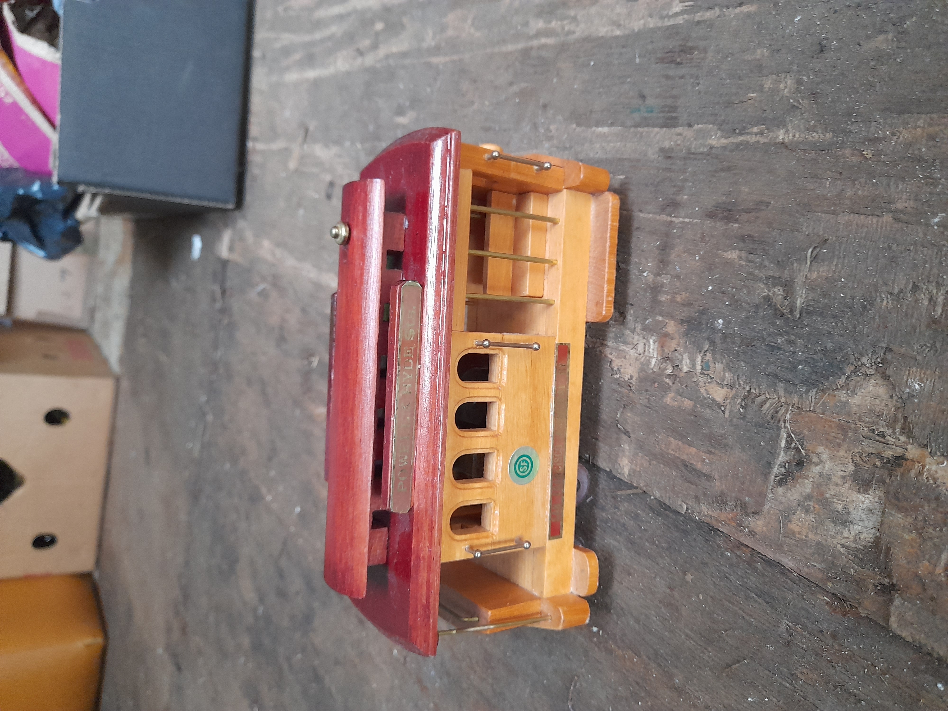 A wooden musical model of a San Francisco cable car finished in natural and maroon colours with Powell and Hyde Streets inscriptions.