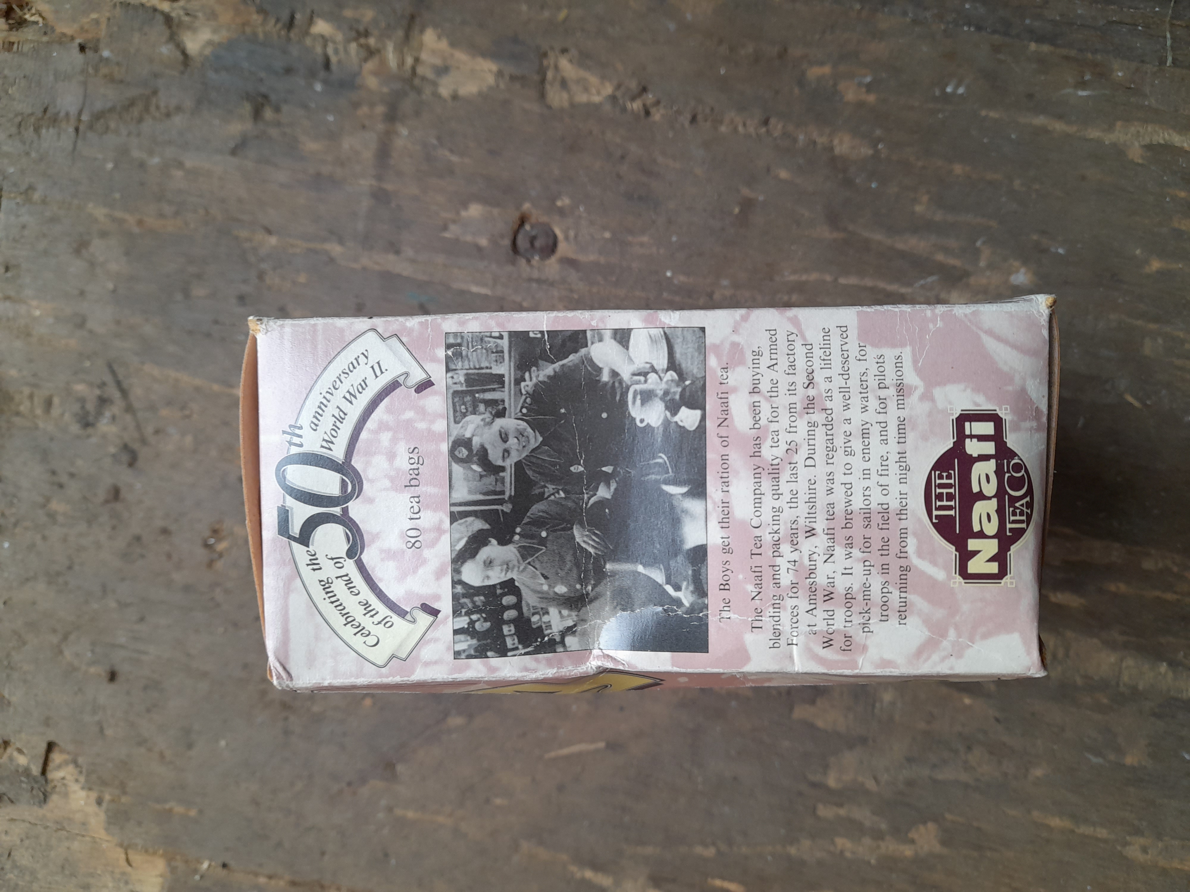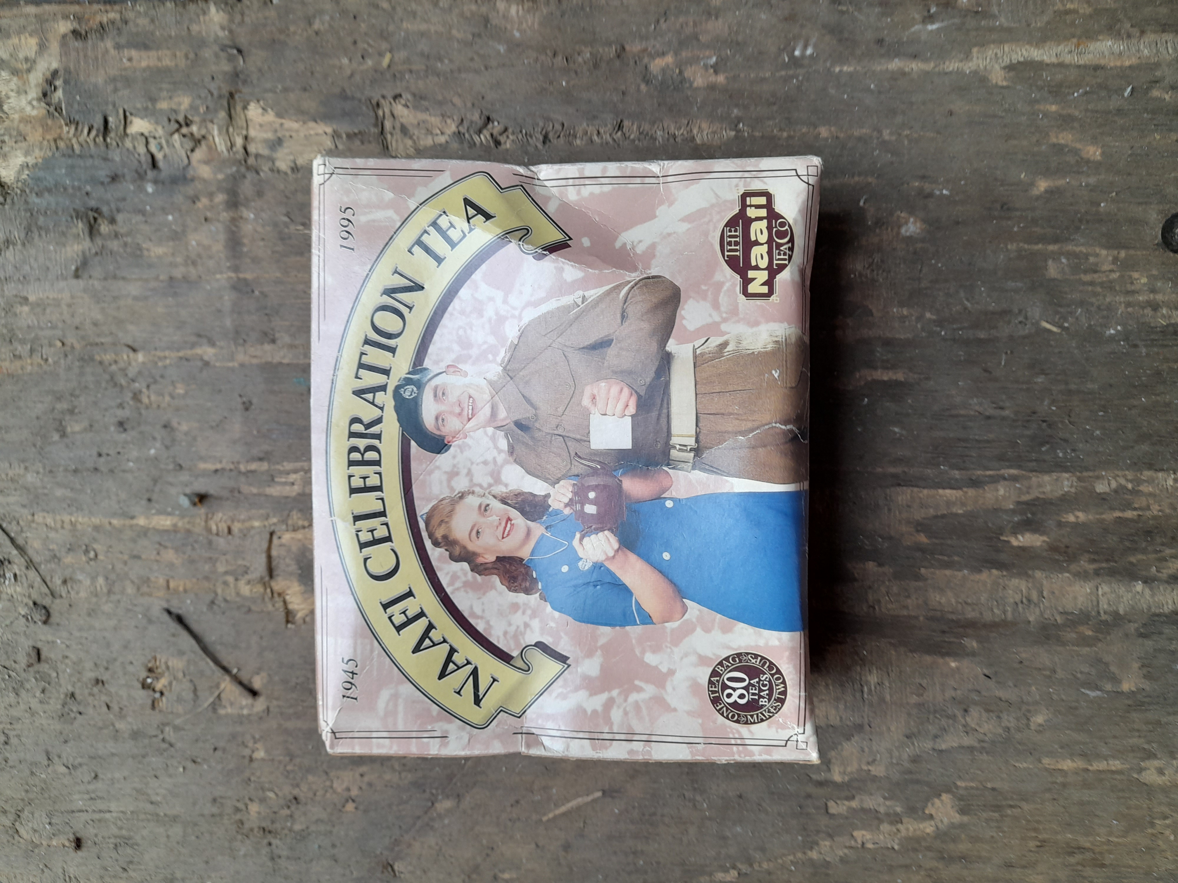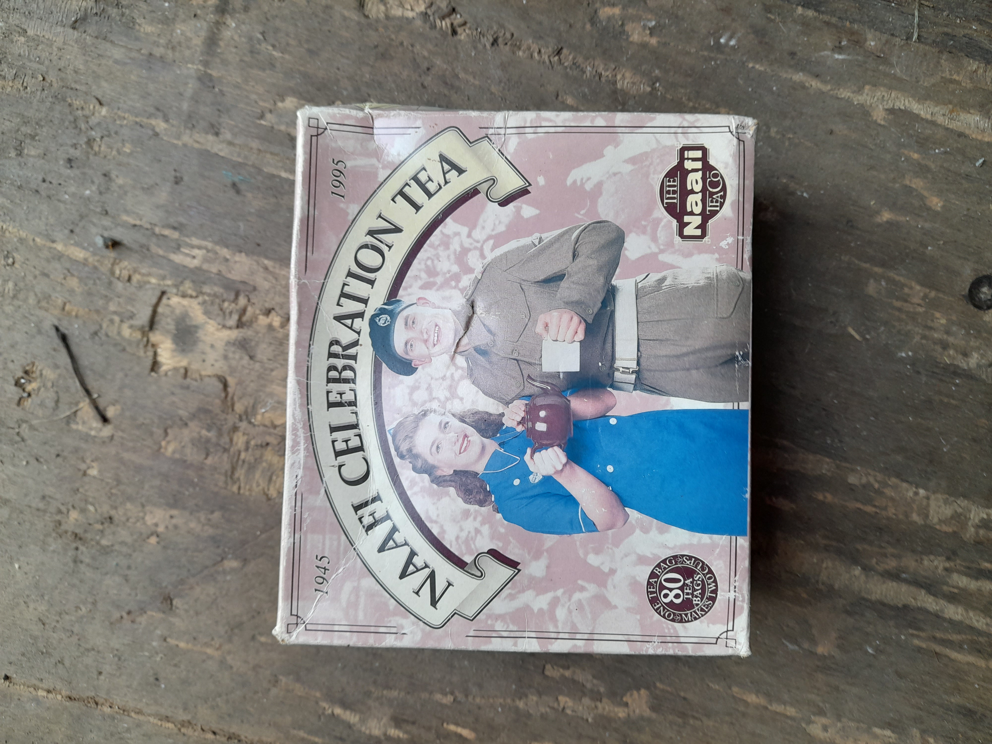 A pink and white cardboard box of NAAFI Celebration Tea containing 80 tea bags, commemorating the 50th anniversary of the end of World War II.