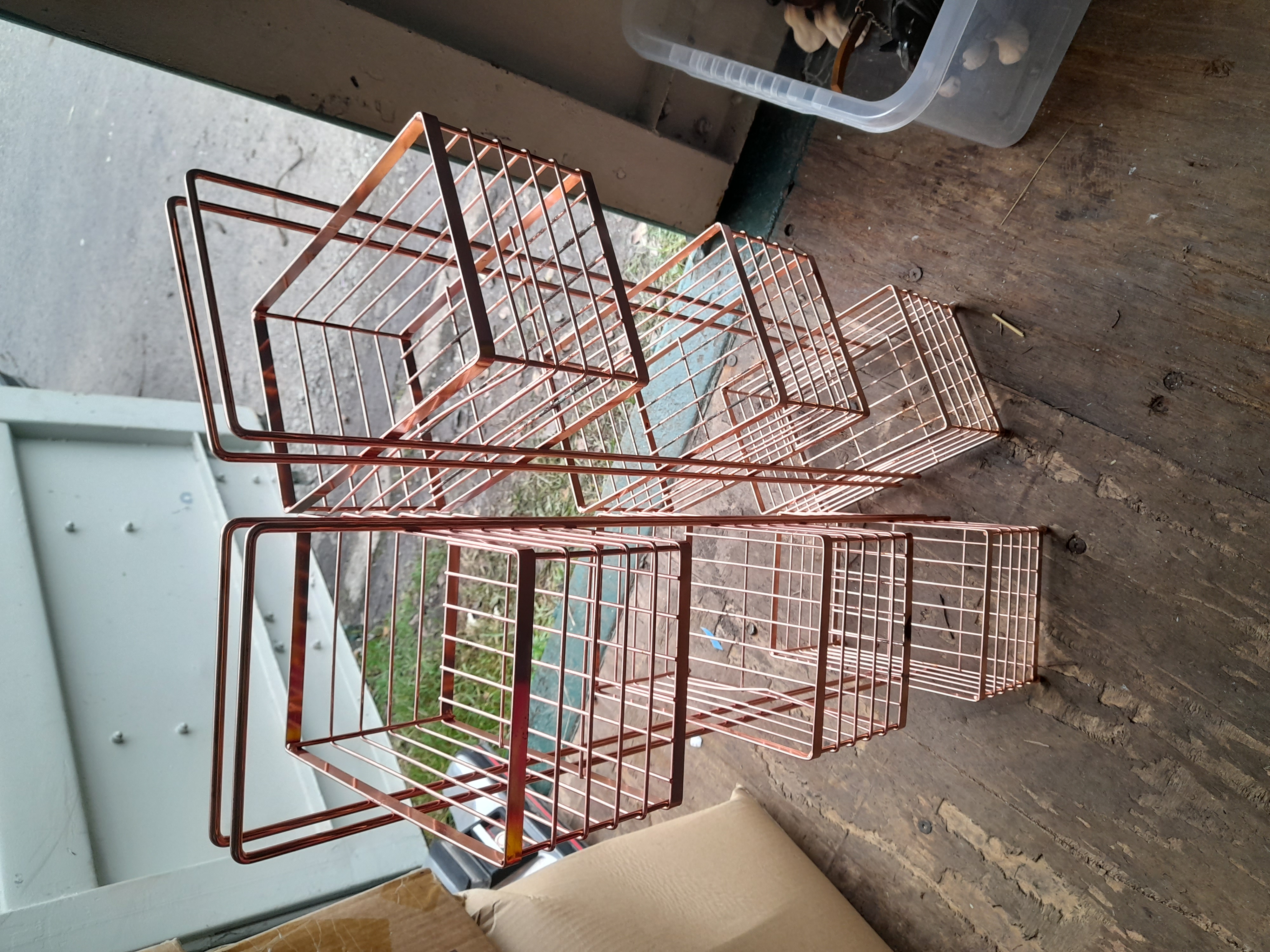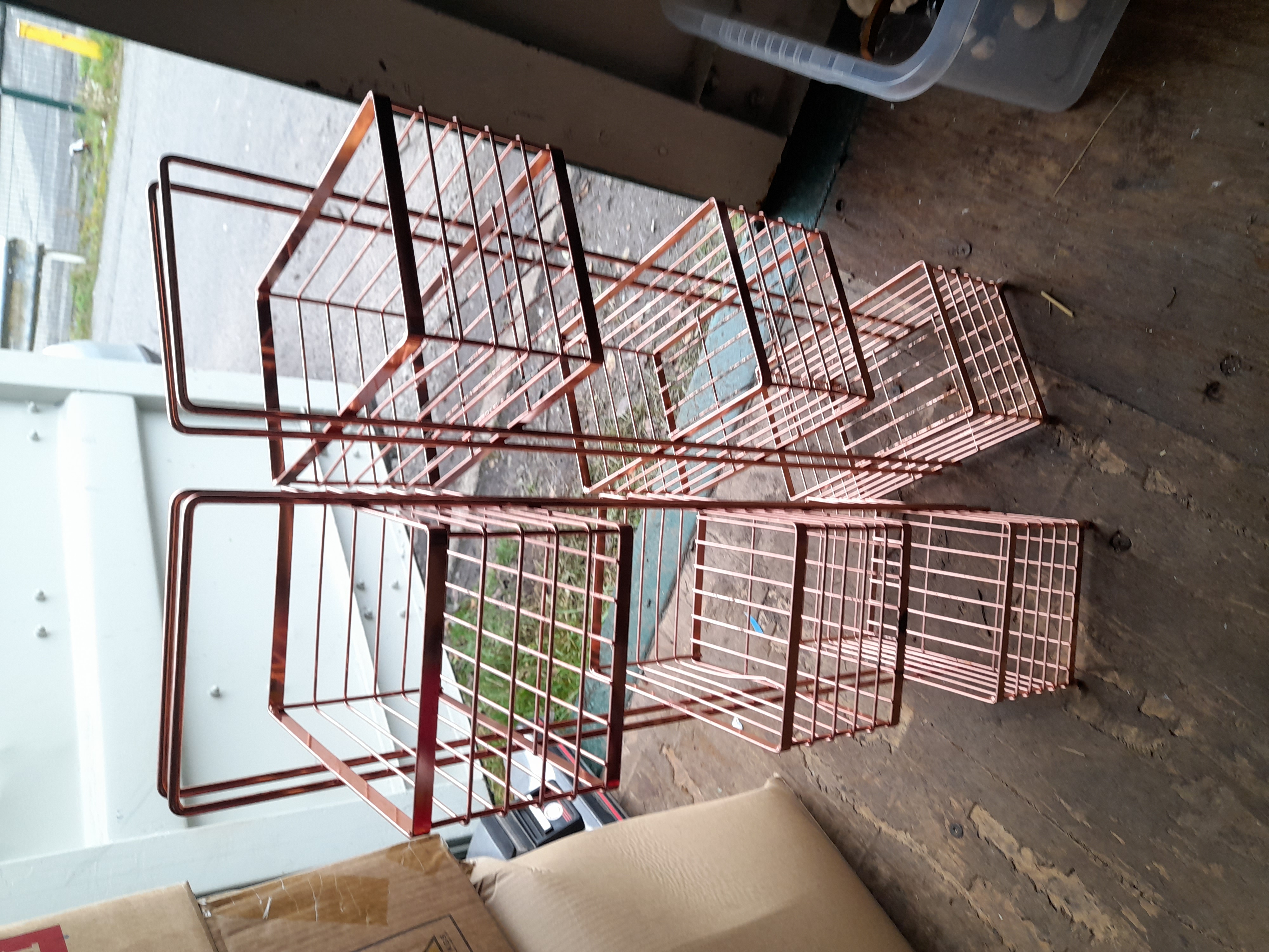 Two rose gold coloured metal wire-frame storage organisers featuring various tiers