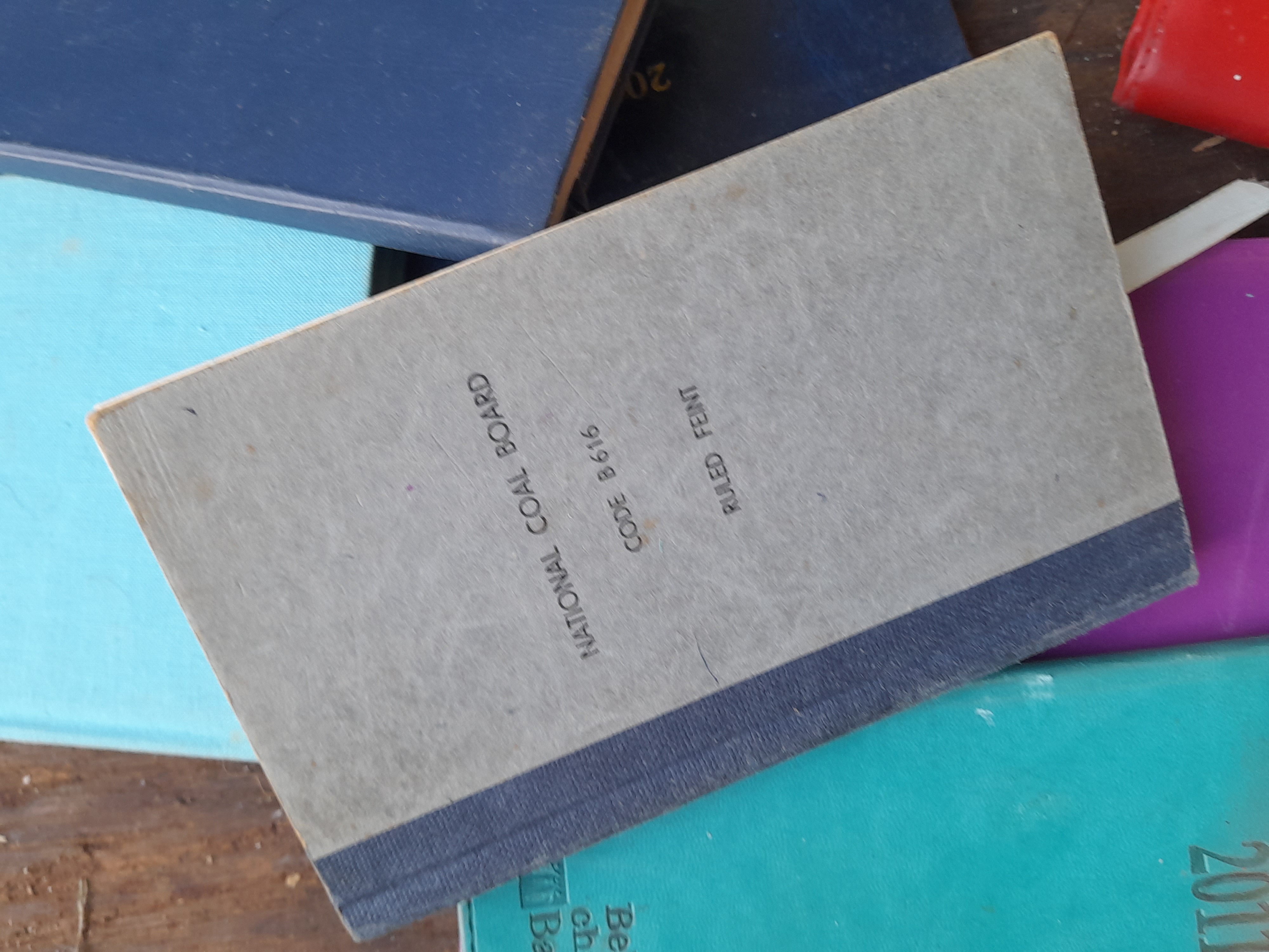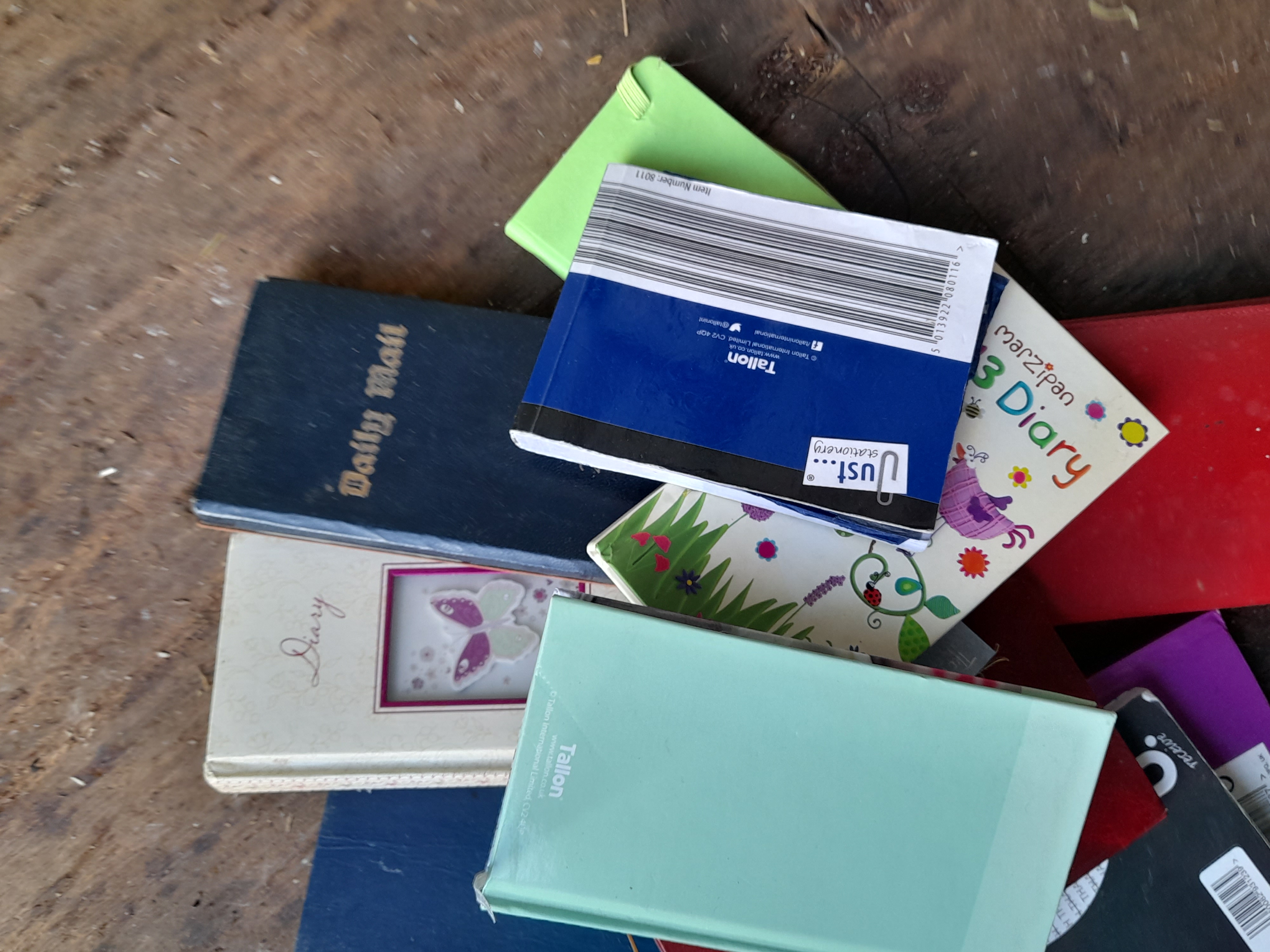 A collection of pocket-sized notebooks and diaries in various colours and styles, including examples from Tallon, Daily Mail, and the National Coal Board.